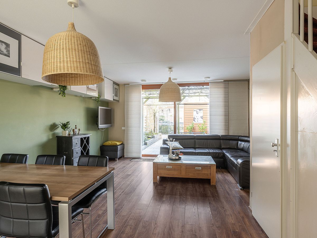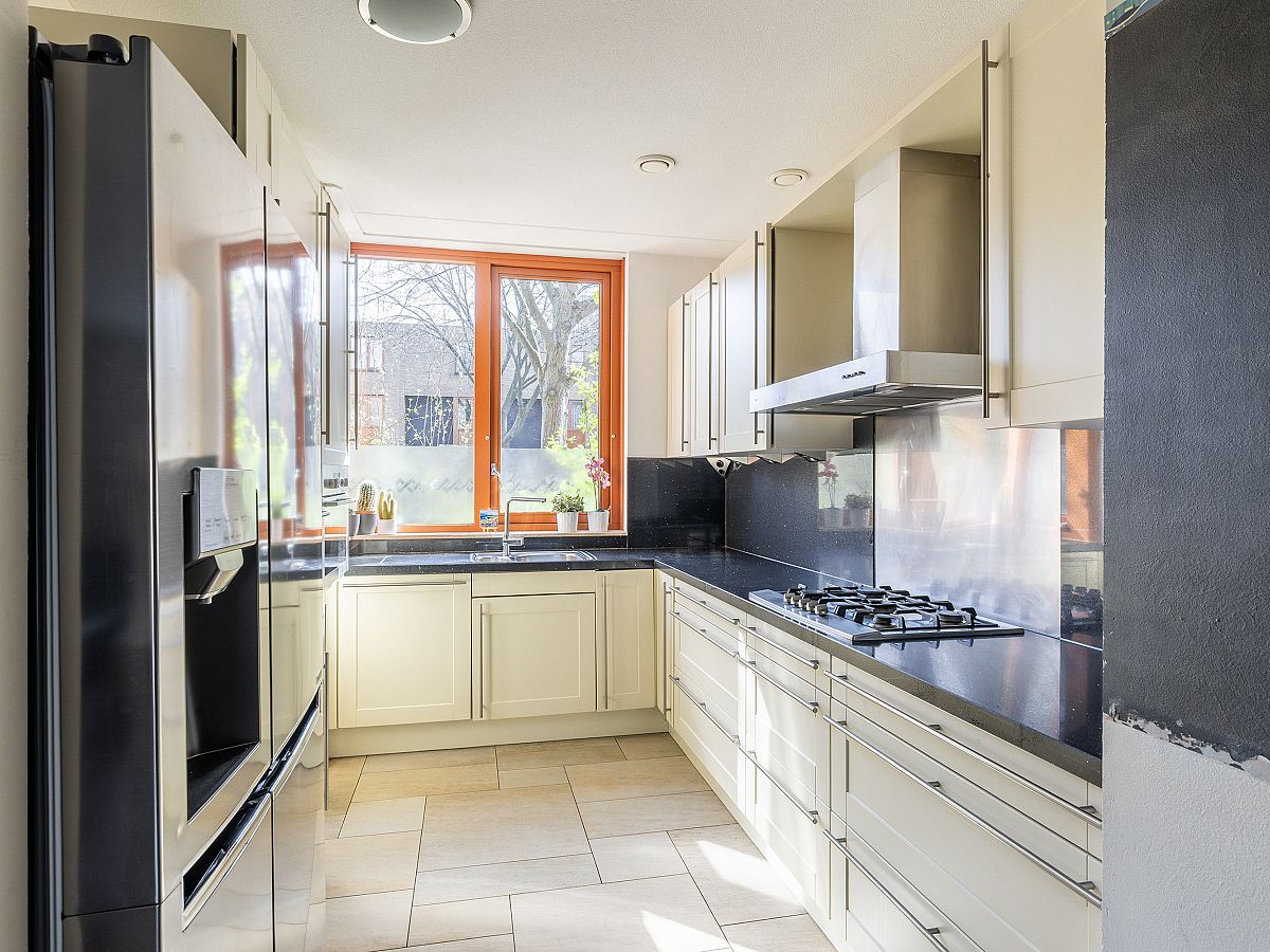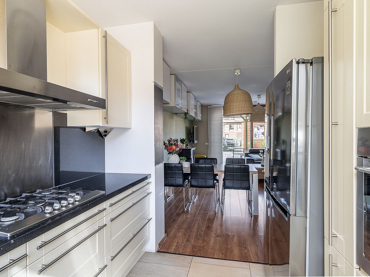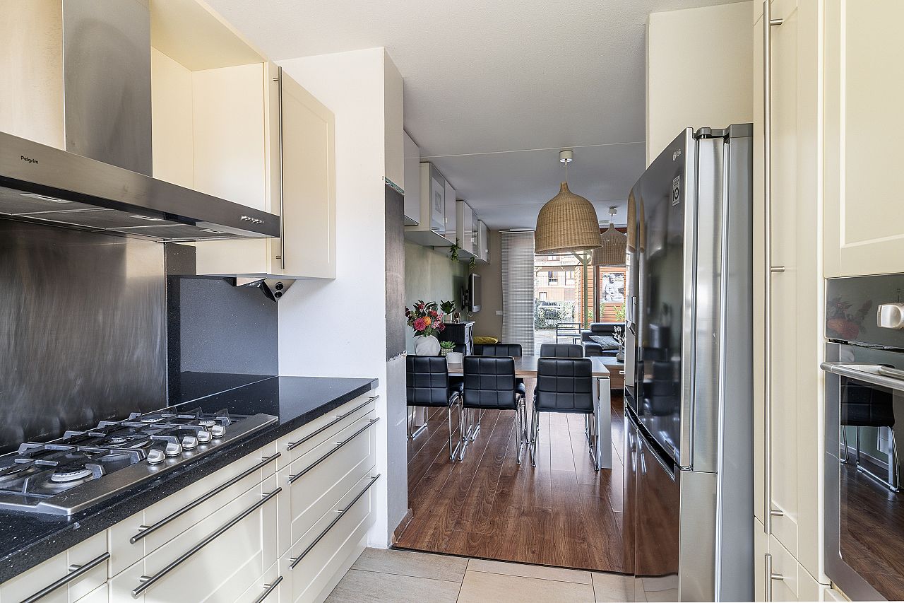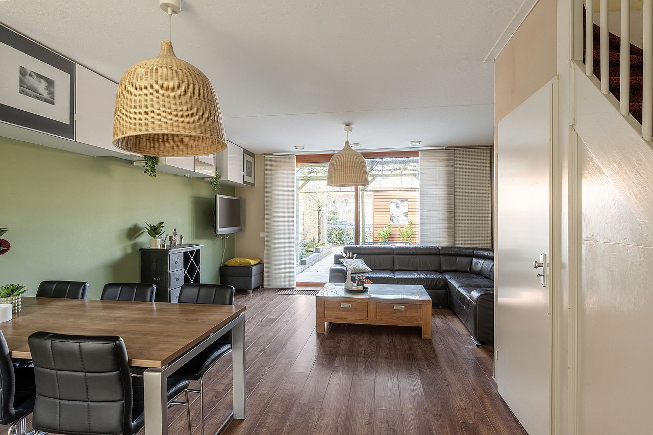 Ruime woonkamer met open keuken. De woonkamer is afgewerkt met spachtelputz wanden en geeft middels een schuifpui toegang tot de achtertuin. Er is een open trap aanwezig met hieronder een trapkast. De keuken is voorzien van een lichte frontinrichting en hardstenen aanrechtblad. Grotendeels ingericht met inbouwapparatuur, te weten: 5-pits gaskookplaat, vaatwasser, magnetron, oven, afzuigkap en losse koel-vriescombinatie.
