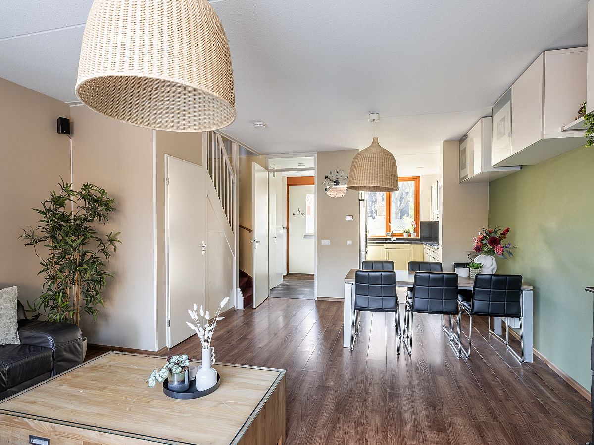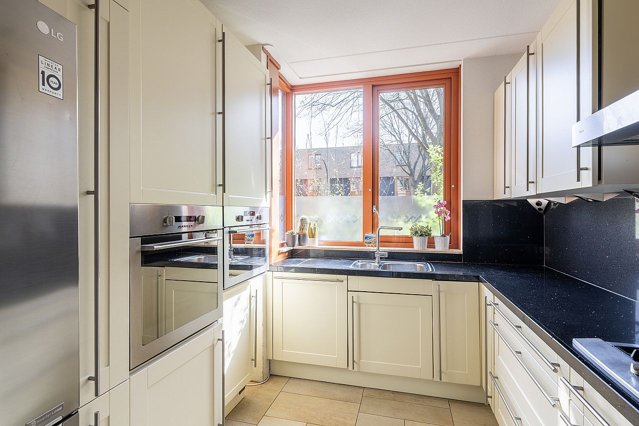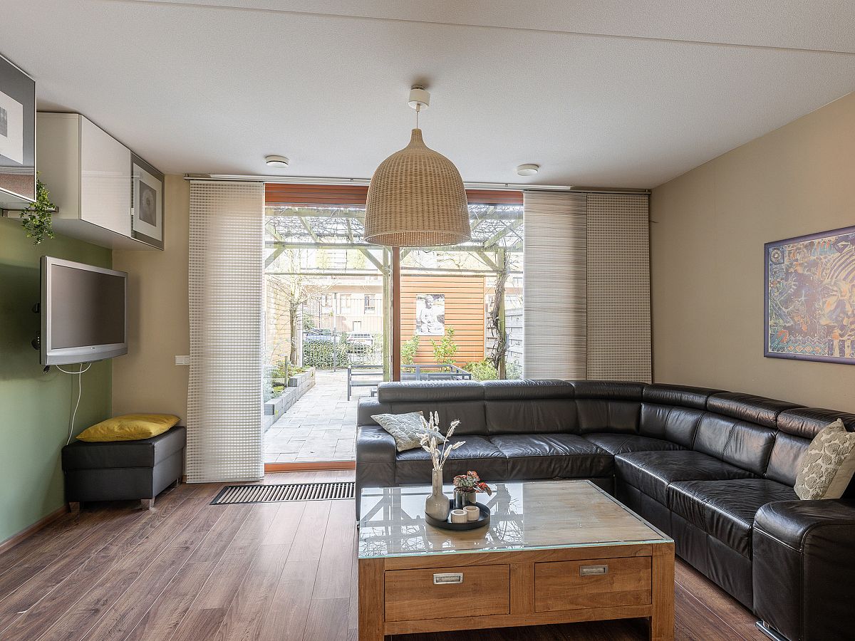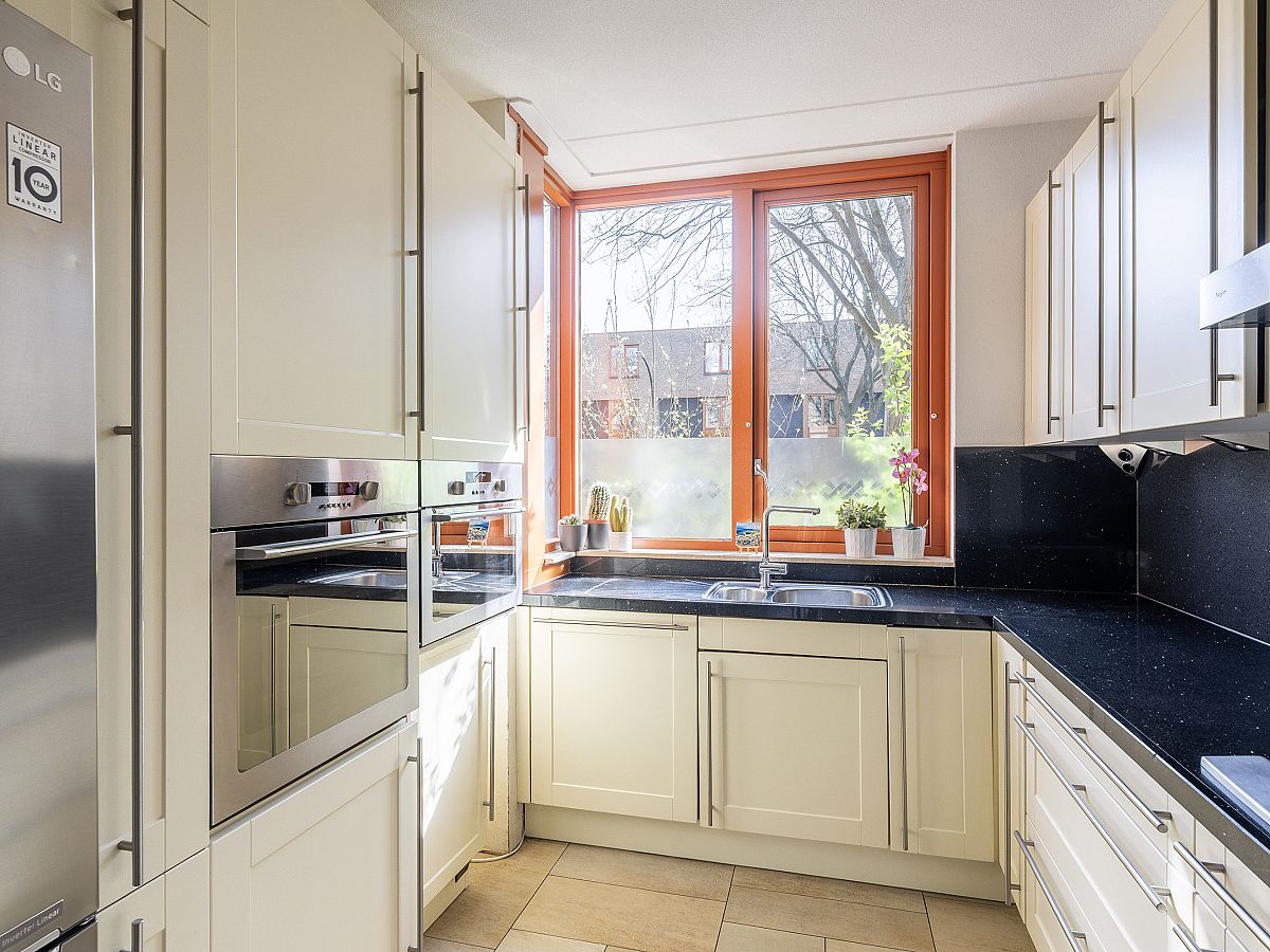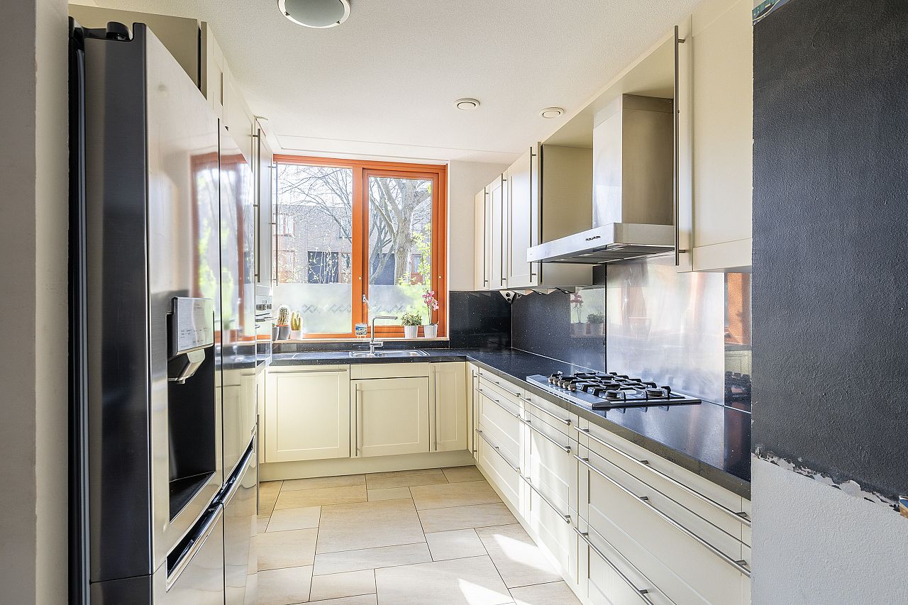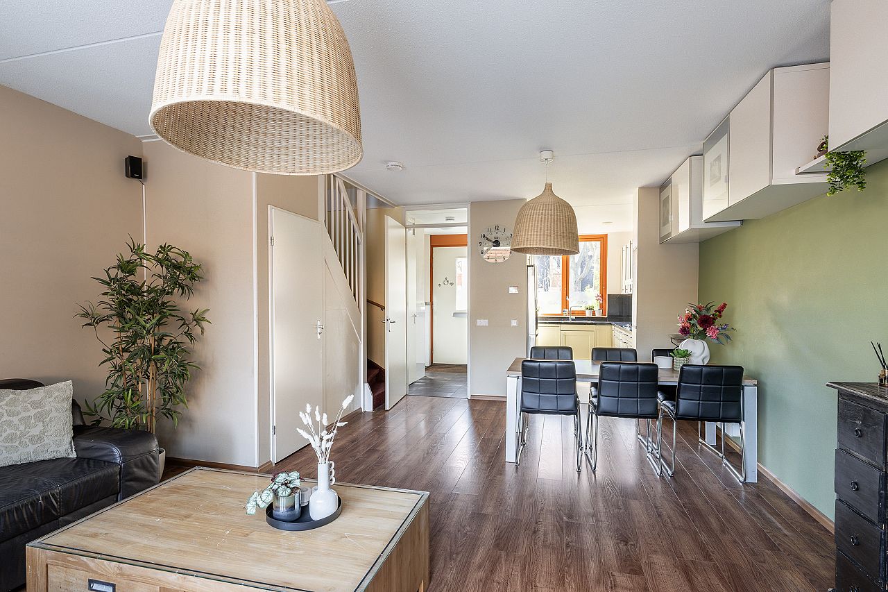 Ruime woonkamer met open keuken. De woonkamer is afgewerkt met spachtelputz wanden en geeft middels een schuifpui toegang tot de achtertuin. Er is een open trap aanwezig met hieronder een trapkast. De keuken is voorzien van een lichte frontinrichting en hardstenen aanrechtblad. Grotendeels ingericht met inbouwapparatuur, te weten: 5-pits gaskookplaat, vaatwasser, magnetron, oven, afzuigkap en losse koel-vriescombinatie.