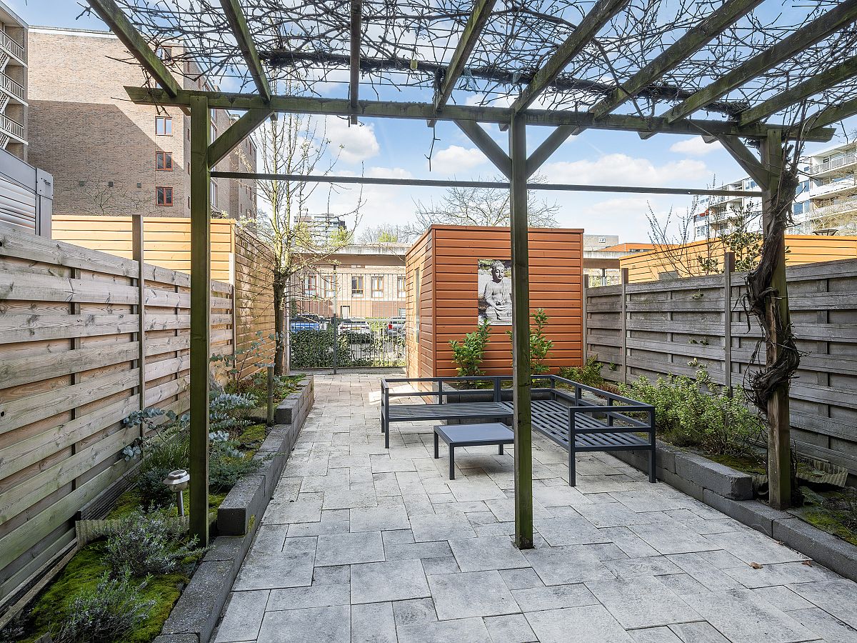 Riante achtertuin gelegen op het zonnige westen. De tuin is fraai aangelegd en er is een houtenberging en achterom aanwezig.