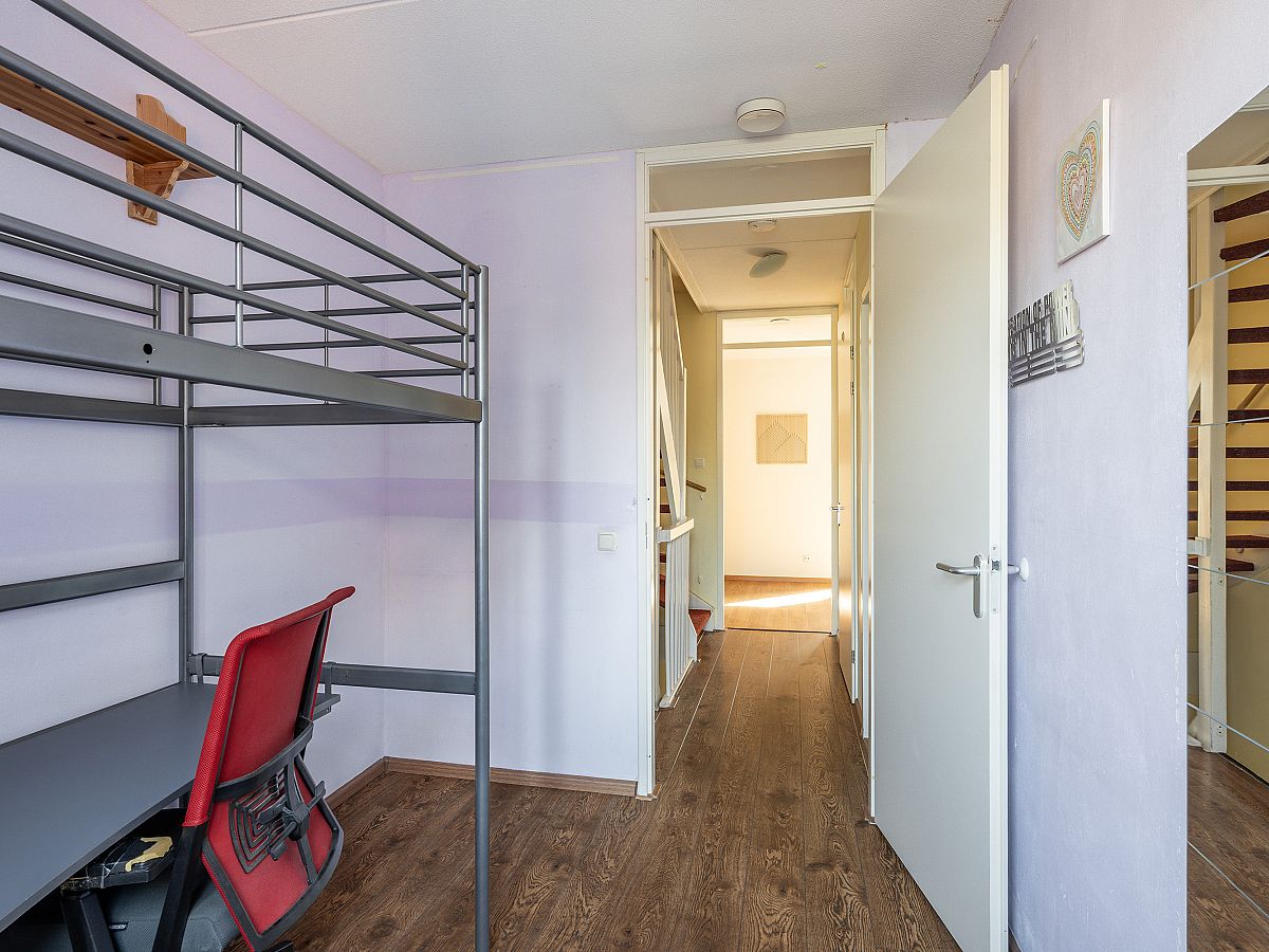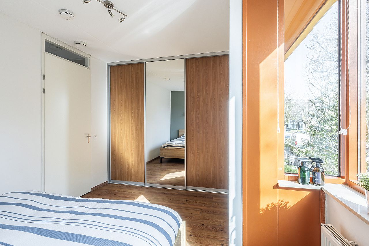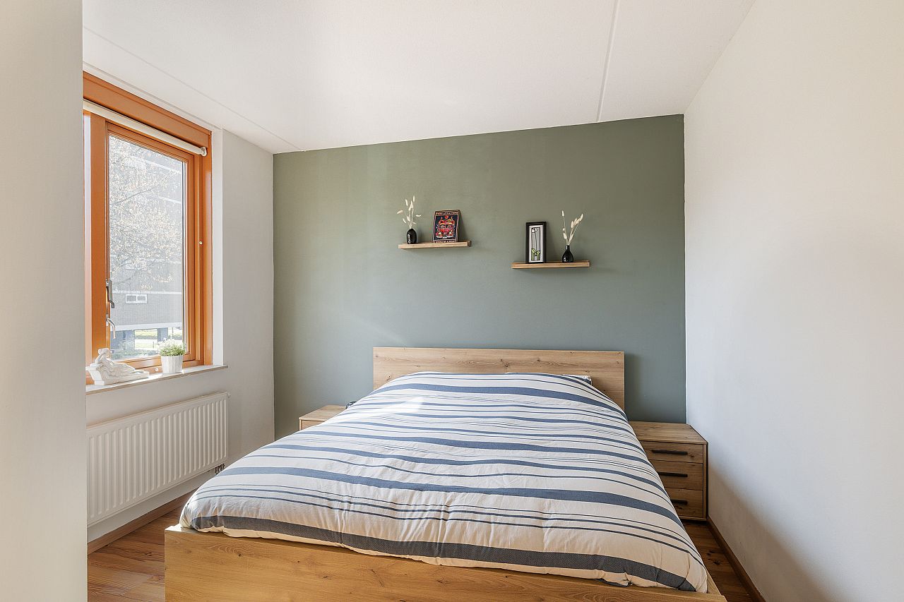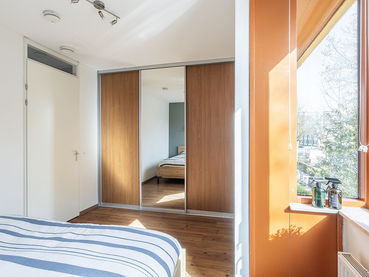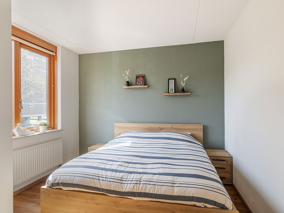 Ruime overloop met openslaande deuren naar het dakterras van ca. 15 m². Berging voorzien van wasmachineaansluiting, mechanische ventilatie en CV ketel Remeha 2024. Ruime trapkast. Slaapkamer, gehele verdieping is voorzien van laminaatvloer.
