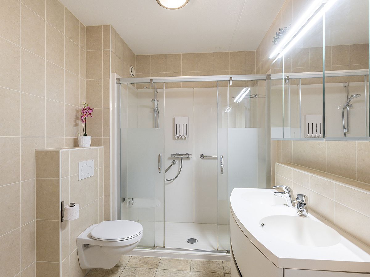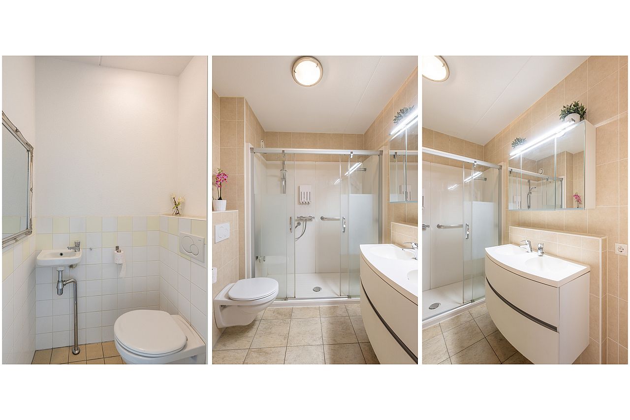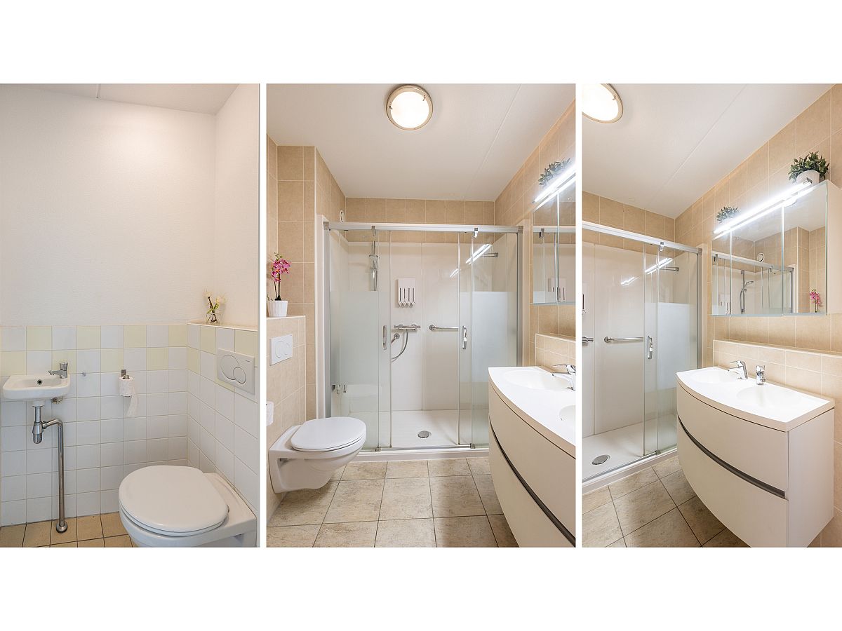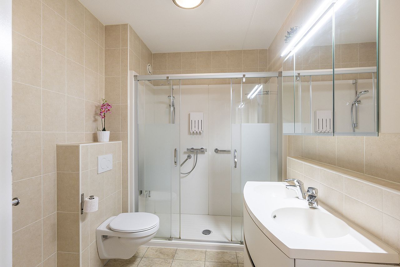 Overloop, ruime badkamer voorzien van een inloopdouche, 2e toilet en een wastafelmeubel met lichte kleuren.
