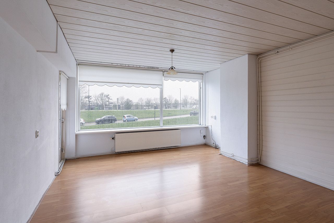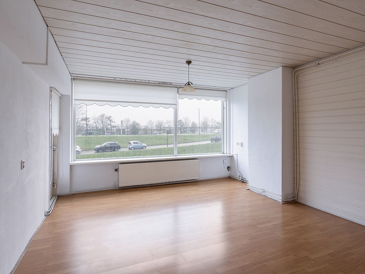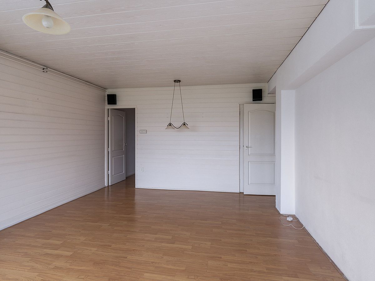 Woonkamer met laminaatvloer, vaste kast, kunststof kozijnen en dubbele beglazing. De deur naar het balkon is van hout en heeft enkele beglazing.