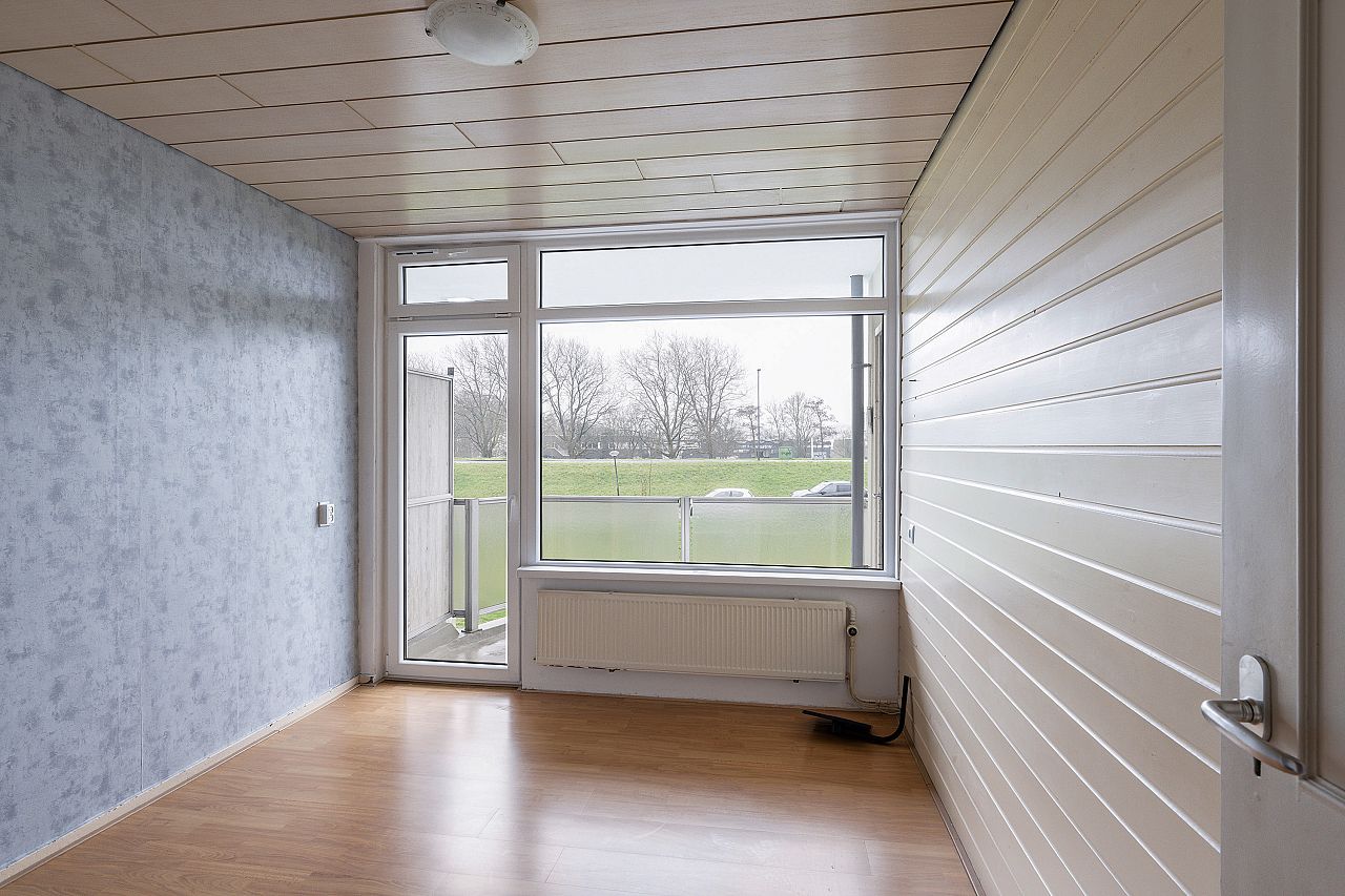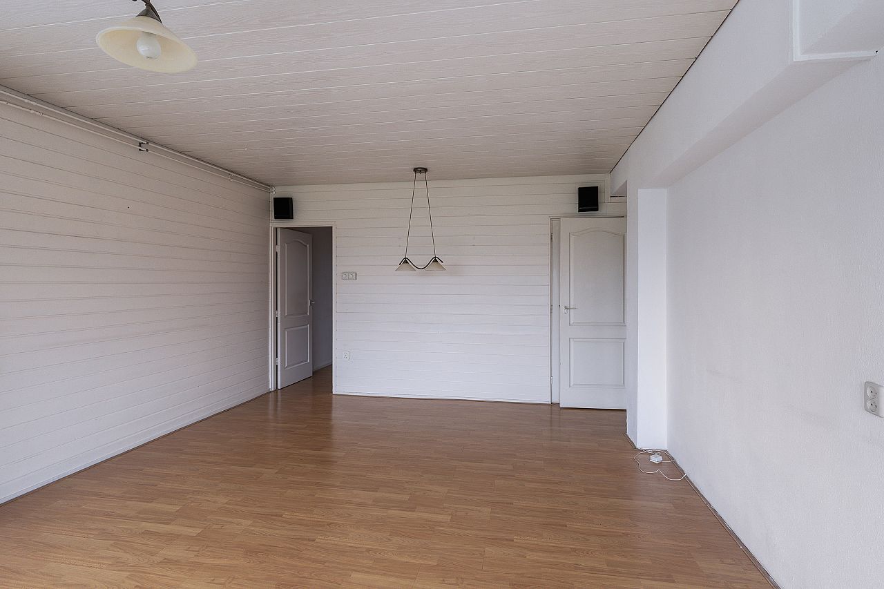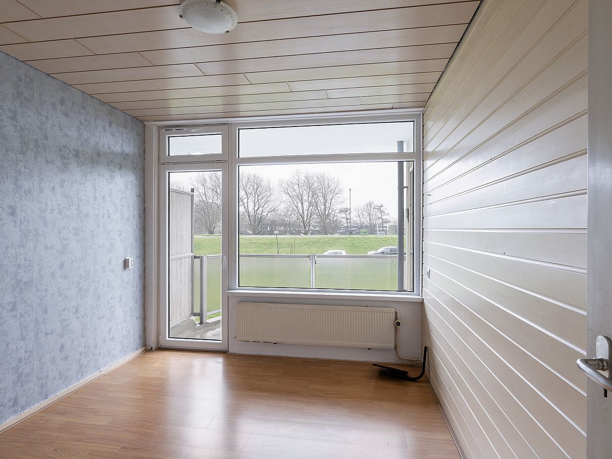 Woonkamer met laminaatvloer, vaste kast, kunststof kozijnen en dubbele beglazing. De deur naar het balkon is van hout en heeft enkele beglazing.