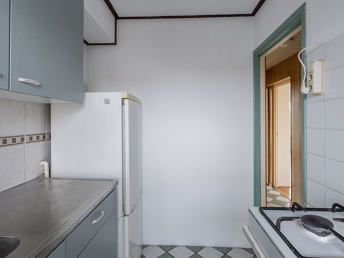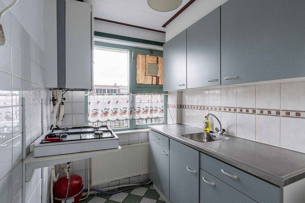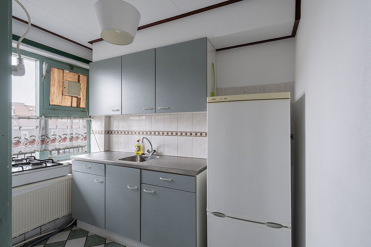 Dichte keuken met eenvoudige inrichting met tegelvloer en plaatsing CV ketel. De keuken heeft een houten kozijn en enkele beglazing.