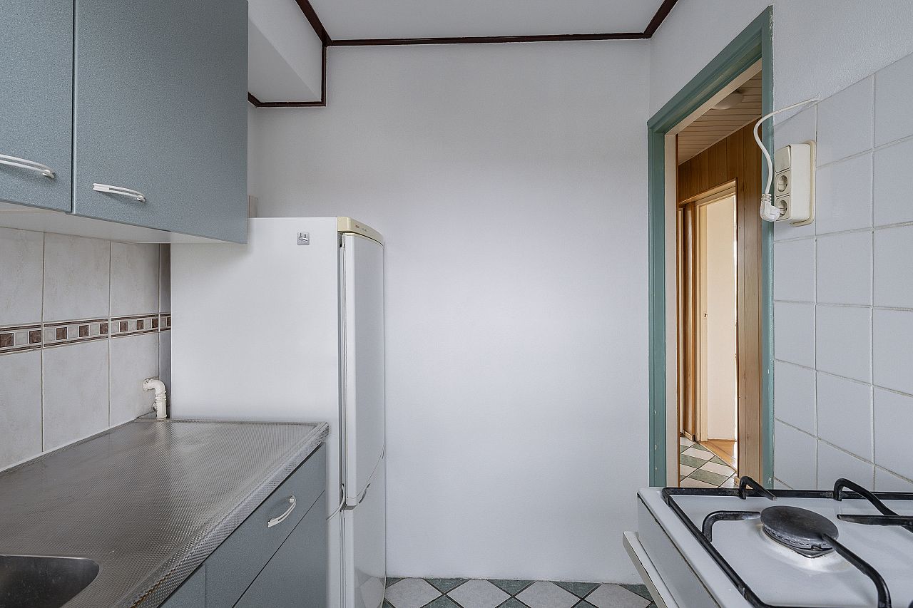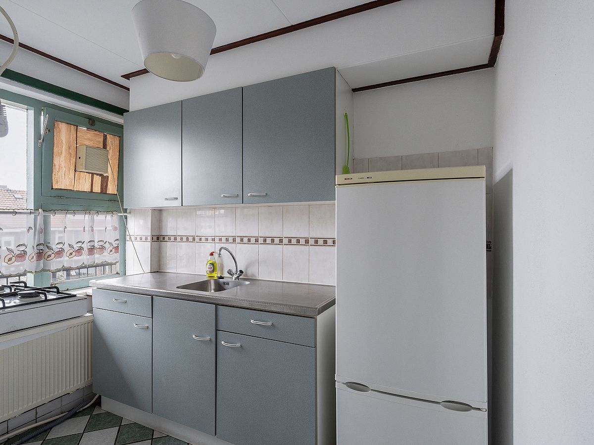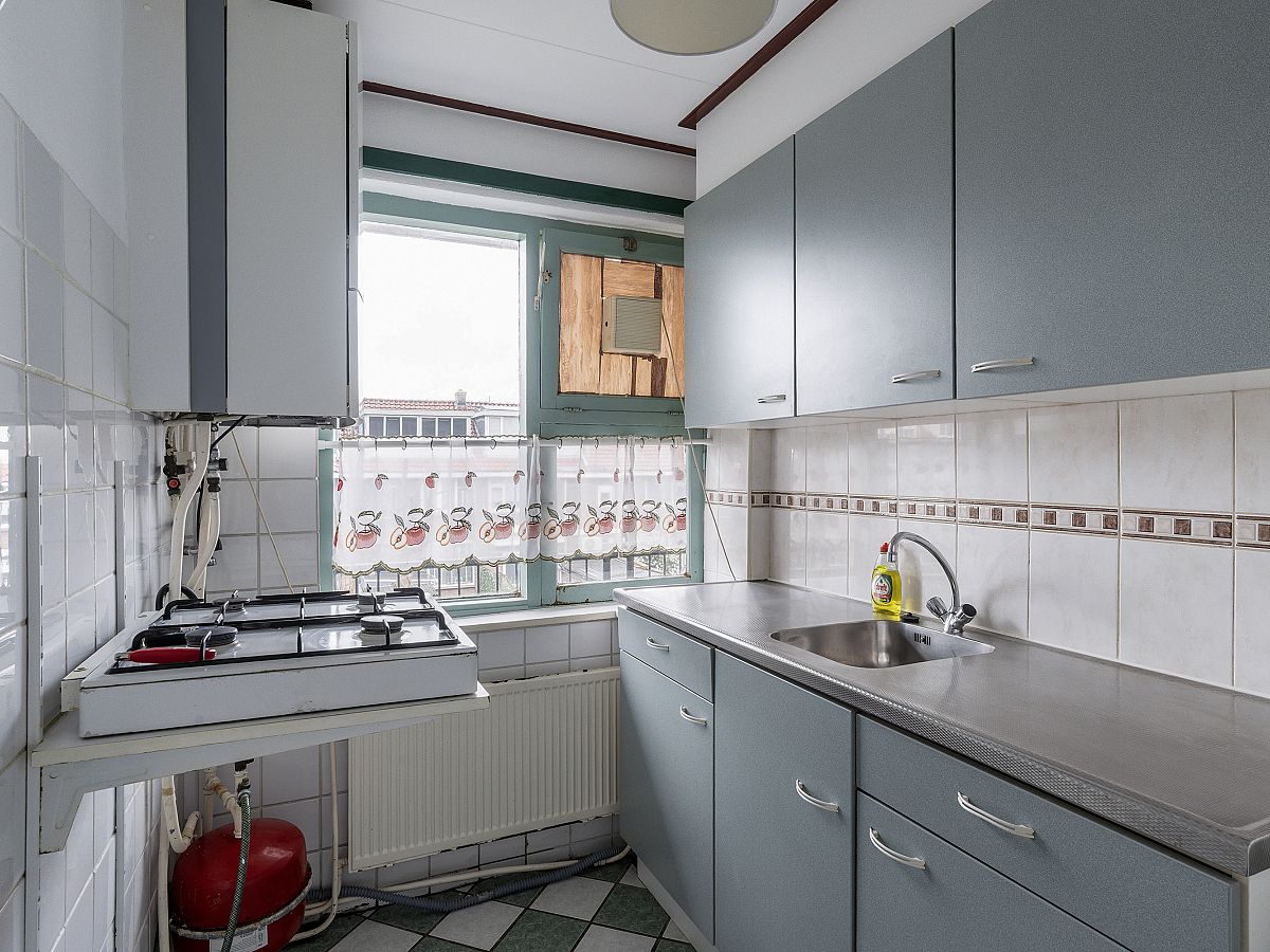 Dichte keuken met eenvoudige inrichting met tegelvloer en plaatsing CV ketel. De keuken heeft een houten kozijn en enkele beglazing.