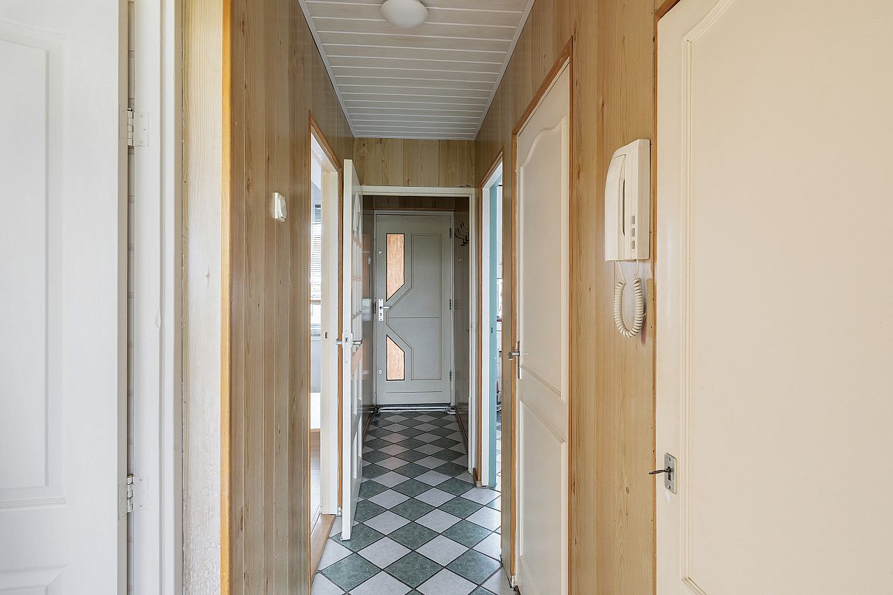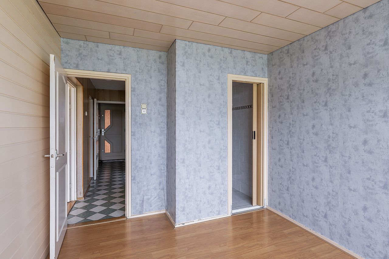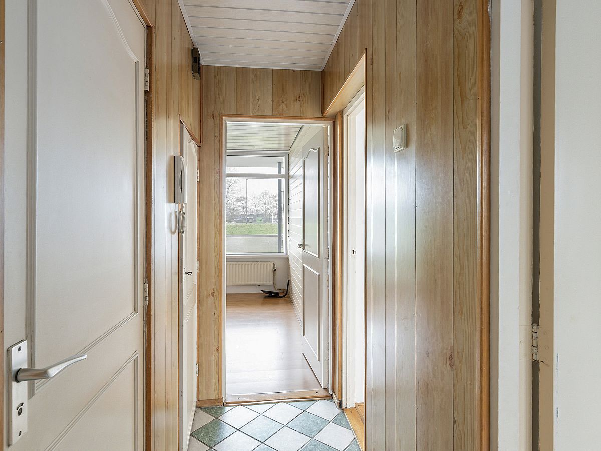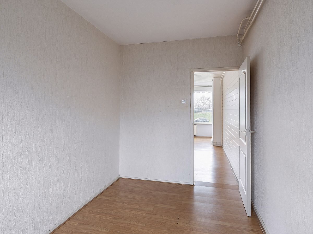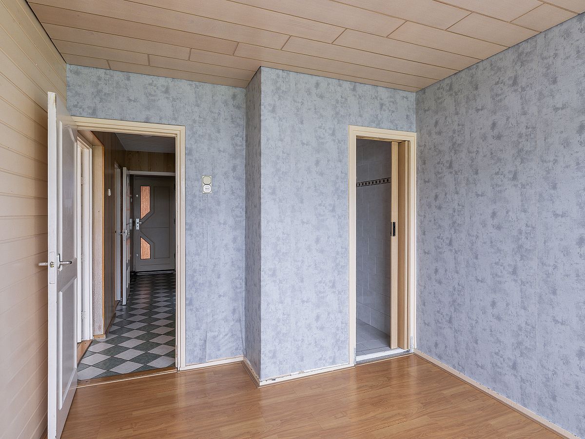 Entree/ tochtportaal; slaapkamer aan galerijzijde voorzien van nieuwe kunststof kozijnen, vaste kast en laminaatvloer.