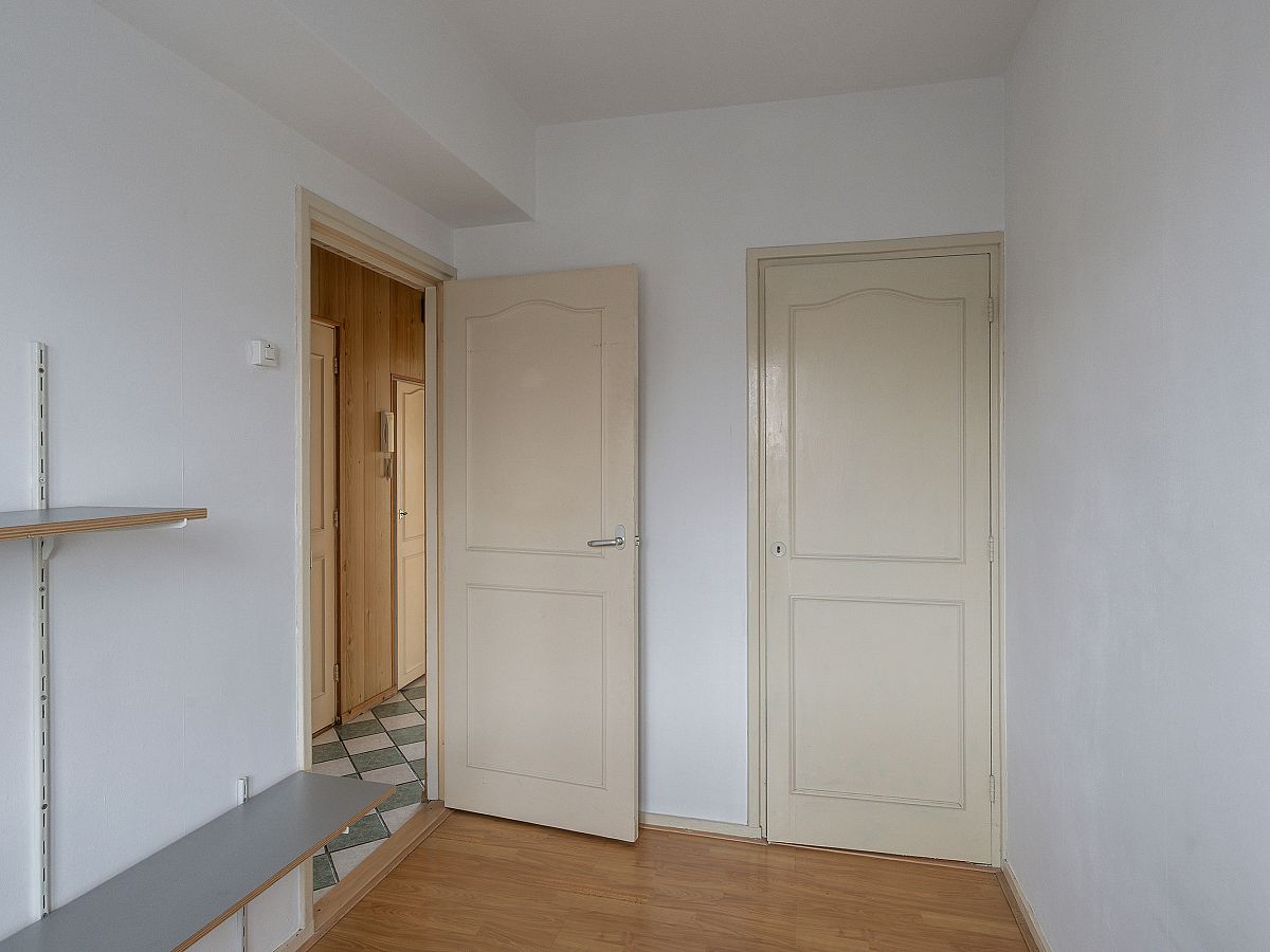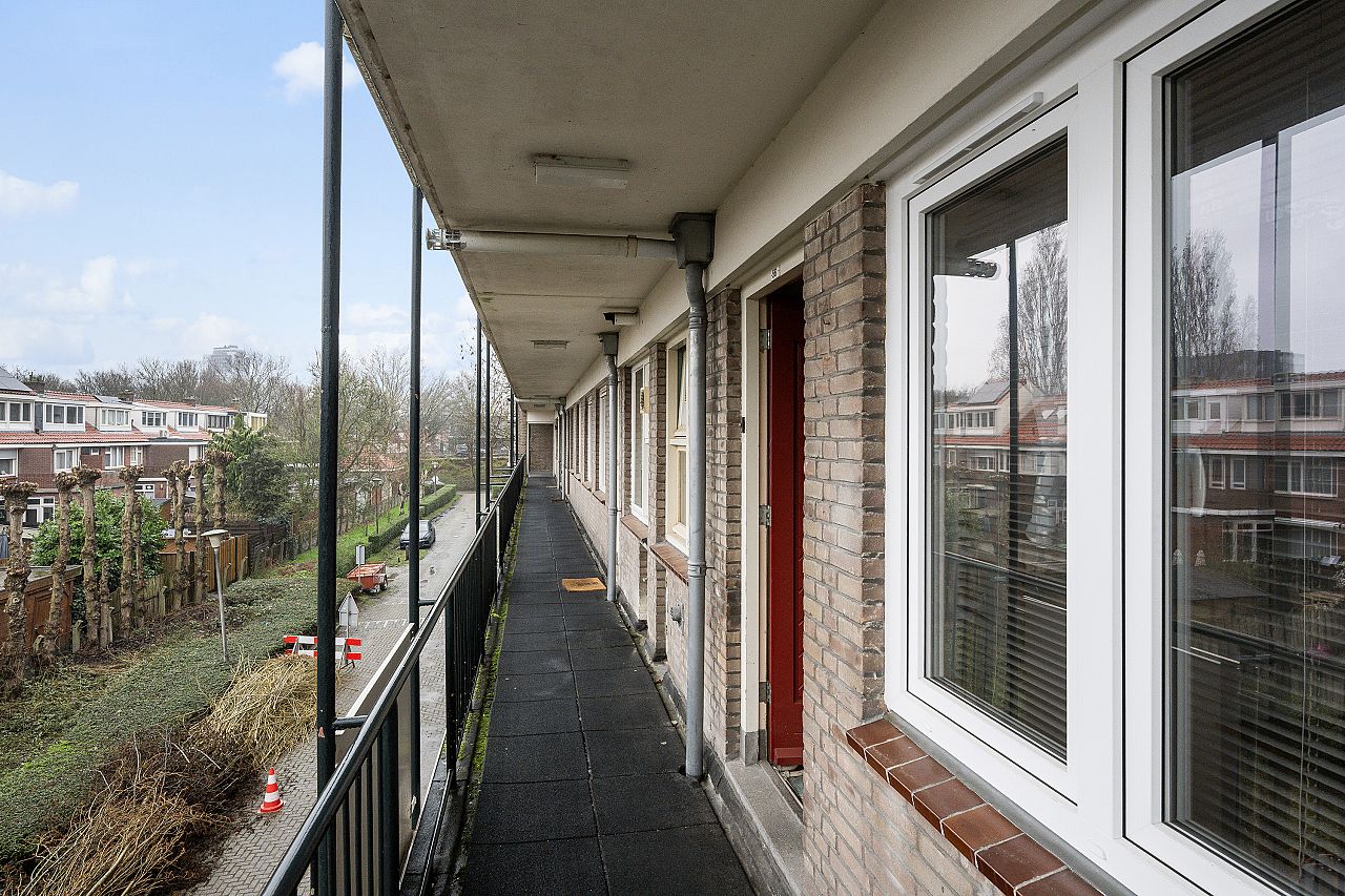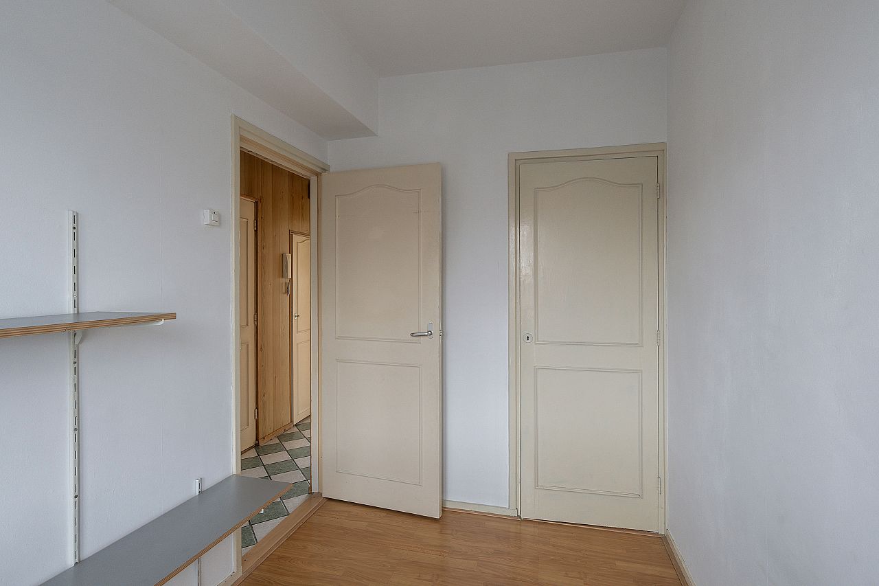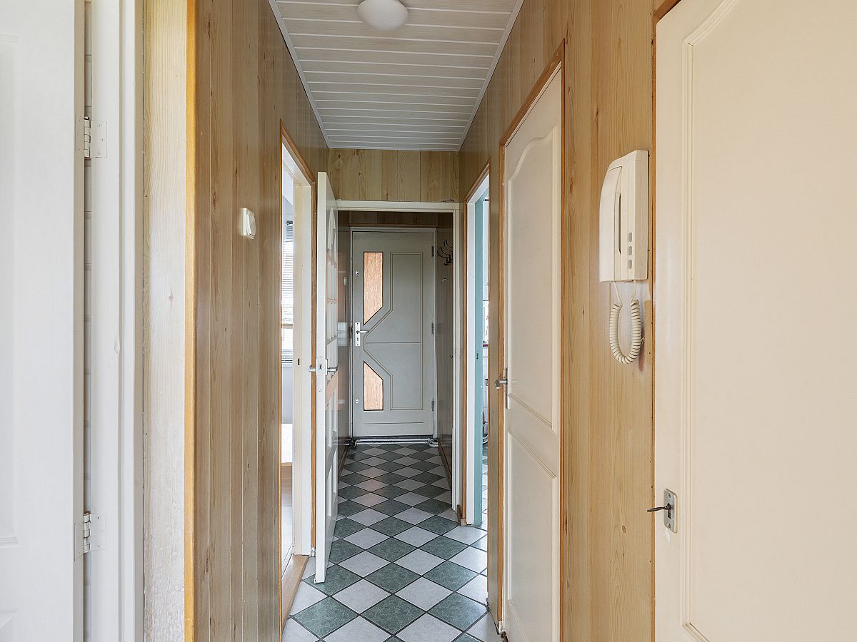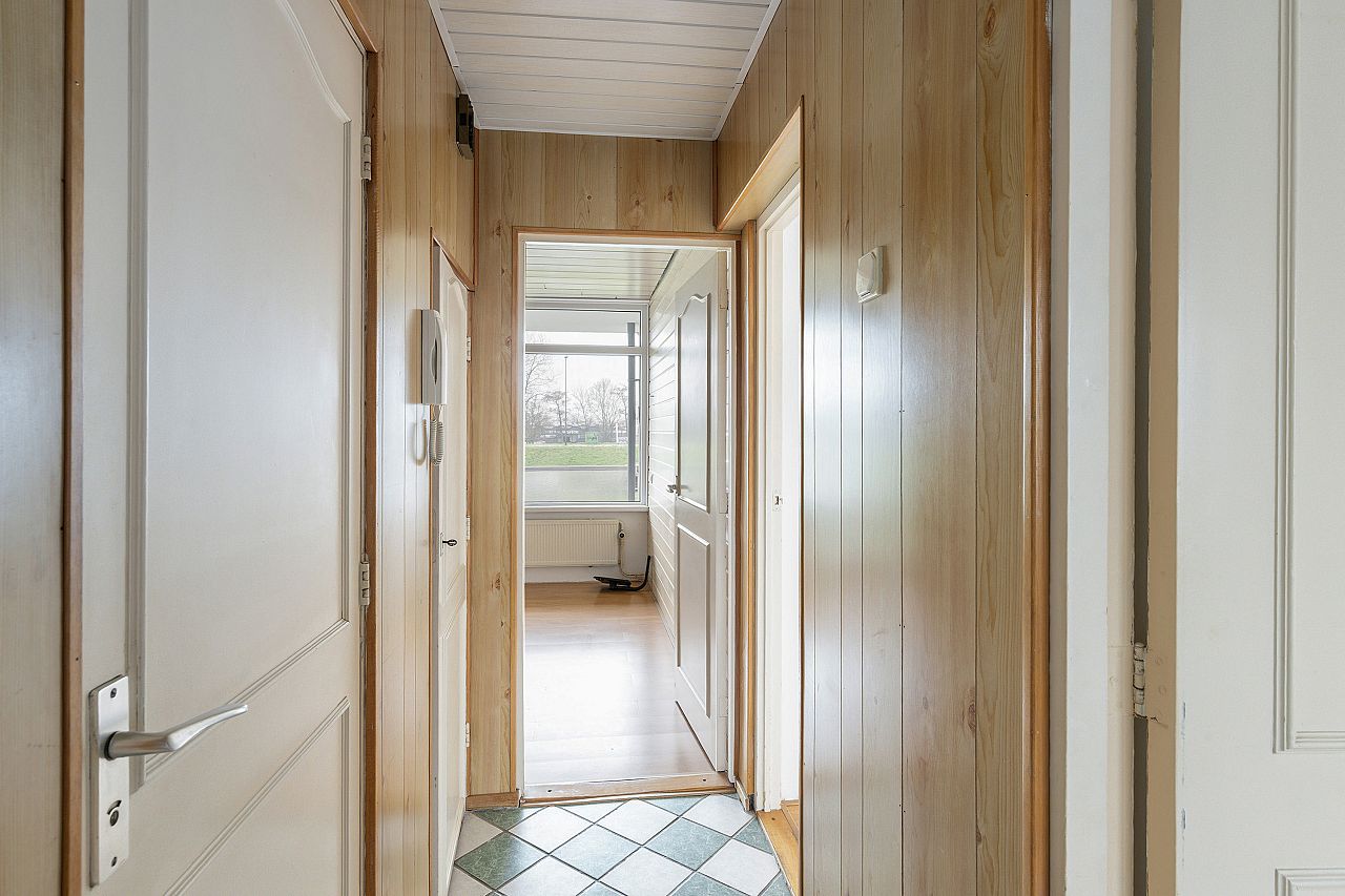 Entree/ tochtportaal; slaapkamer aan galerijzijde voorzien van nieuwe kunststof kozijnen, vaste kast en laminaatvloer.
