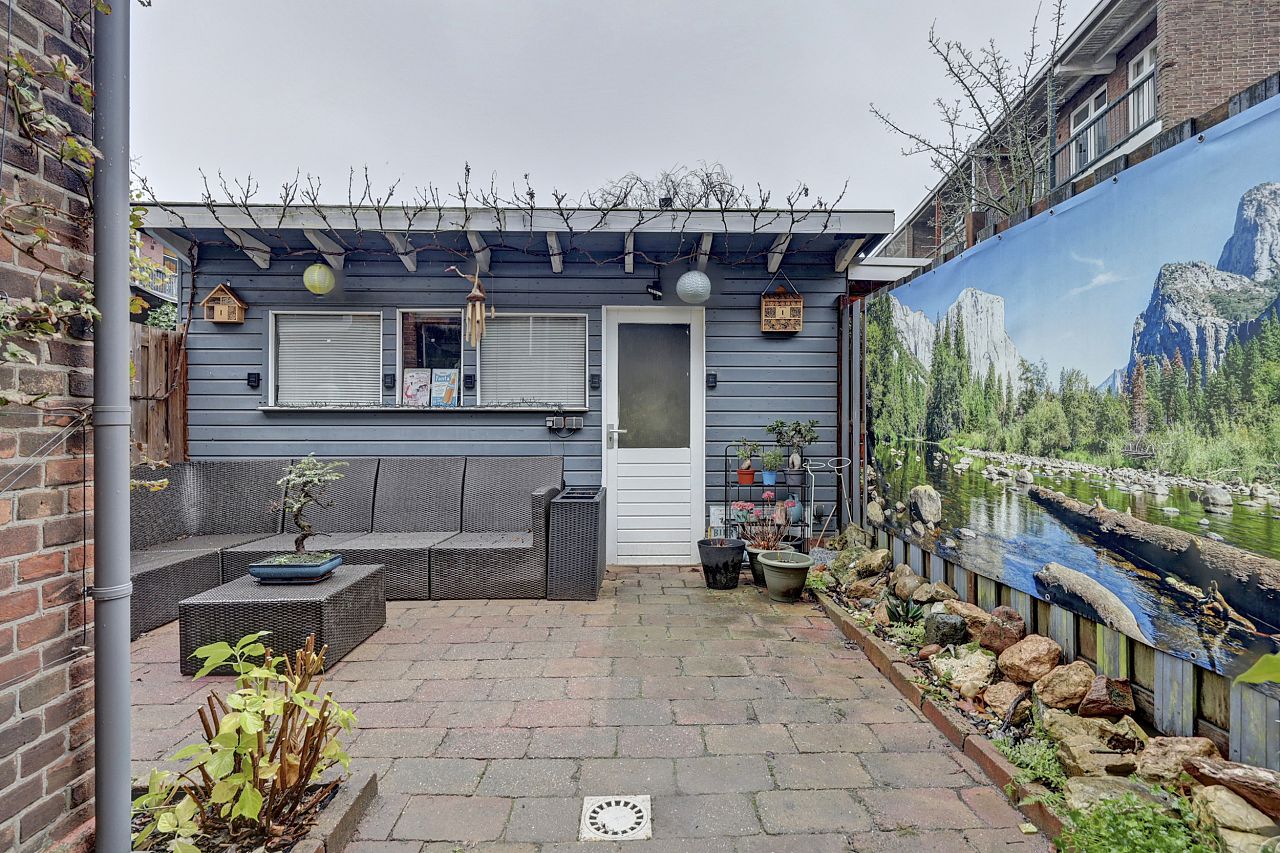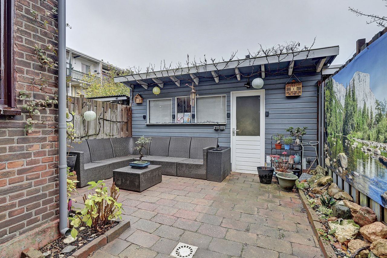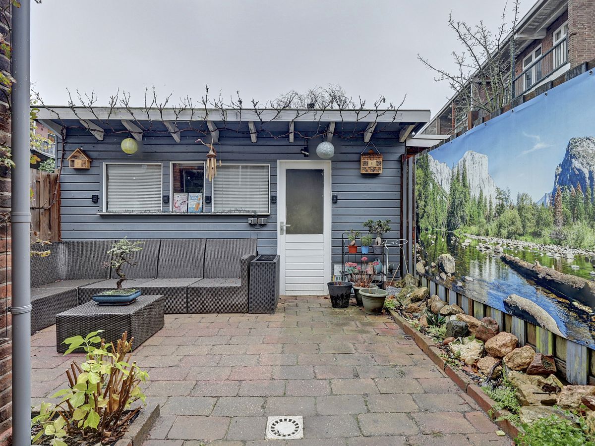 De tuin is op het oosten gelegen en is heerlijk toeven met veel privacy. Royale berging voorzien van elektra en achteruitgang.