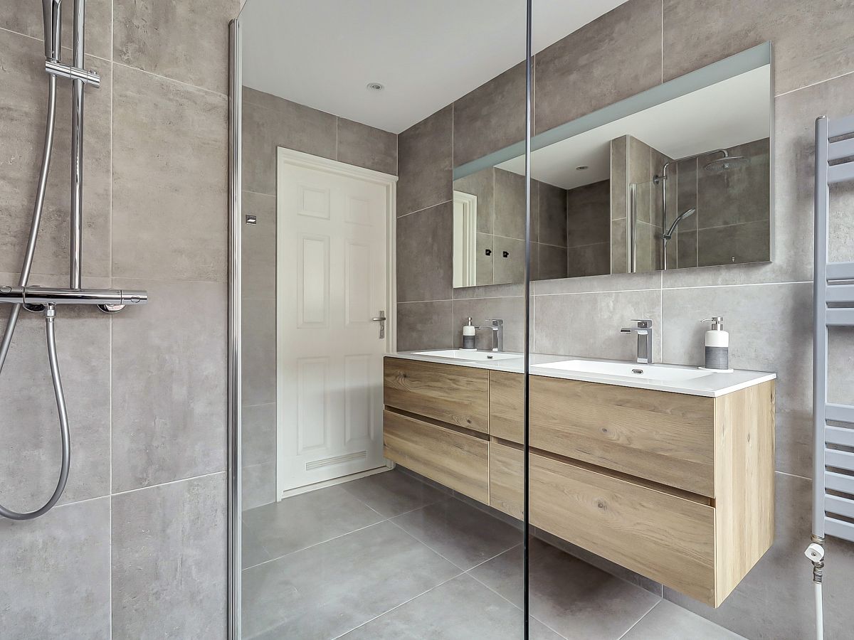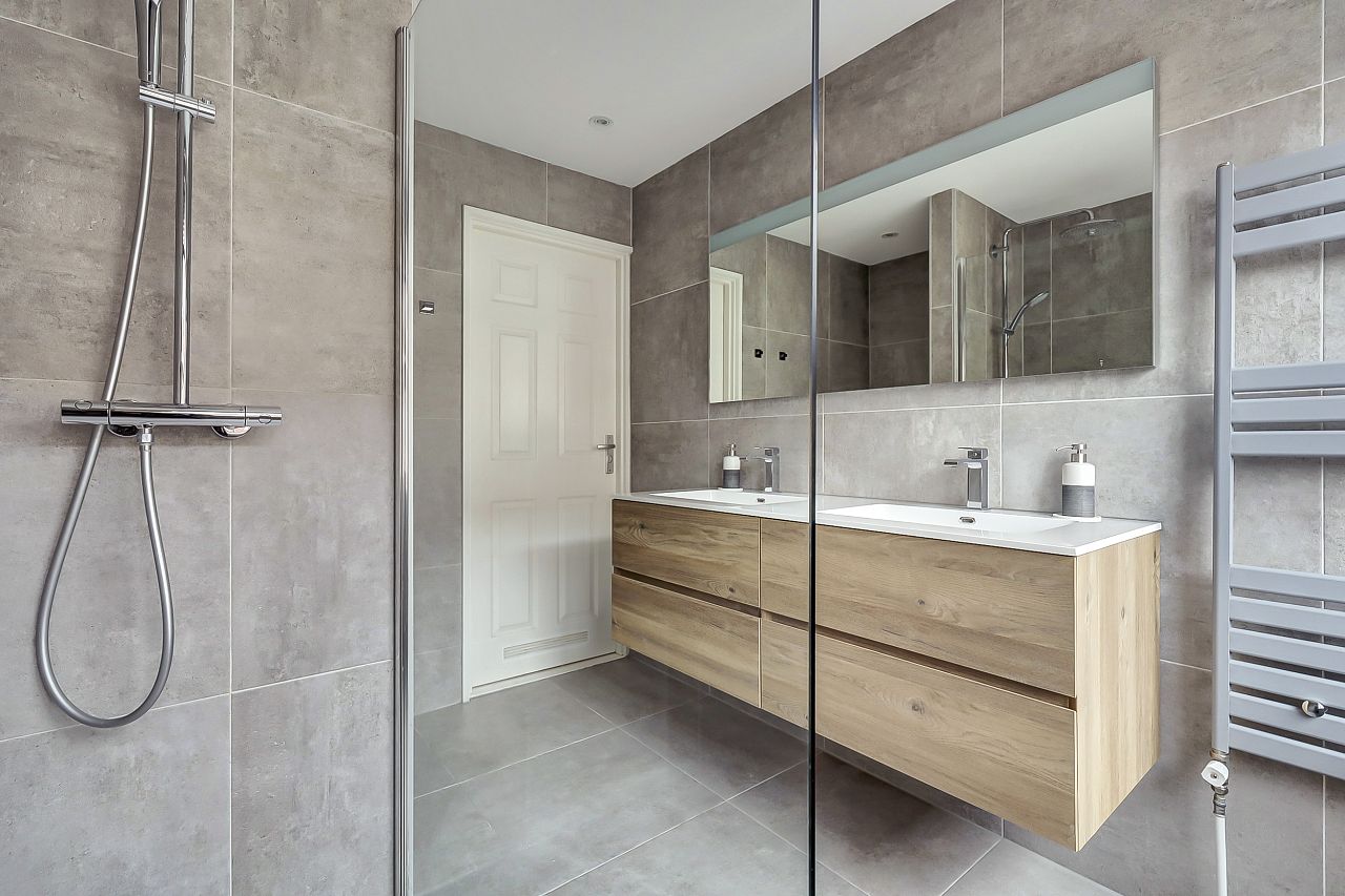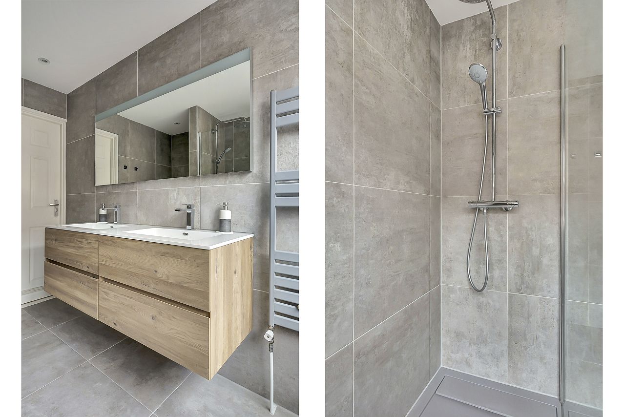 Overloop; 1e ouderslaapkamer; toegang tot ruim balkon; op de overloop ruime schuifkastenwand; luxe badkamer met inloopdouche, 2e toilet en dubbel wastafelmeubel in lichtgrijze kleurstelling; 2e voorslaapkamer.