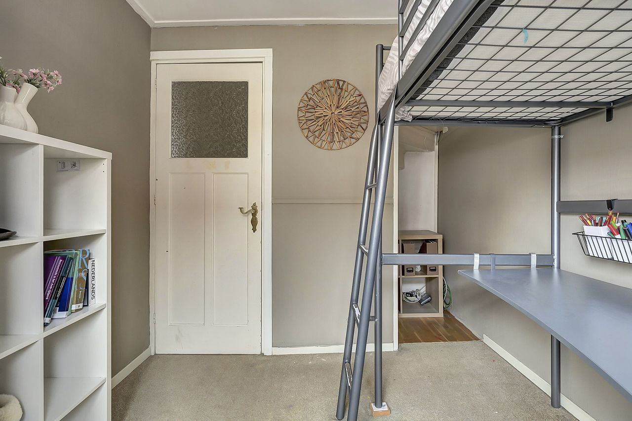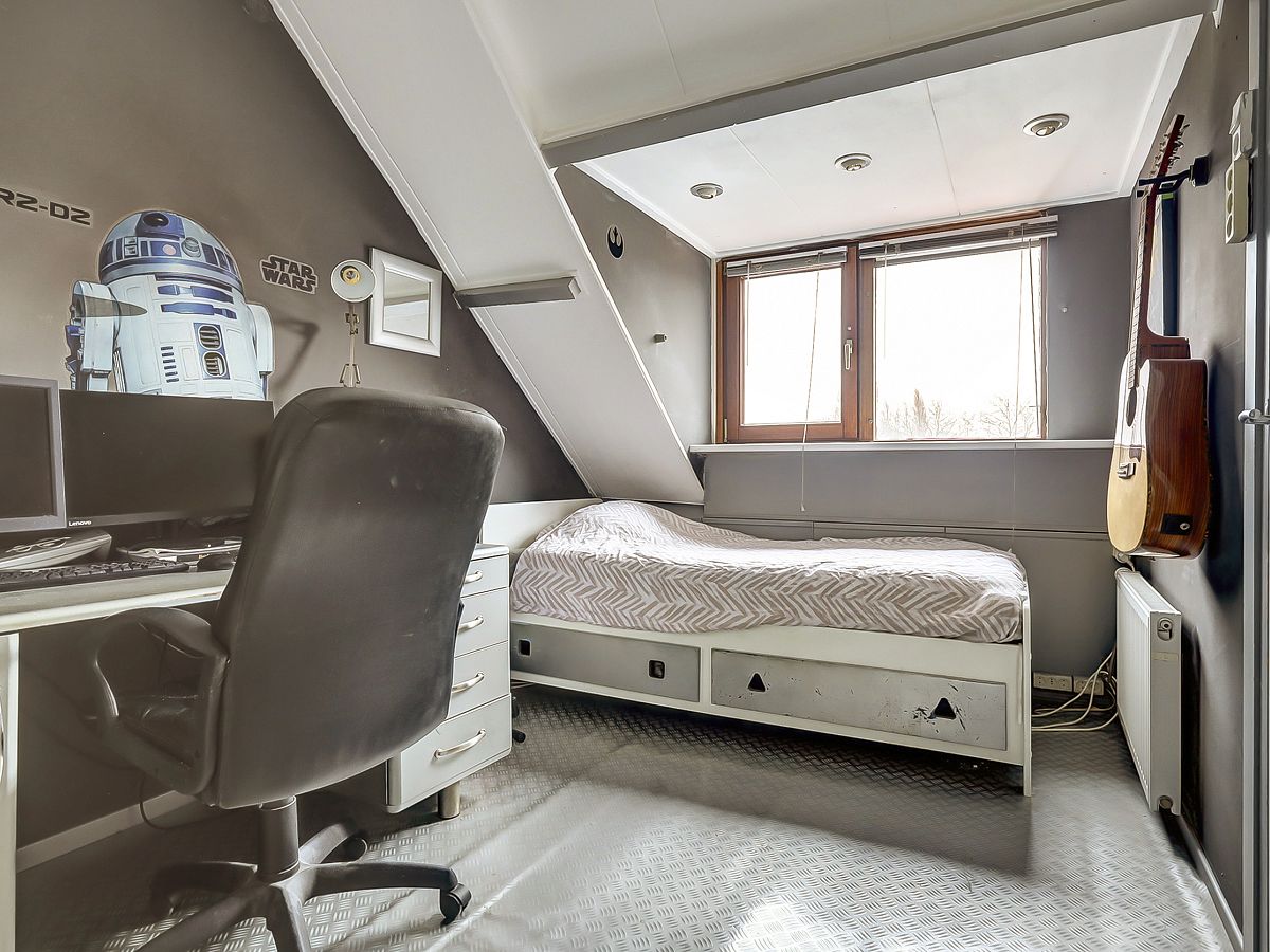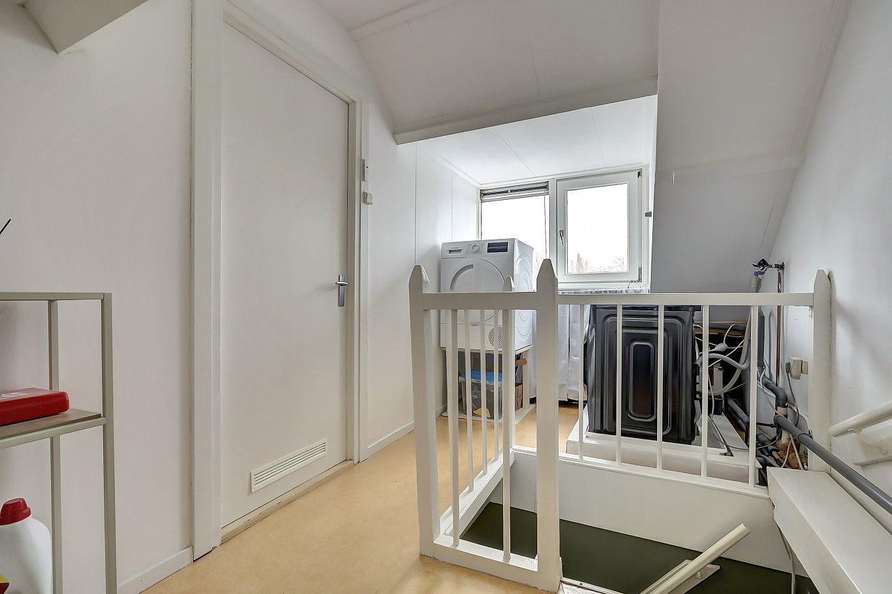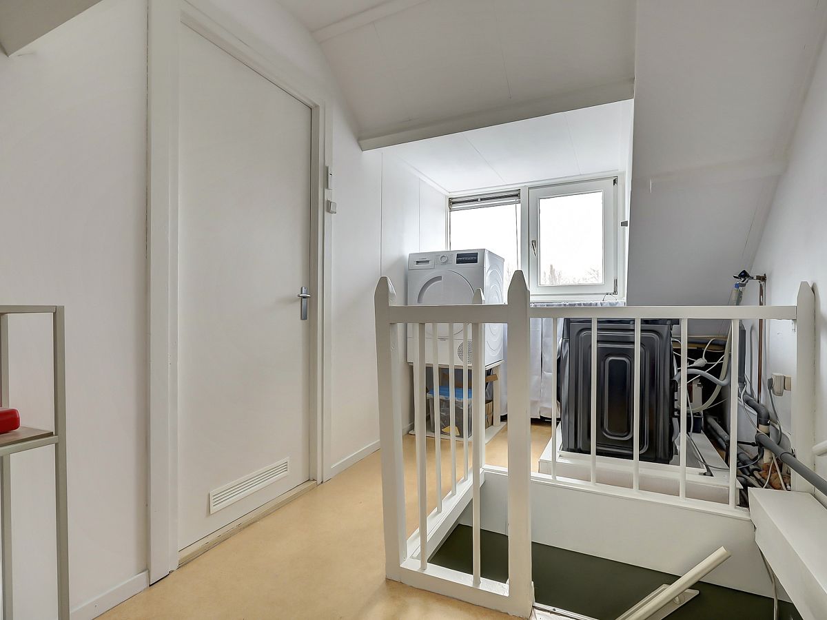 Voorzolder alwaar opstelling voor de wasmachine, droger en cv-combiketel; knieschotten en achterslaapkamer met aan achterzijde een dakkapel met elektrische screen.
