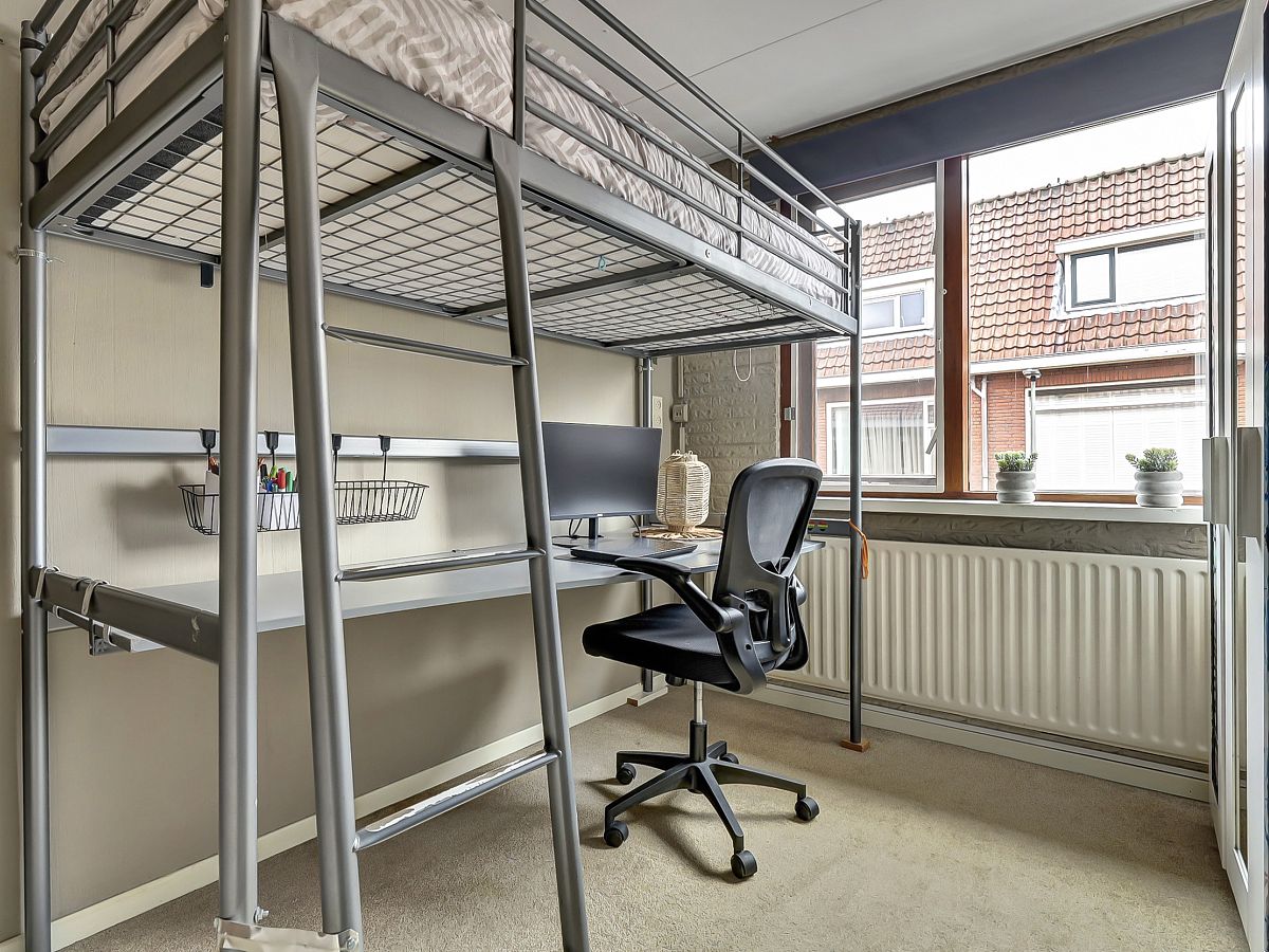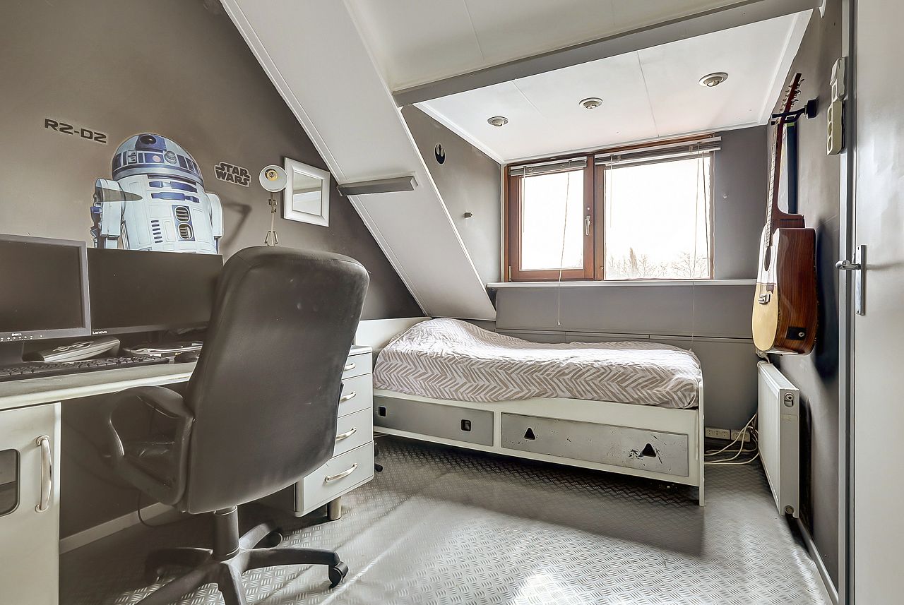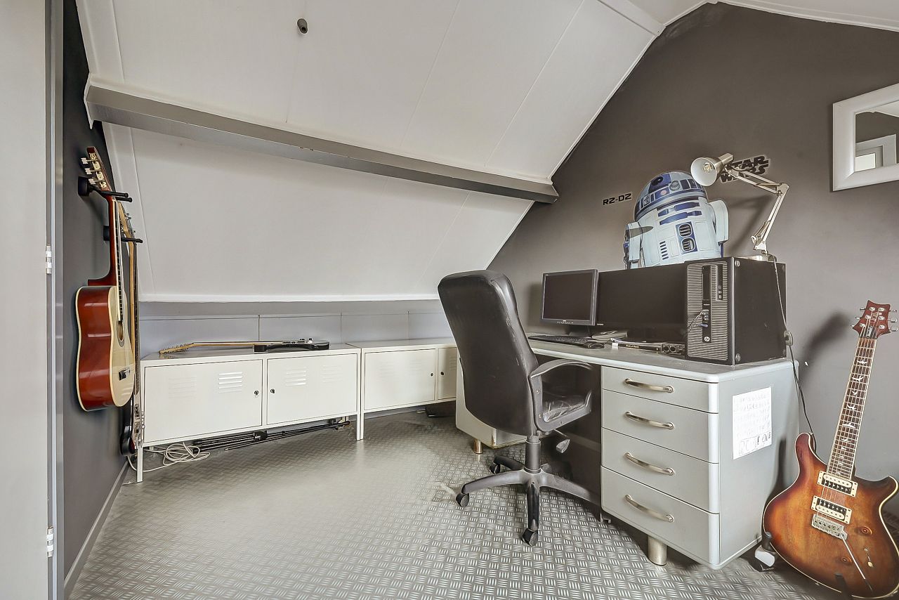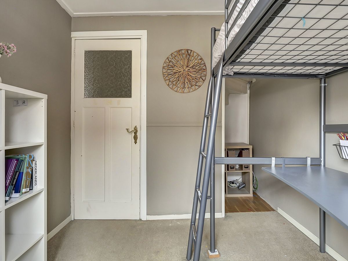 Voorzolder alwaar opstelling voor de wasmachine, droger en cv-combiketel; knieschotten en achterslaapkamer met aan achterzijde een dakkapel met elektrische screen.
