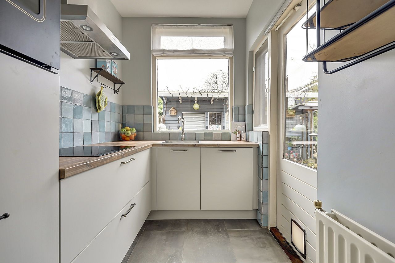 Entree/tochtportaal; gang; meterkast; trapkast; geheel betegeld nette toiletruimte met toilet en fonteintje; hoekkeuken met lichte frontinrichting en houtlook aanrechtblad voorzien van inductiekookplaat, afzuigkap, vaatwasser, koelkast en uitgang naar de tuin.