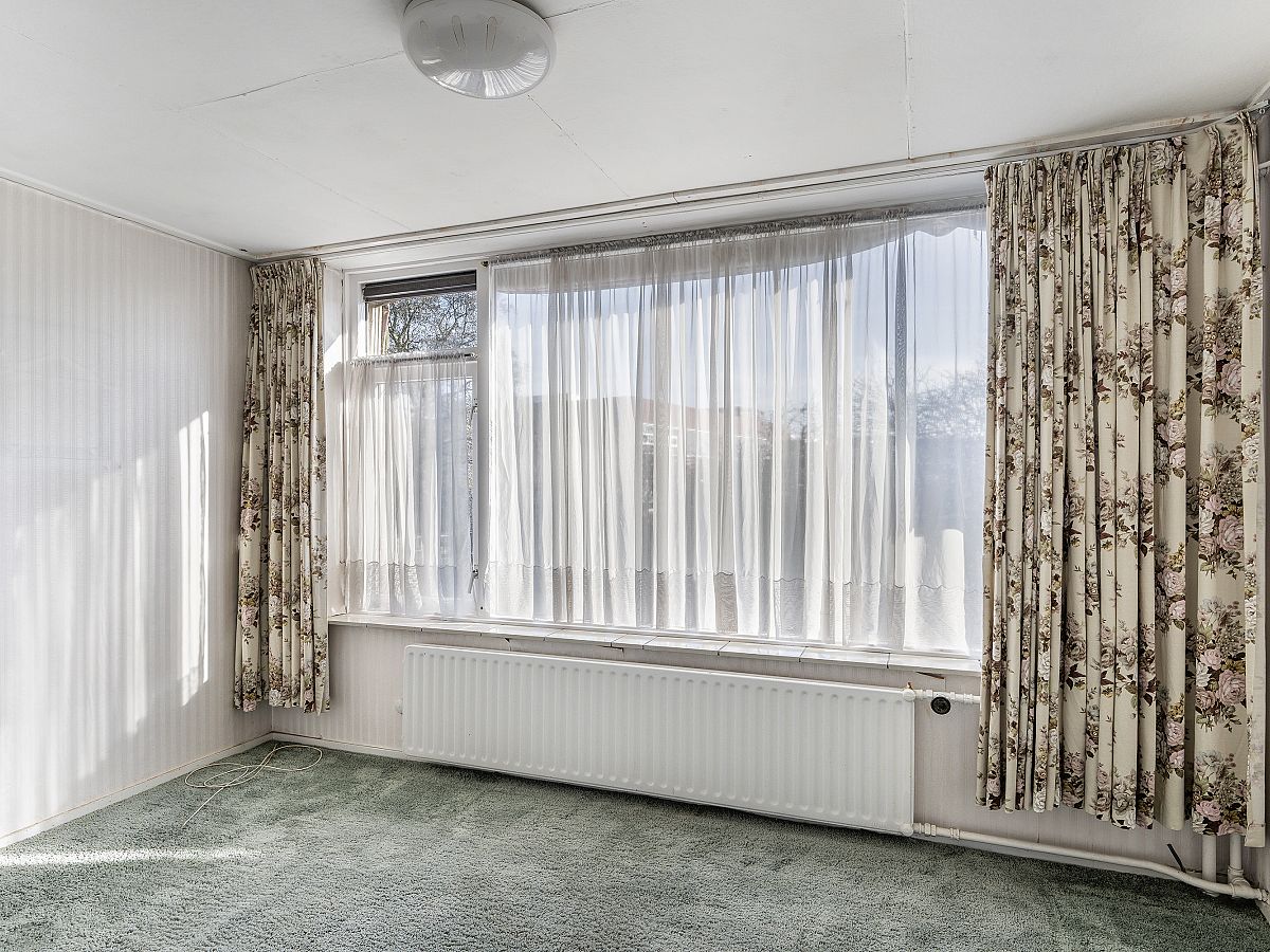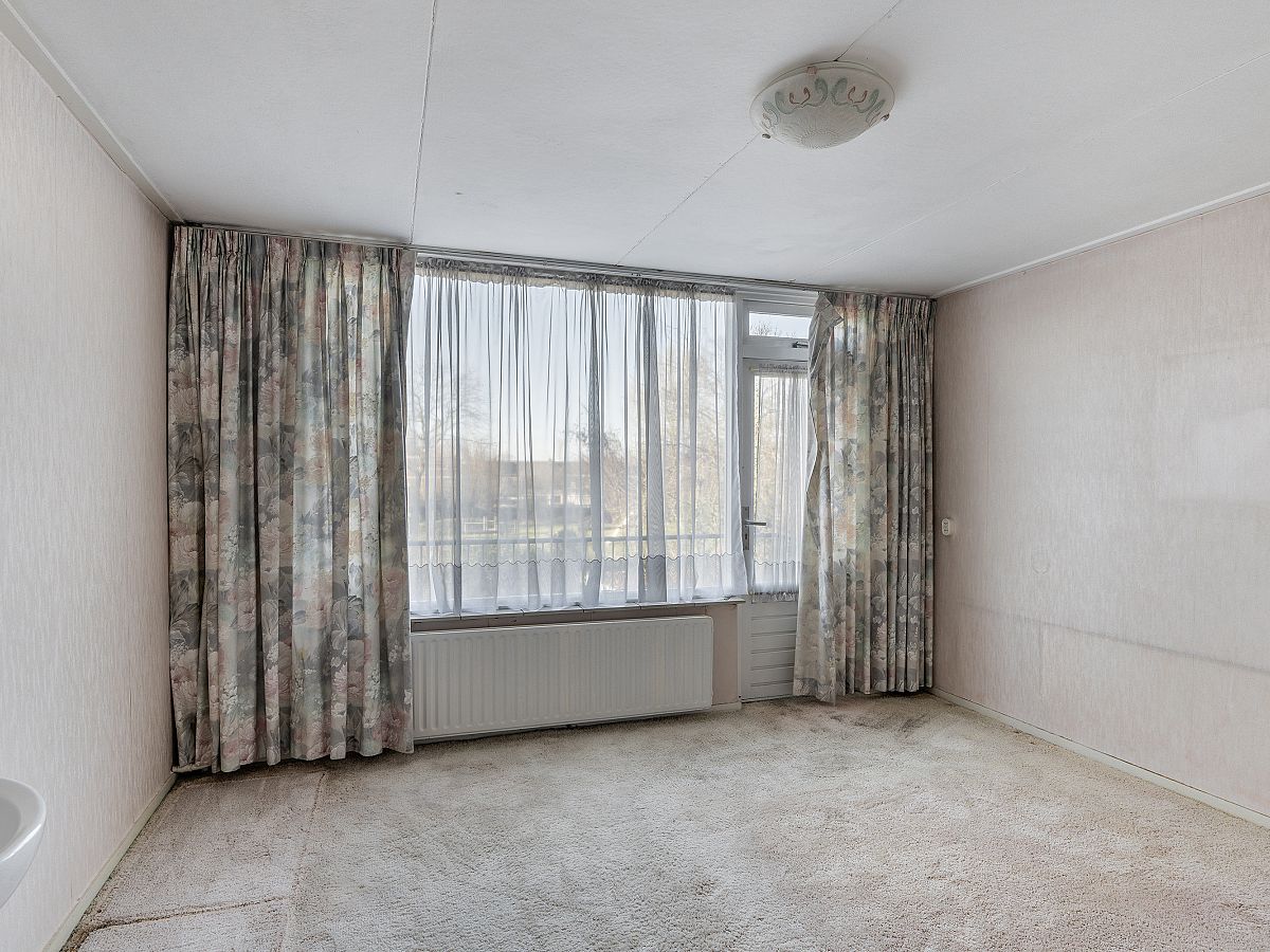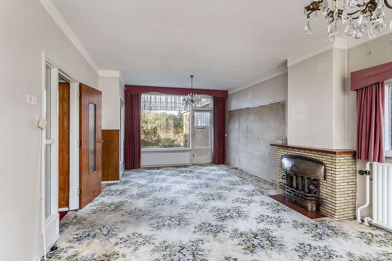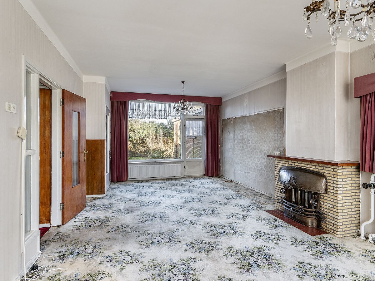 Ruime doorzonwoonkamer met extra lichtinval door het zijraam, schouw en kachel, vaste kast en toegangsdeur naar de achtertuin.