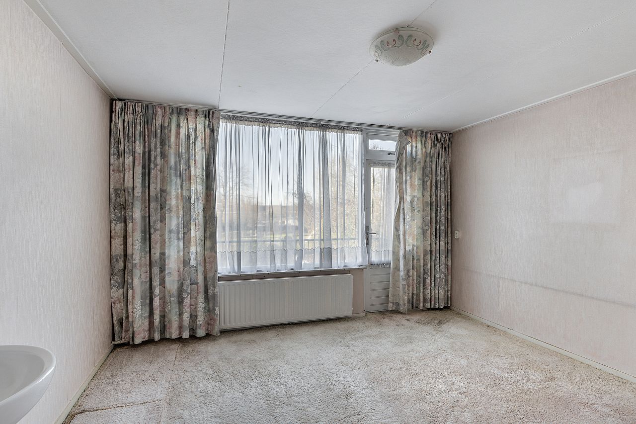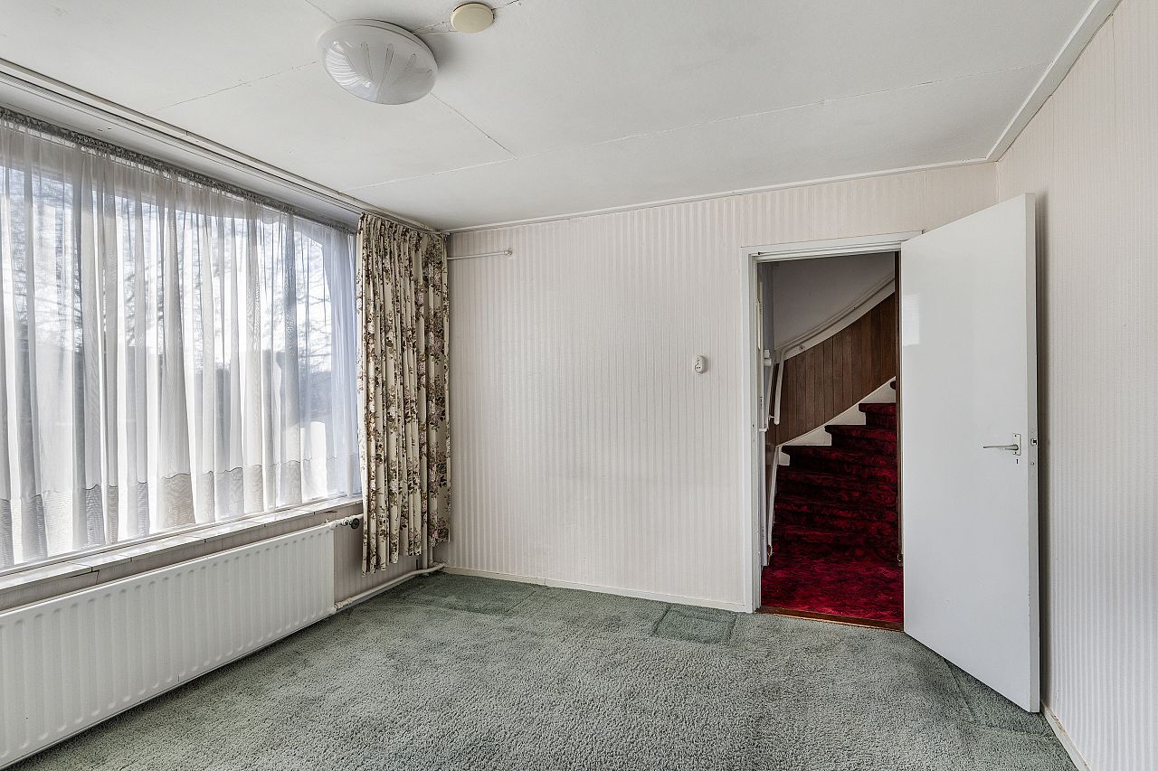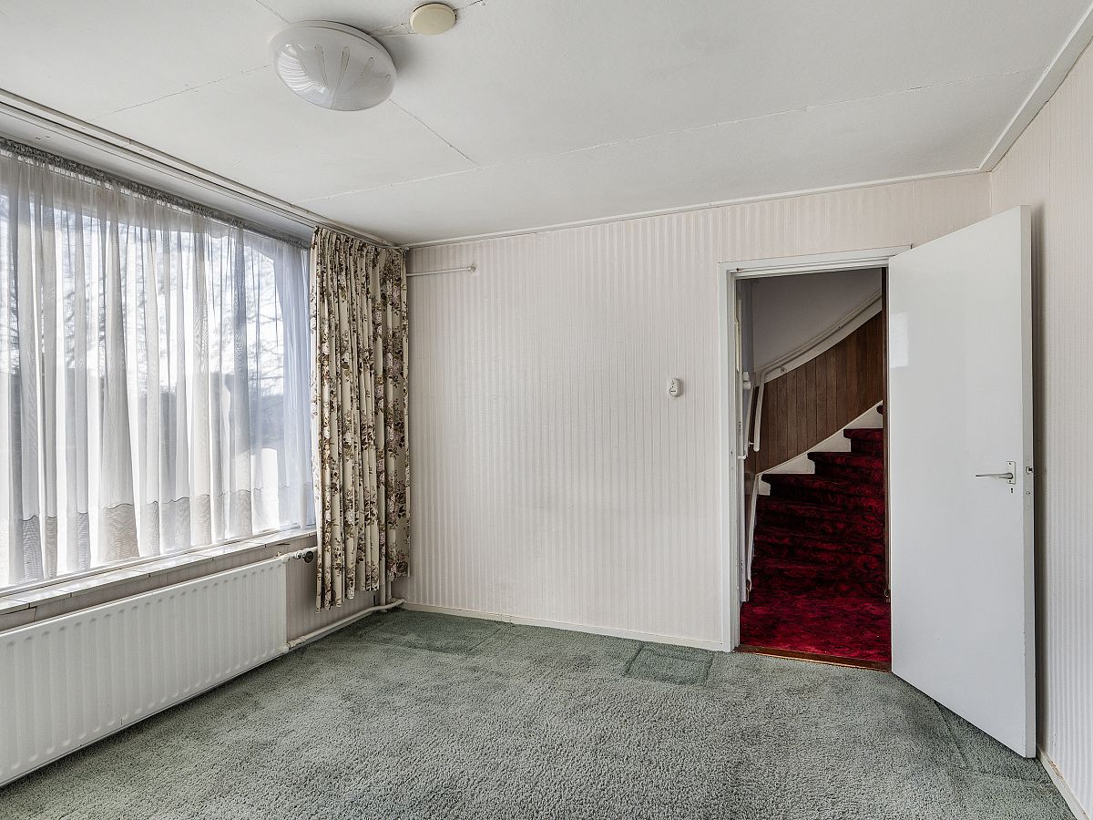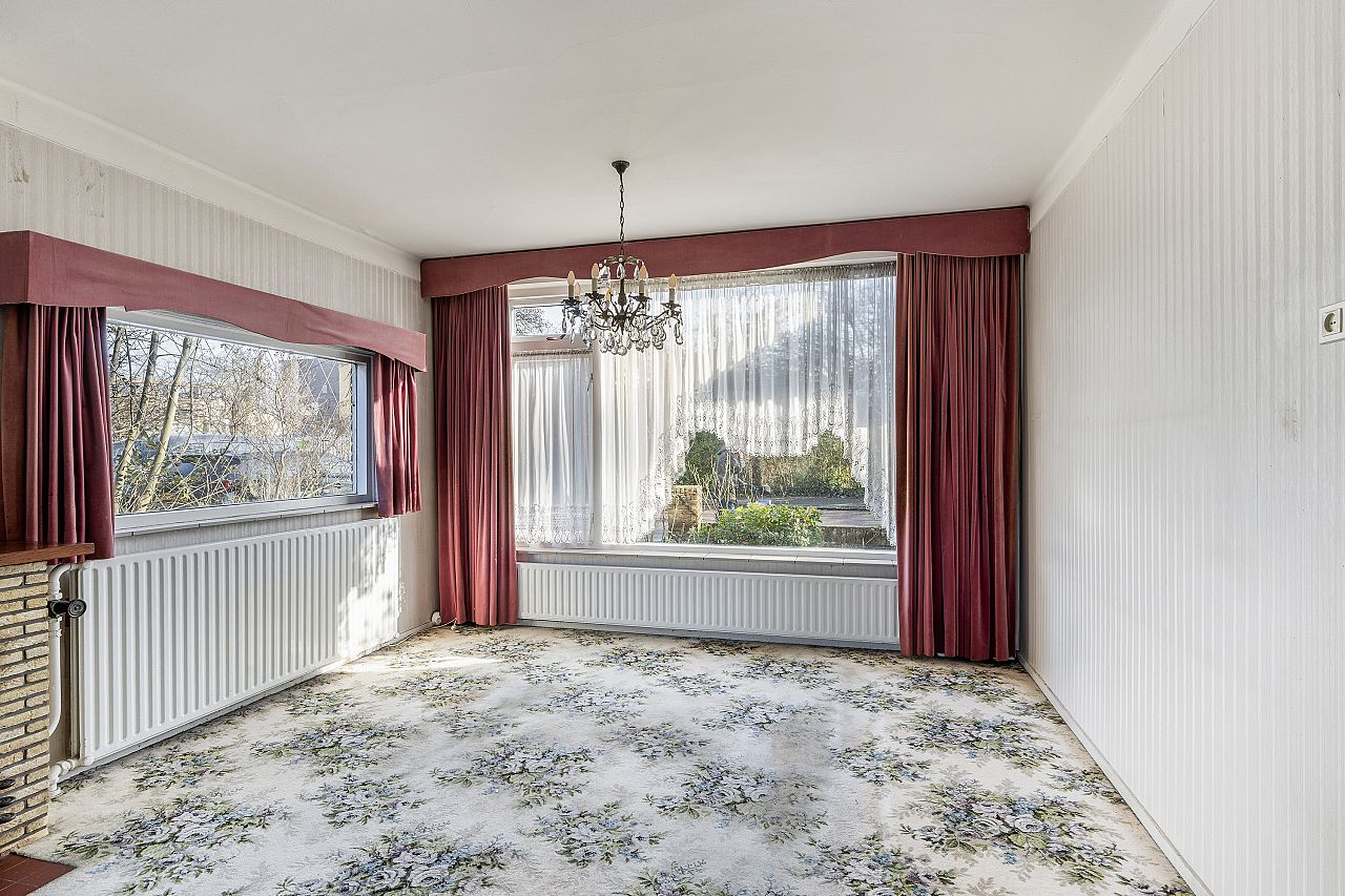 Ruime doorzonwoonkamer met extra lichtinval door het zijraam, schouw en kachel, vaste kast en toegangsdeur naar de achtertuin.