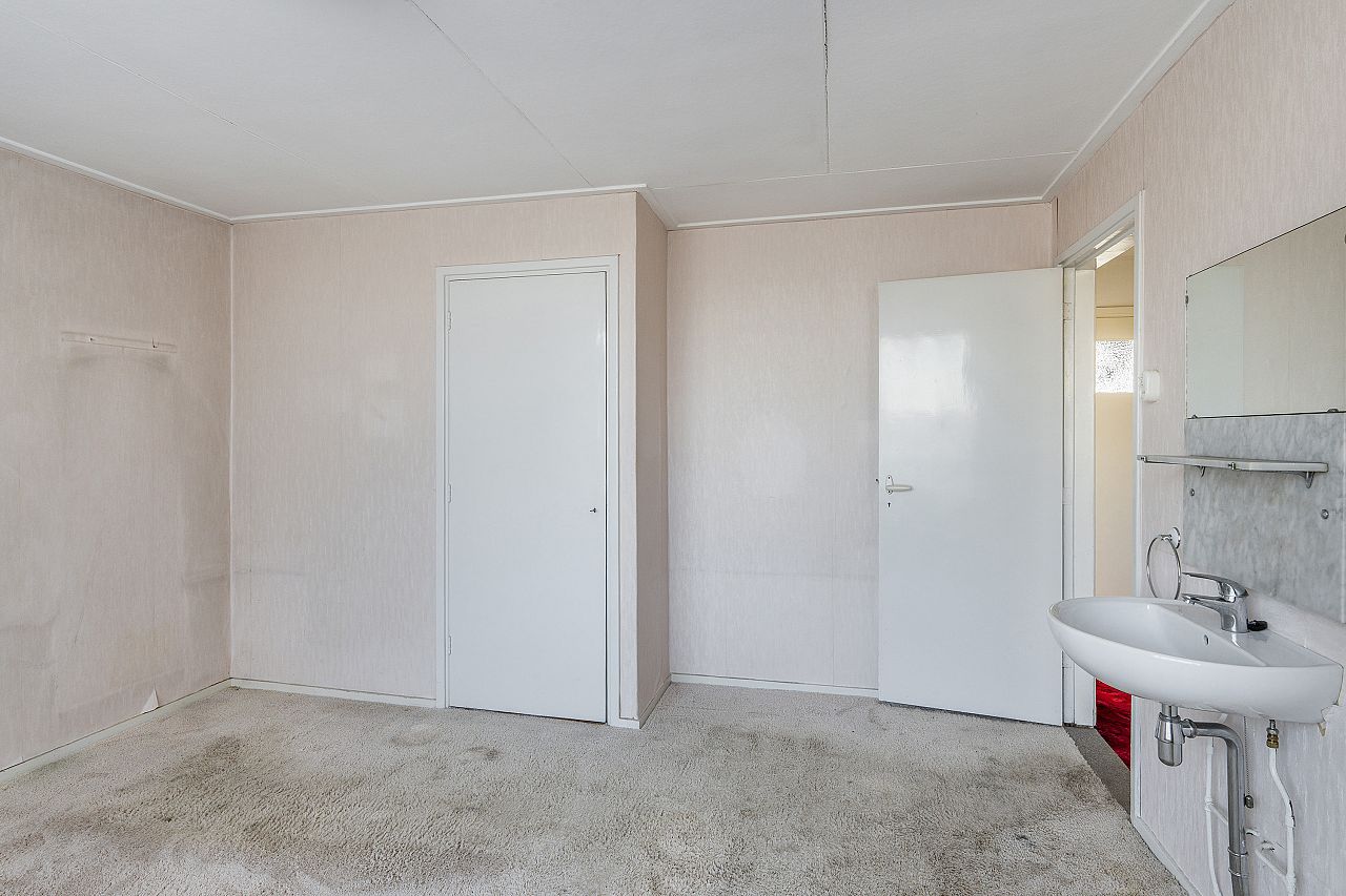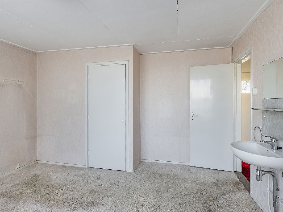 Slaapkamer aan de achterzijde met vaste kast, wastafel en deur naar het balkon.