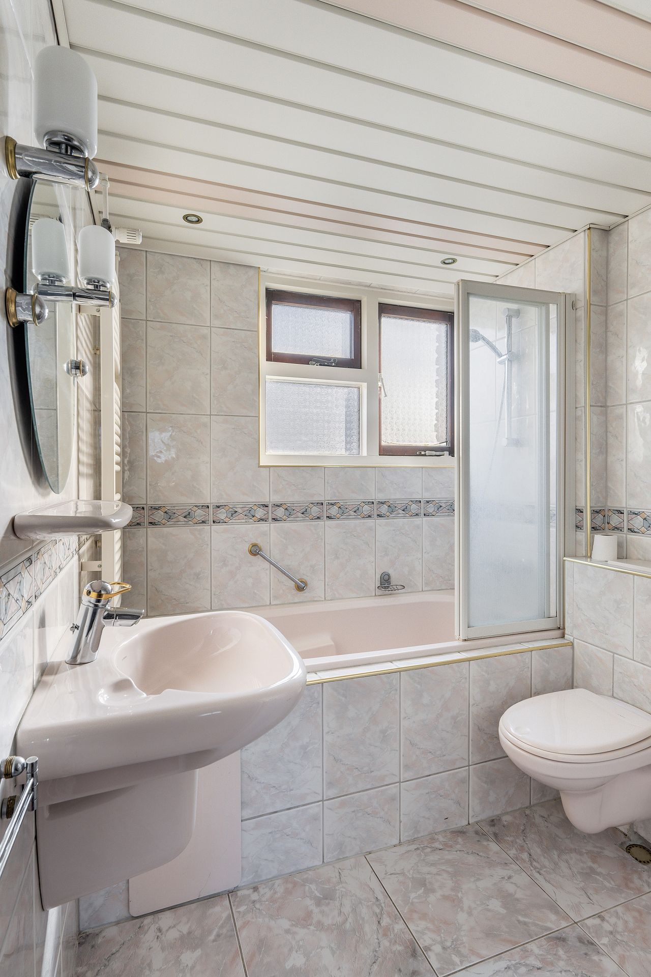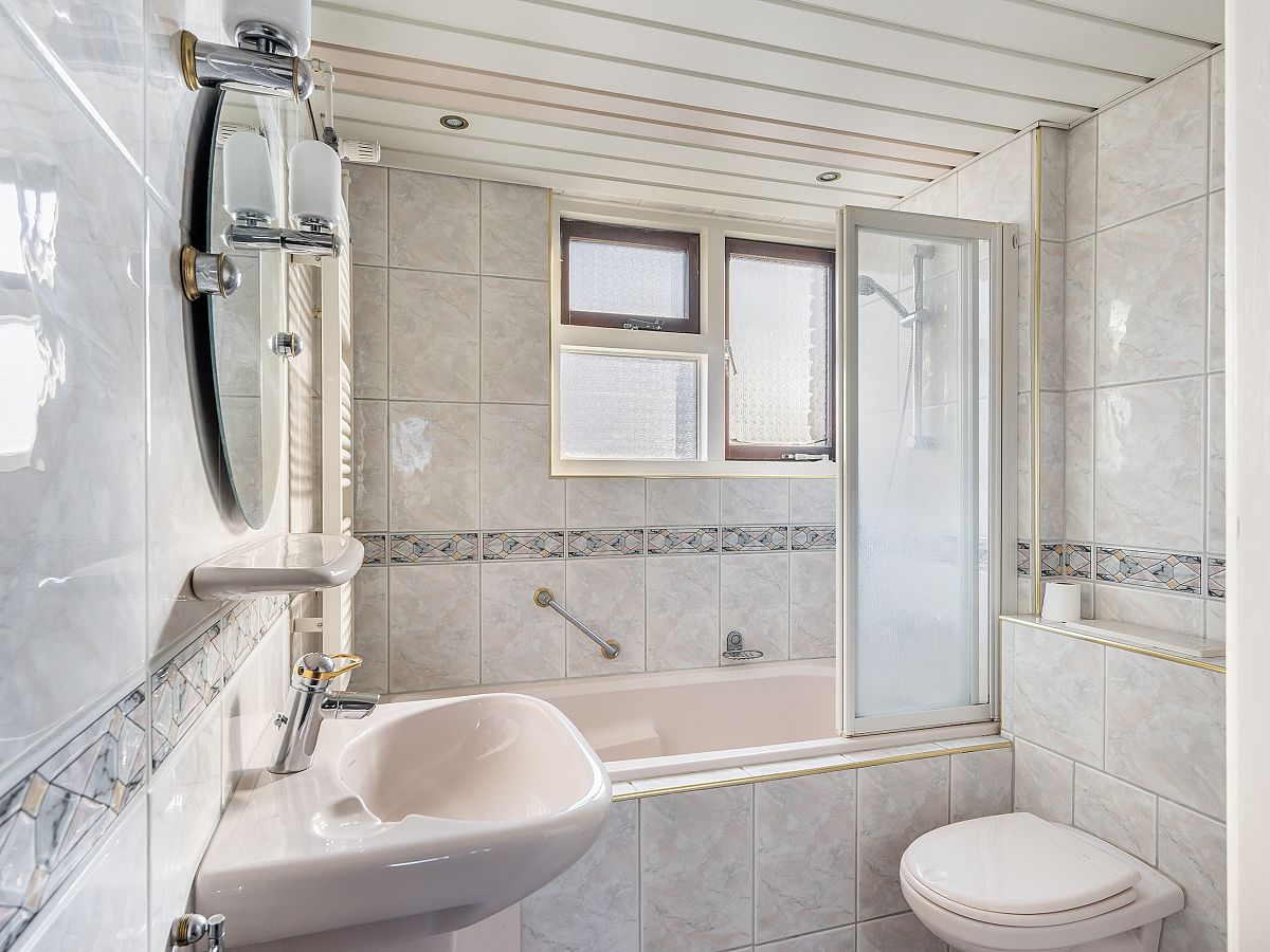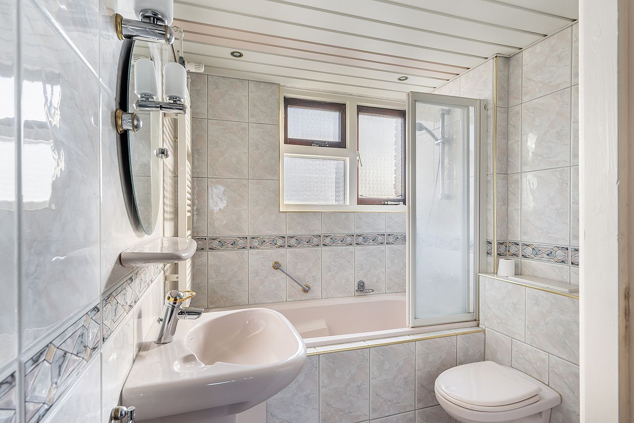 Badkamer met ligbad waarin een douche-gedeelte zit, wastafel, tweede toilet en wasmachine-aansluiting.