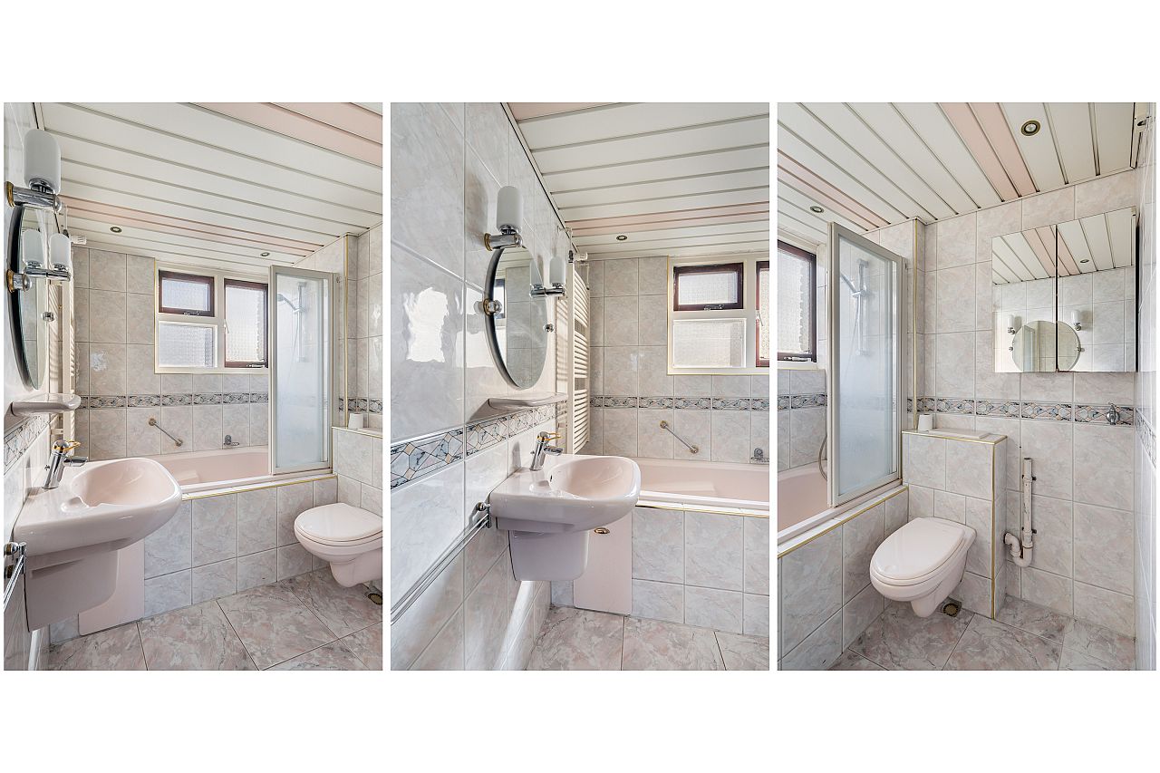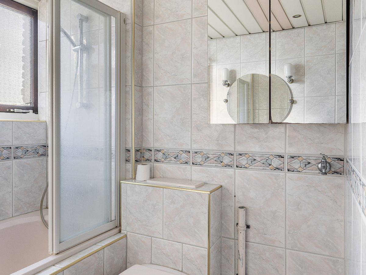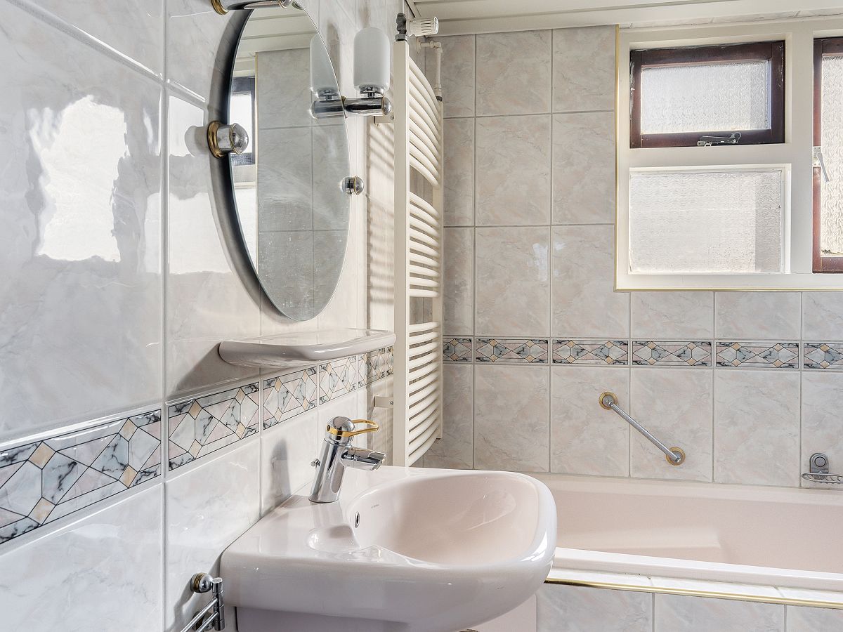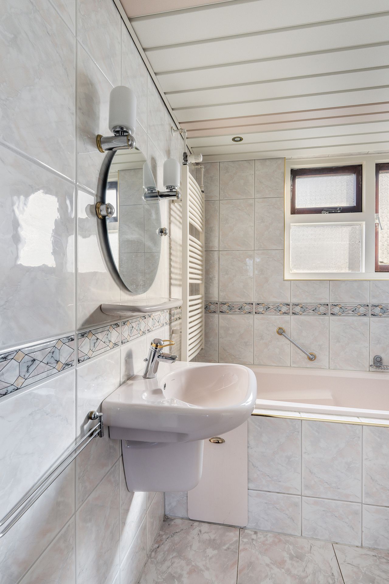Badkamer met ligbad waarin een douche-gedeelte zit, wastafel, tweede toilet en wasmachine-aansluiting.