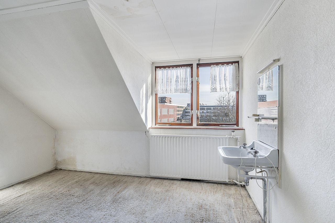 Slaapkamer aan de achterzijde met dakkapel en wastafel.