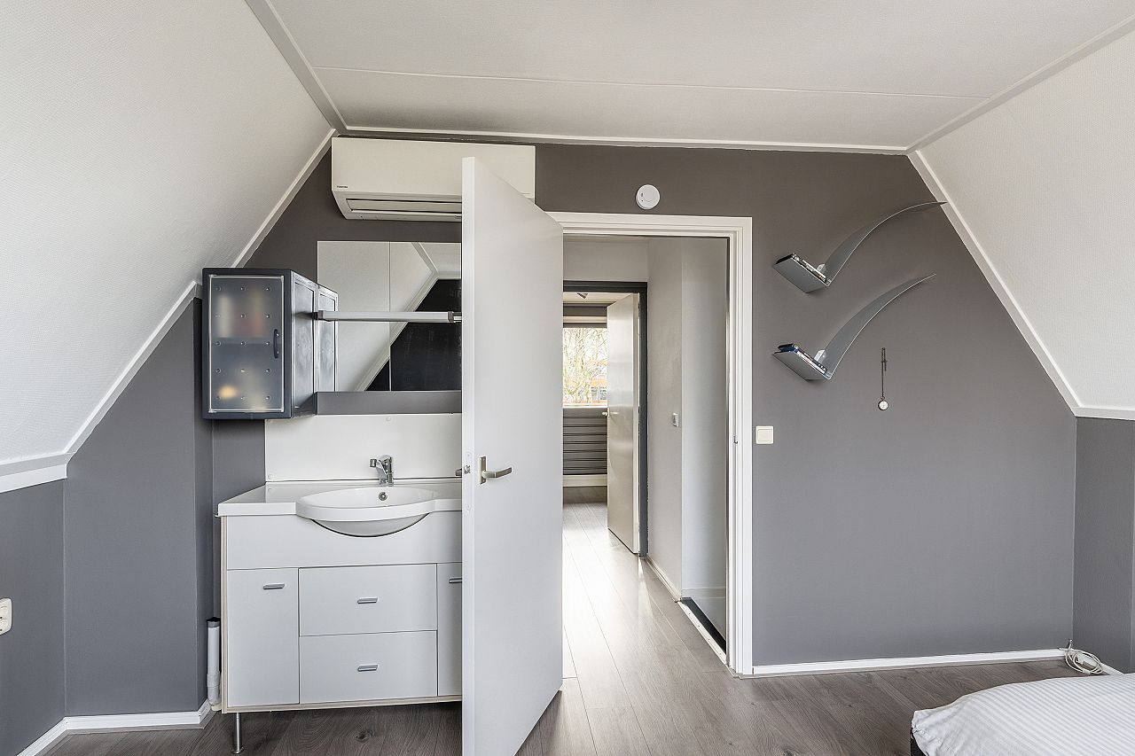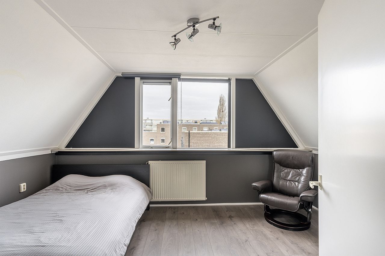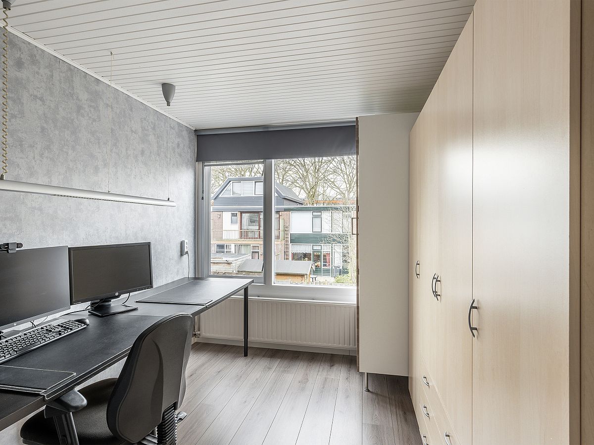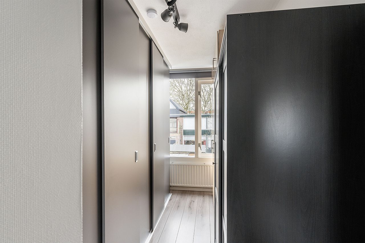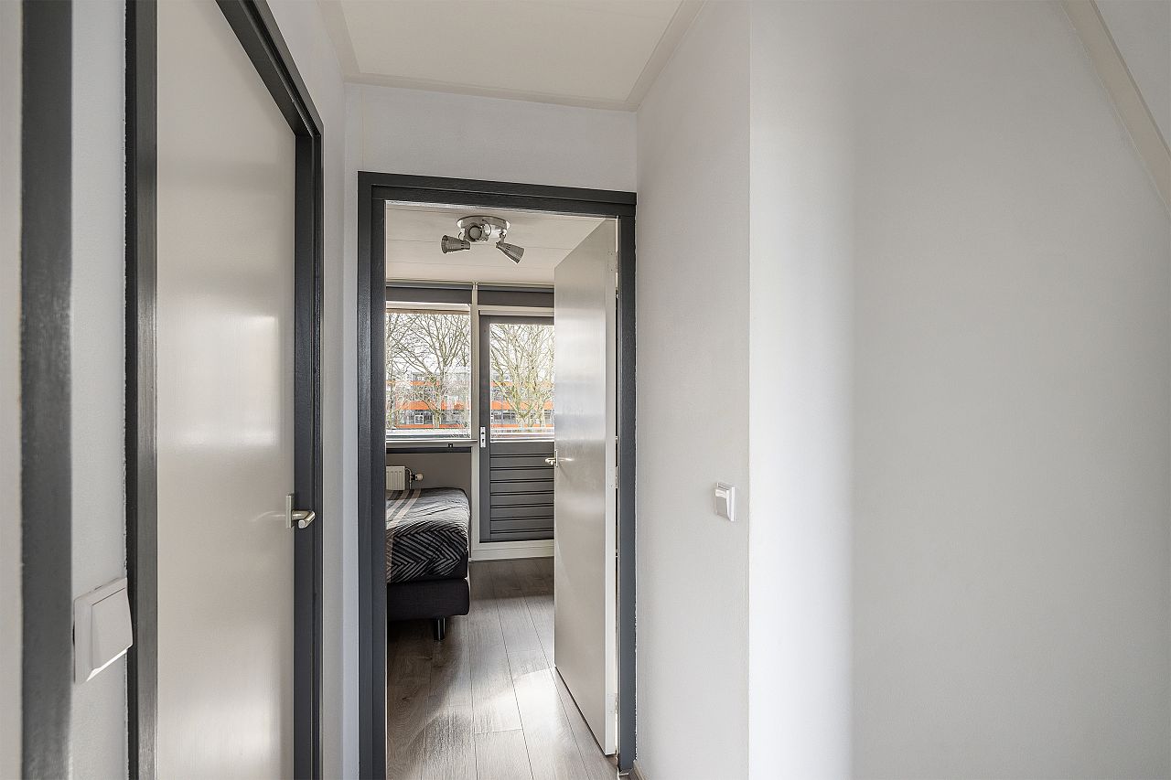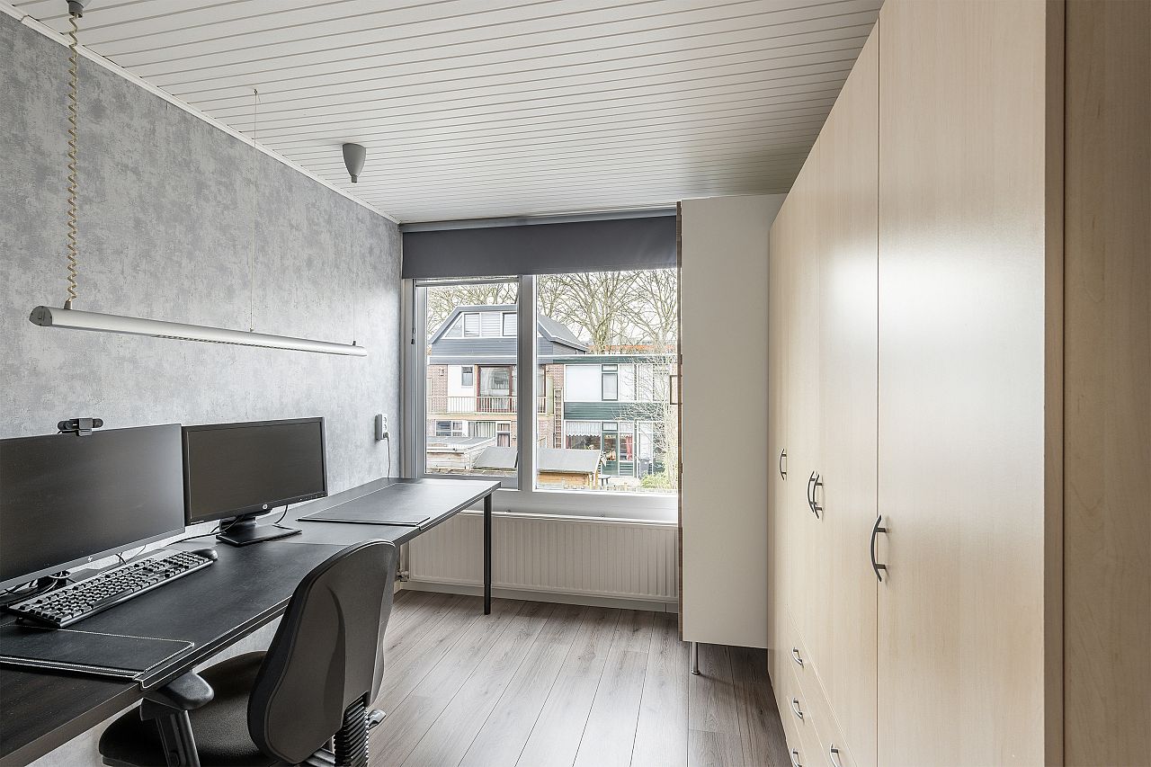 overloop; 1e slaapkamer aan achterzijde voorzien van schuifkastenwand en in gebruik als kastenkamer; 2e slaapkamer in gebruik als werkamer; badkamer (2019) met lichte grijze en mat witte betegeling en voorzien van inloopdouche, wastafelmeubel en 2e toilet; 3e slaapkamer aan voorzijde met schuifkastenwand. De hele verdieping is voorzien van hetzelfde laminaat, hardhouten kozijnen met dubbel glas en horren.