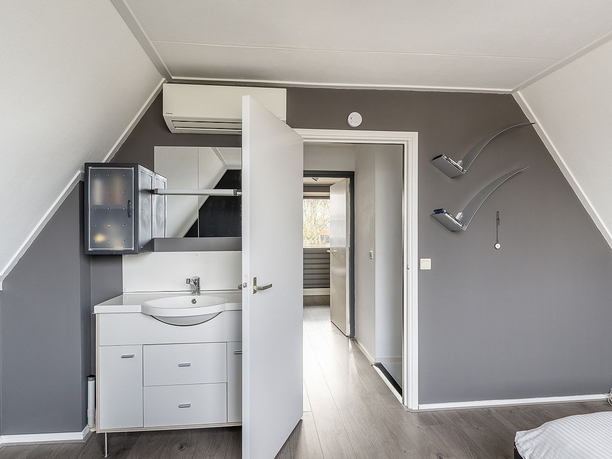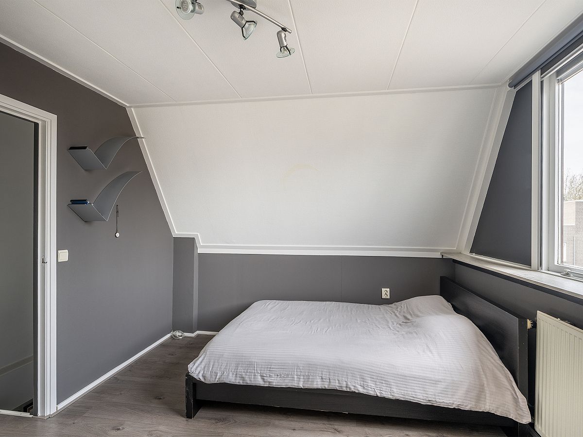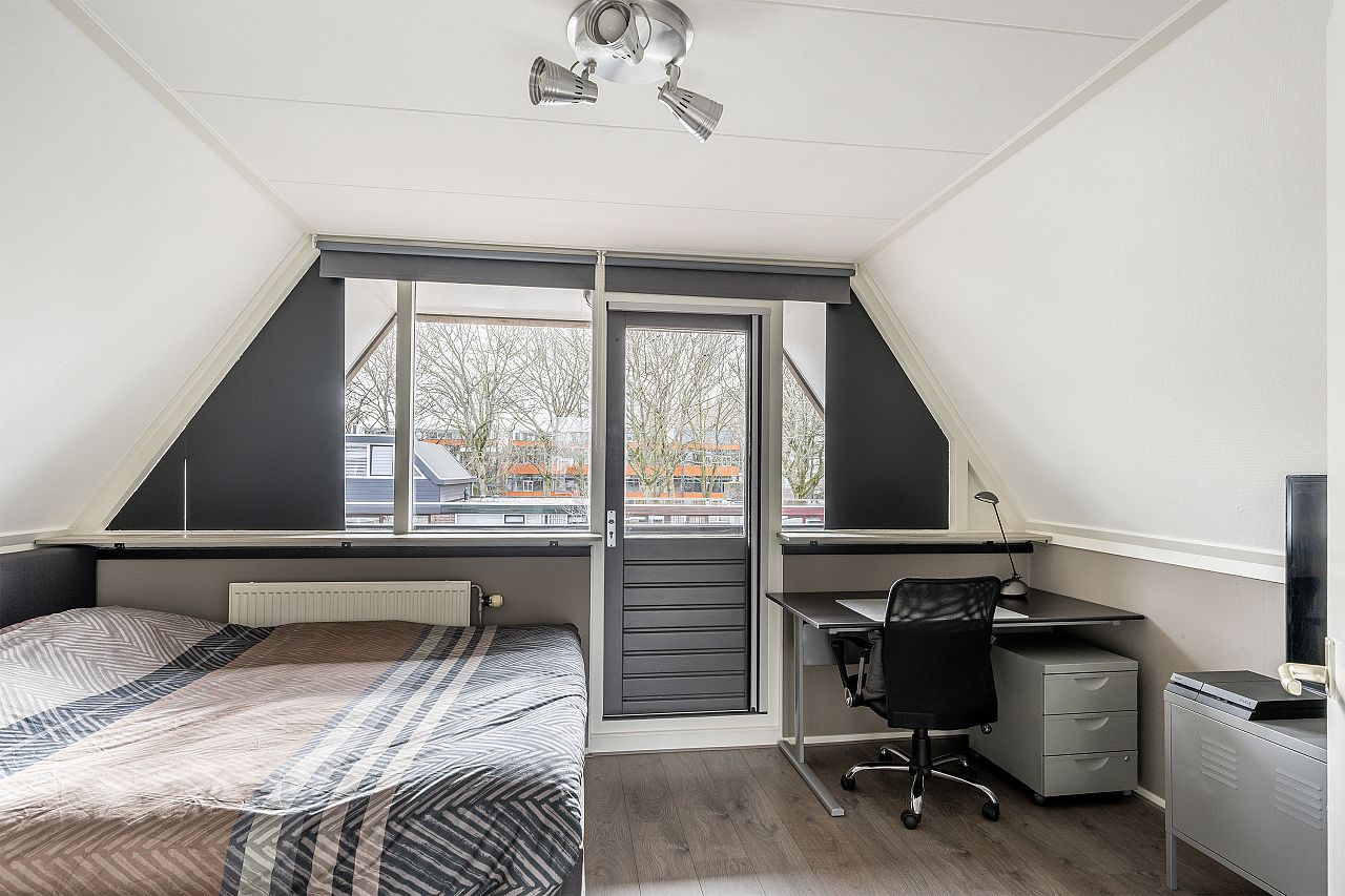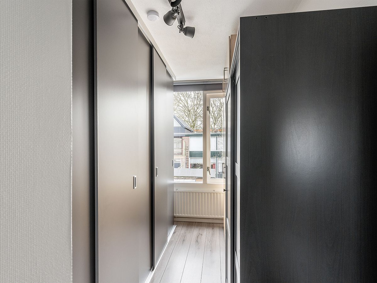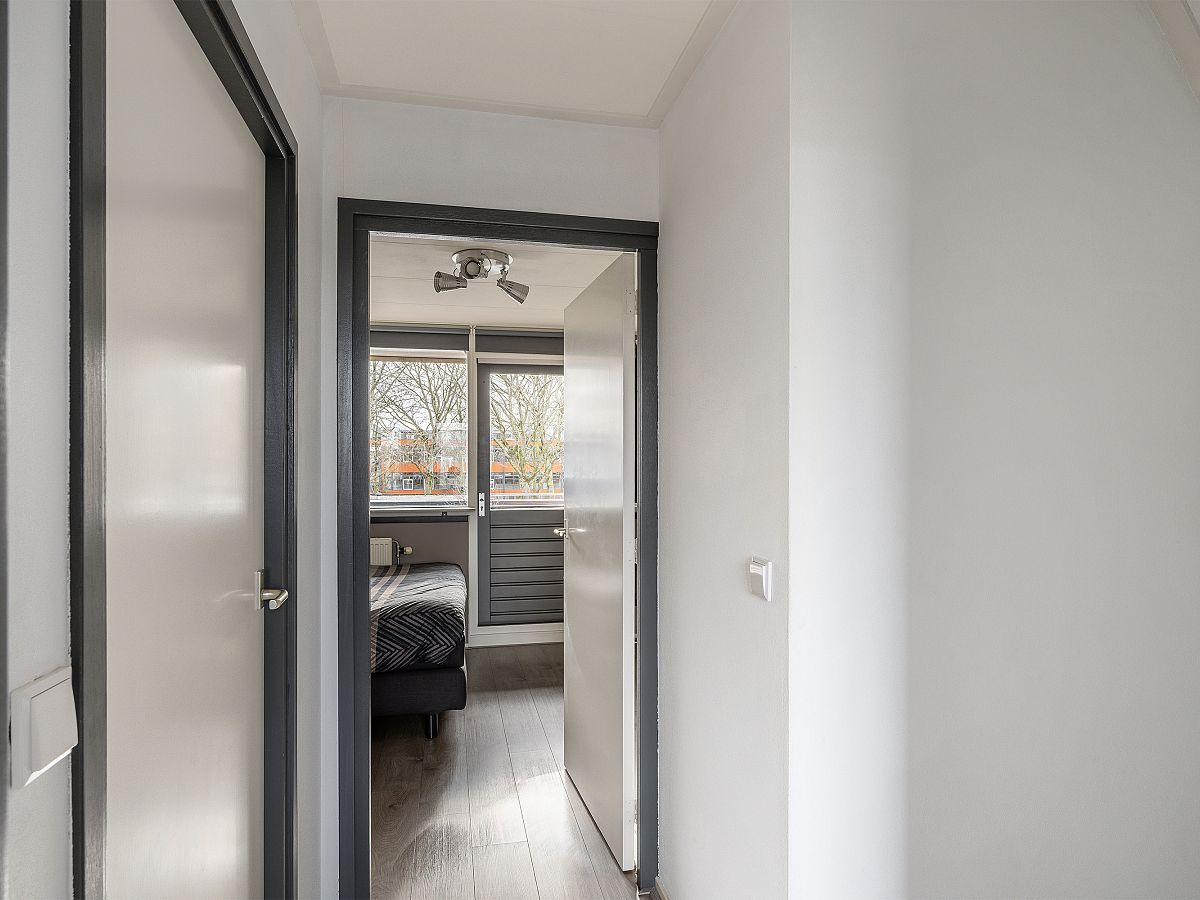 overloop; 1e slaapkamer aan achterzijde voorzien van schuifkastenwand en in gebruik als kastenkamer; 2e slaapkamer in gebruik als werkamer; badkamer (2019) met lichte grijze en mat witte betegeling en voorzien van inloopdouche, wastafelmeubel en 2e toilet; 3e slaapkamer aan voorzijde met schuifkastenwand. De hele verdieping is voorzien van hetzelfde laminaat, hardhouten kozijnen met dubbel glas en horren.