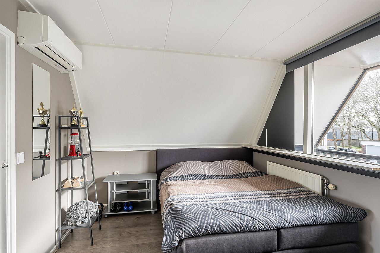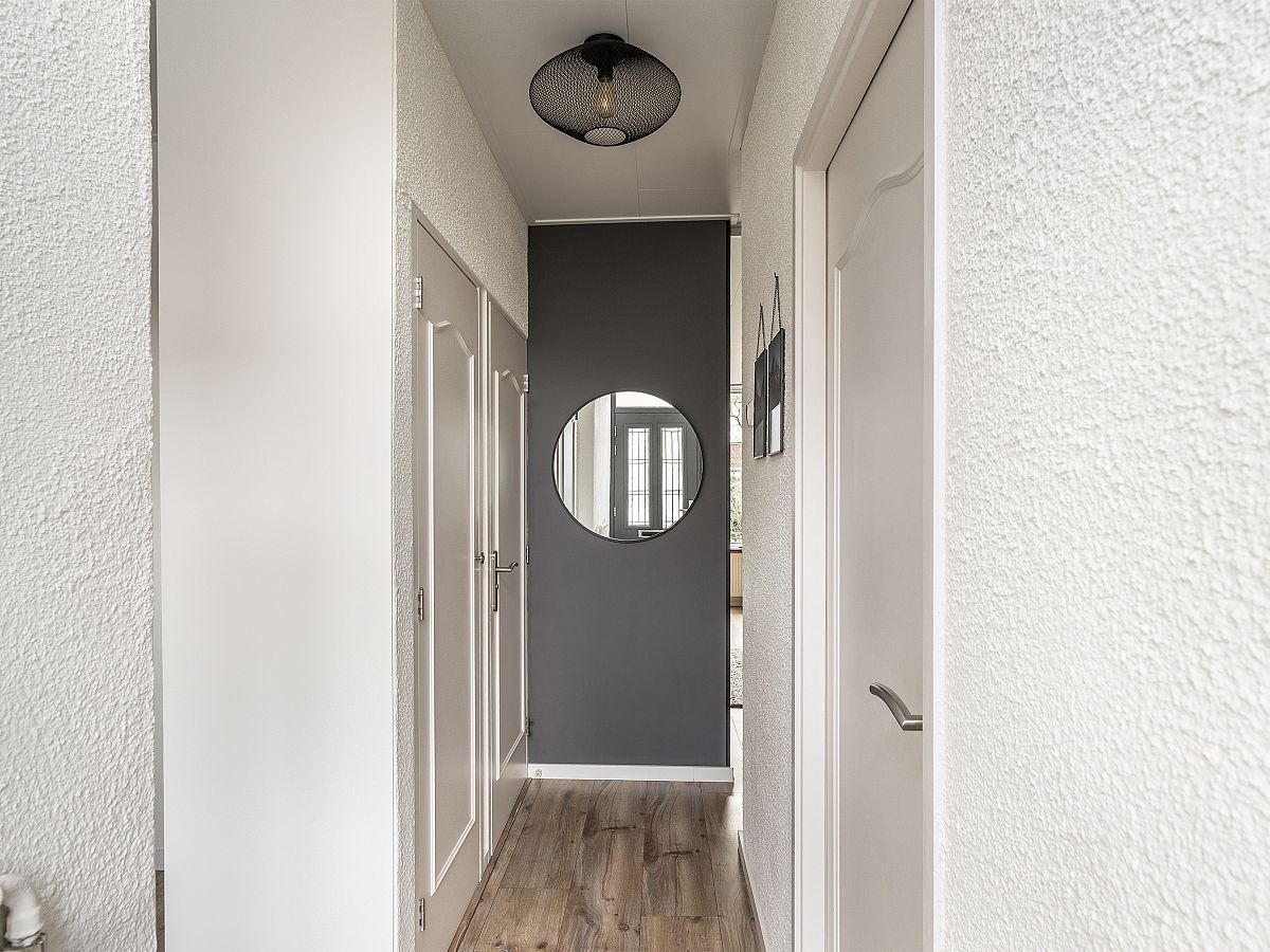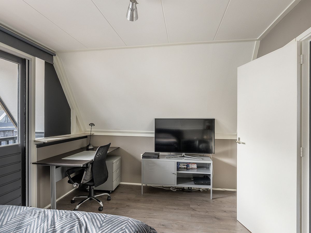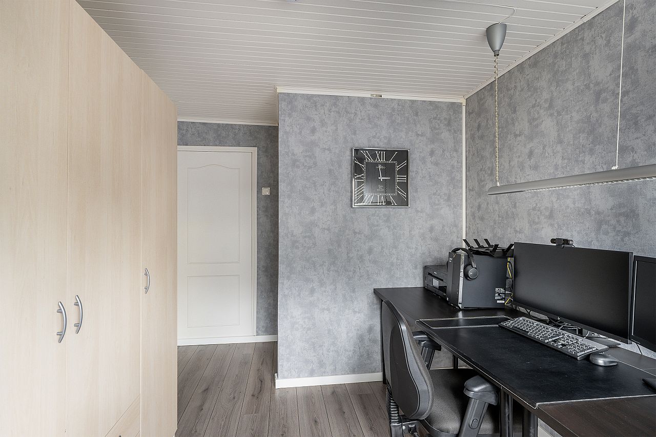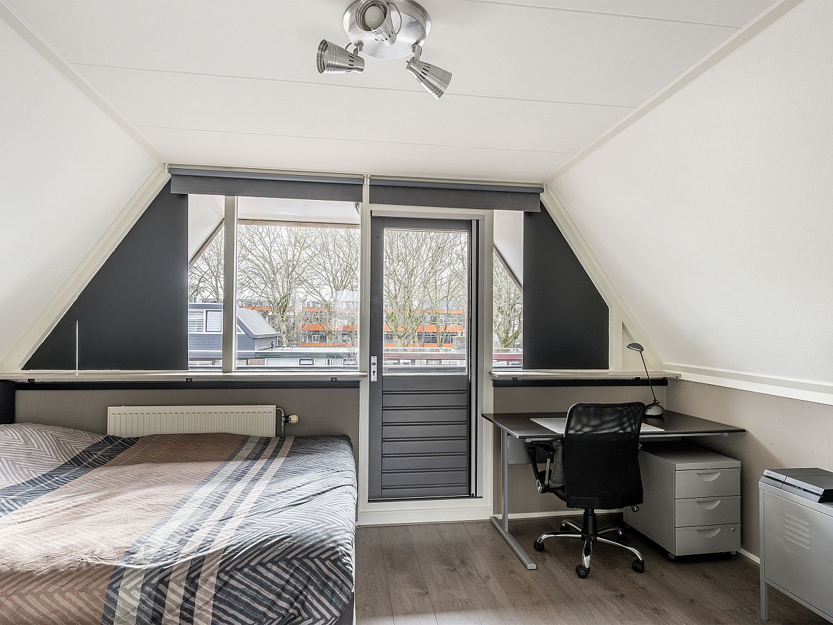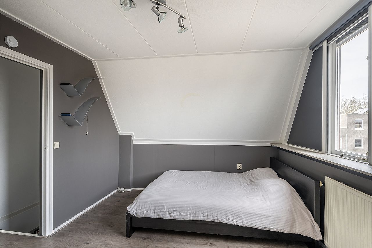 overloop; 1e slaapkamer aan achterzijde voorzien van schuifkastenwand en in gebruik als kastenkamer; 2e slaapkamer in gebruik als werkamer; badkamer (2019) met lichte grijze en mat witte betegeling en voorzien van inloopdouche, wastafelmeubel en 2e toilet; 3e slaapkamer aan voorzijde met schuifkastenwand. De hele verdieping is voorzien van hetzelfde laminaat, hardhouten kozijnen met dubbel glas en horren.