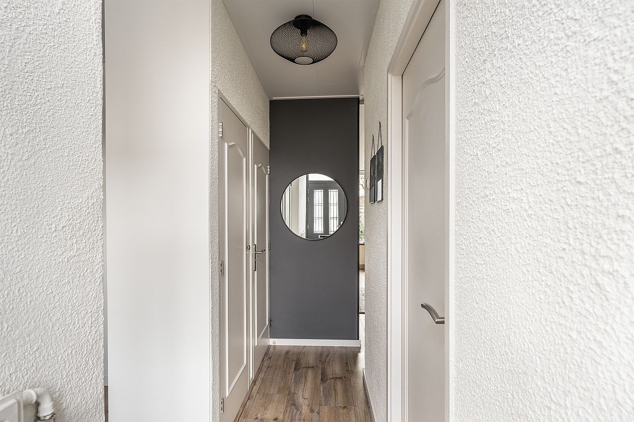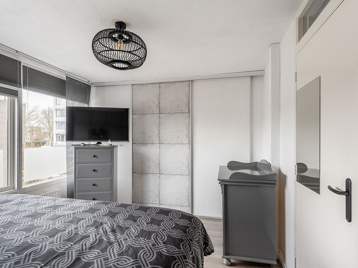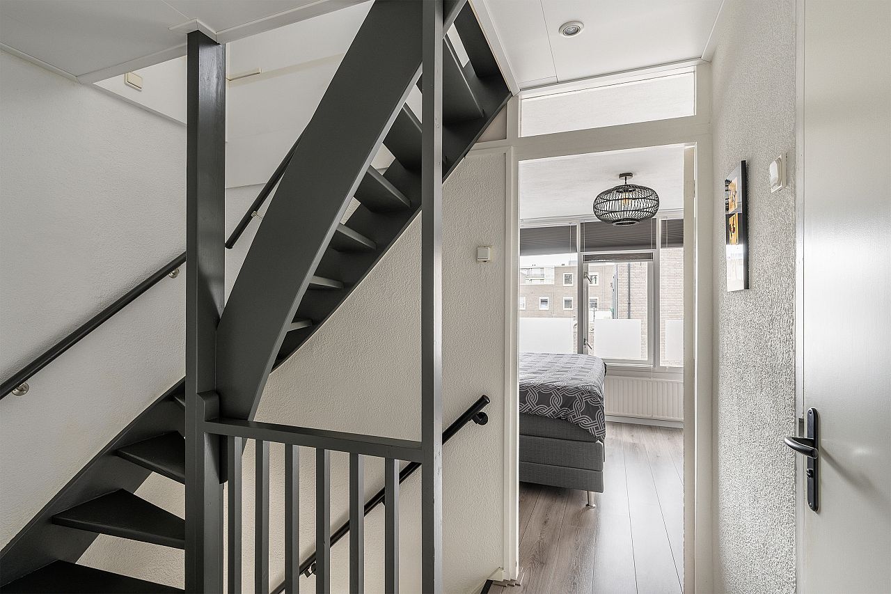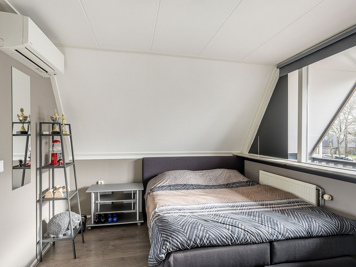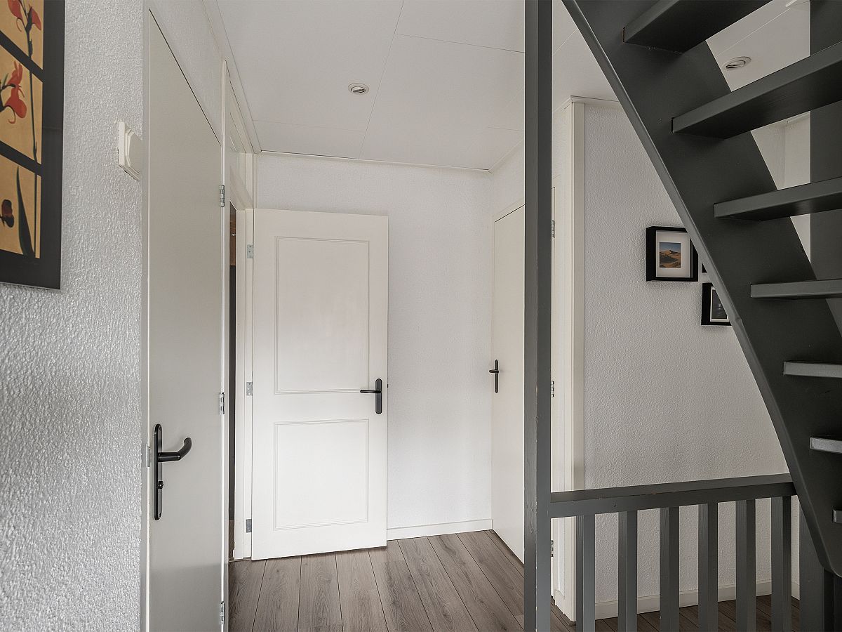overloop; 1e slaapkamer aan achterzijde voorzien van schuifkastenwand en in gebruik als kastenkamer; 2e slaapkamer in gebruik als werkamer; badkamer (2019) met lichte grijze en mat witte betegeling en voorzien van inloopdouche, wastafelmeubel en 2e toilet; 3e slaapkamer aan voorzijde met schuifkastenwand. De hele verdieping is voorzien van hetzelfde laminaat, hardhouten kozijnen met dubbel glas en horren.