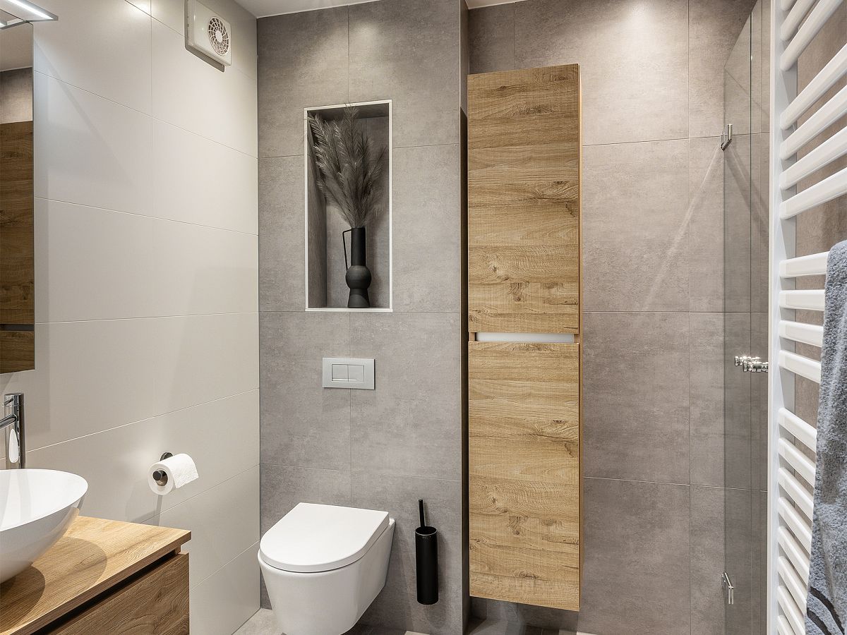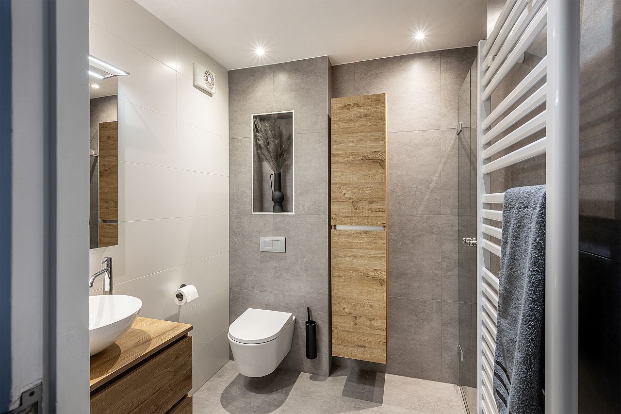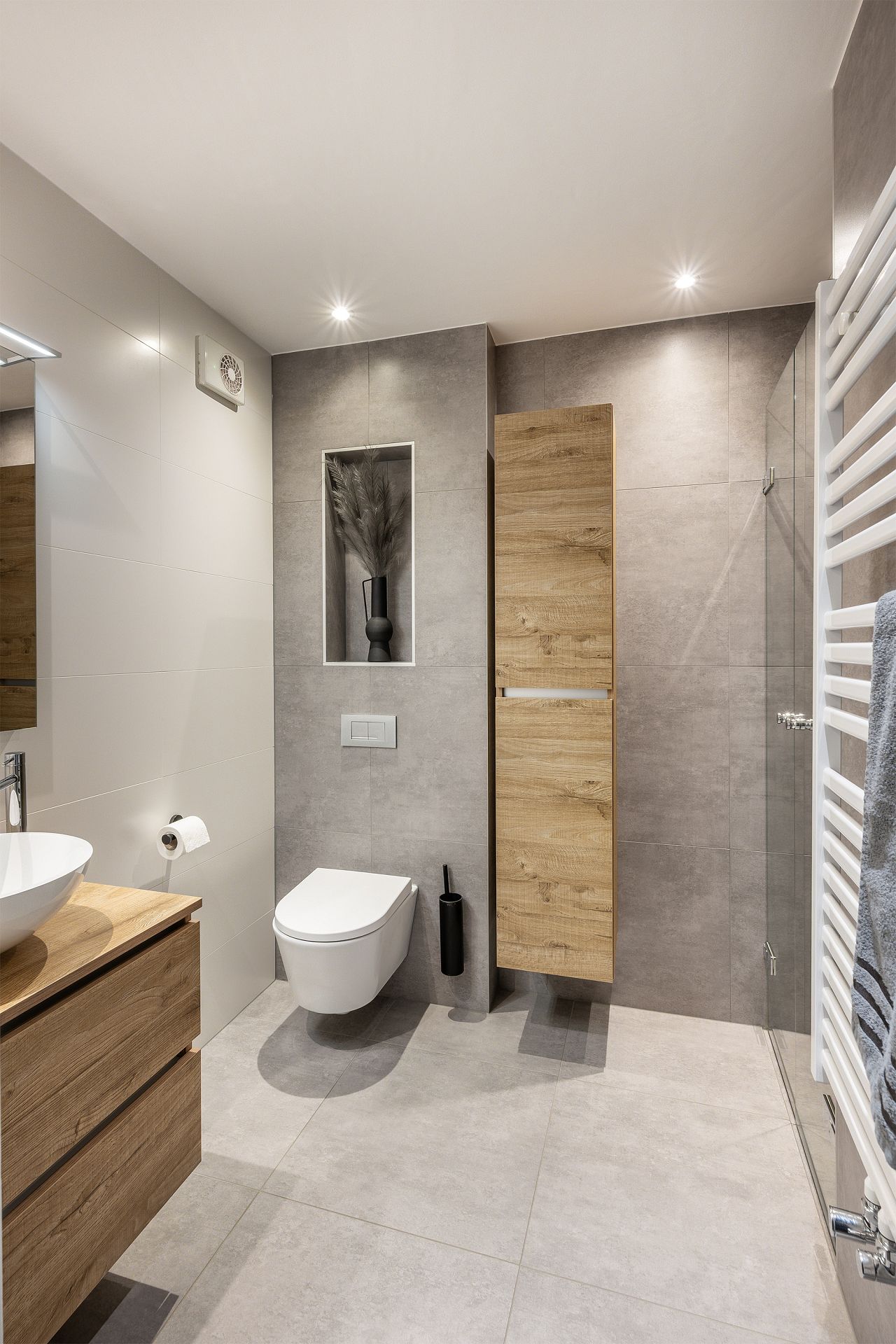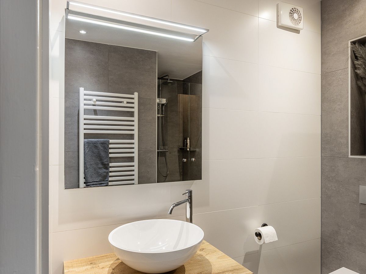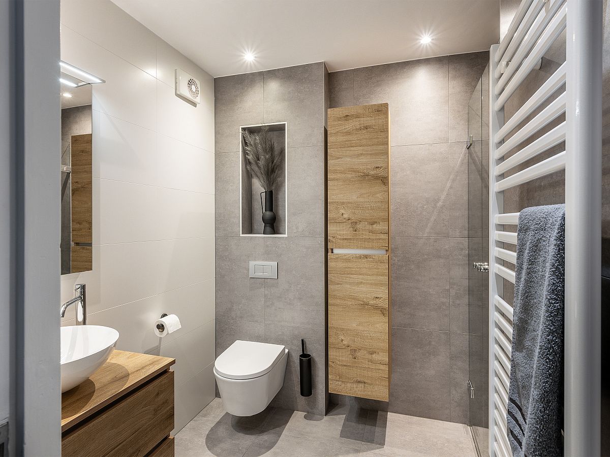 overloop; 1e slaapkamer aan achterzijde voorzien van schuifkastenwand en in gebruik als kastenkamer; 2e slaapkamer in gebruik als werkamer; badkamer (2019) met lichte grijze en mat witte betegeling en voorzien van inloopdouche, wastafelmeubel en 2e toilet; 3e slaapkamer aan voorzijde met schuifkastenwand. De hele verdieping is voorzien van hetzelfde laminaat, hardhouten kozijnen met dubbel glas en horren.