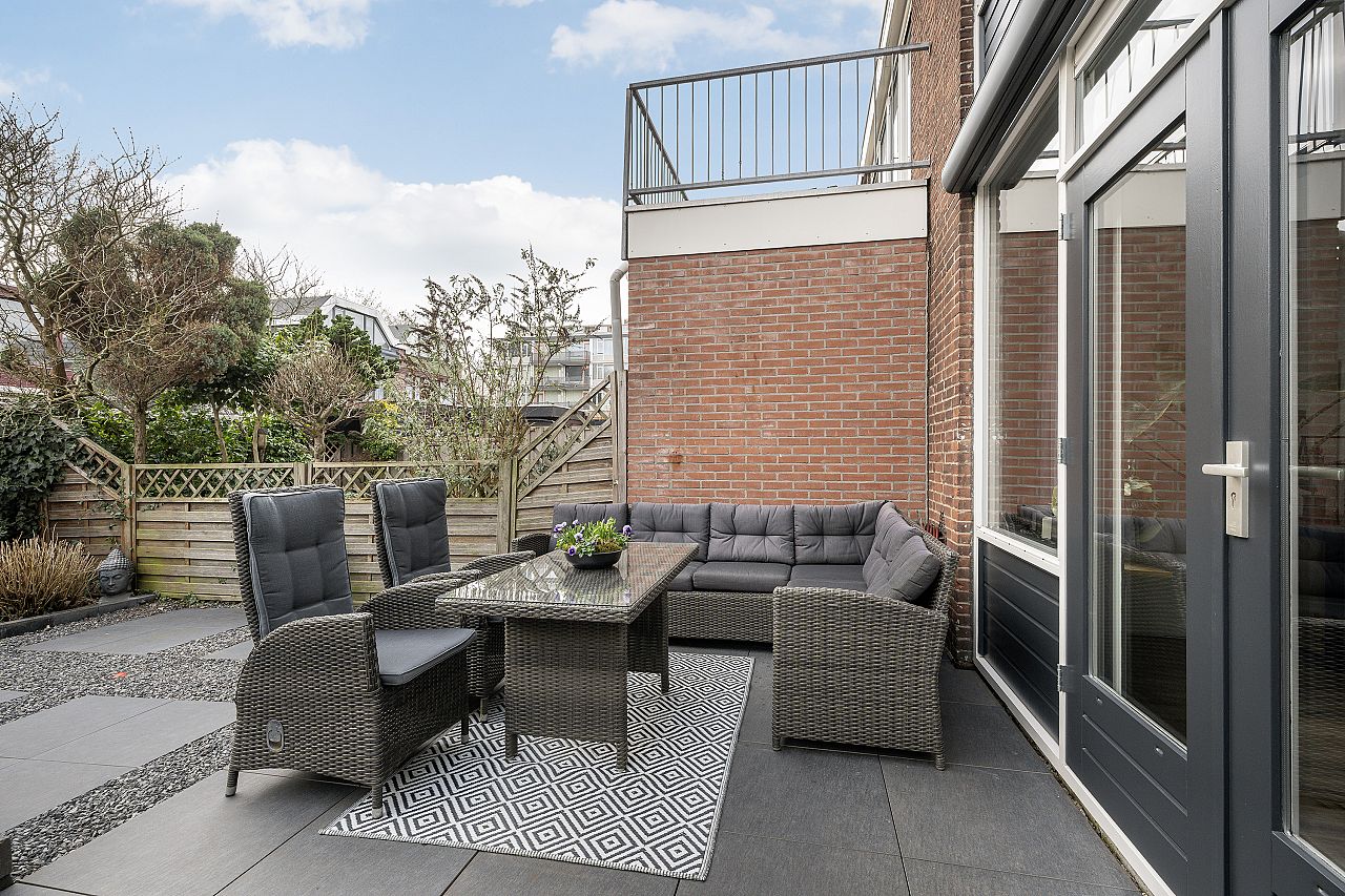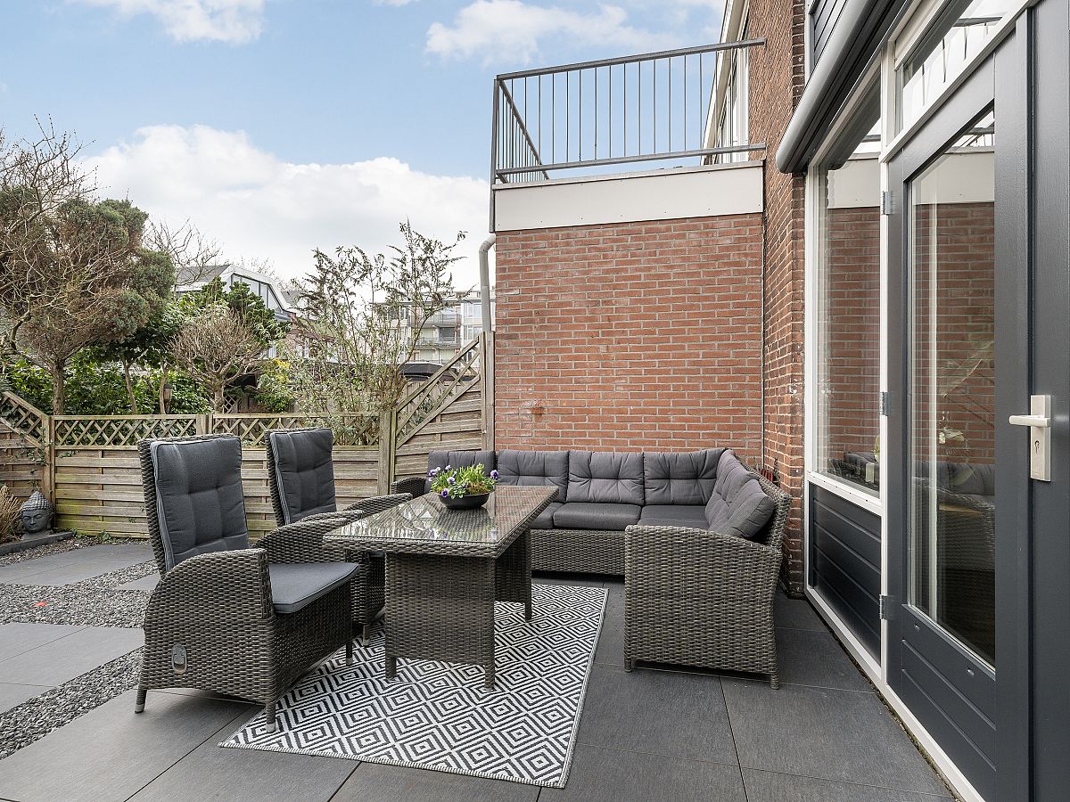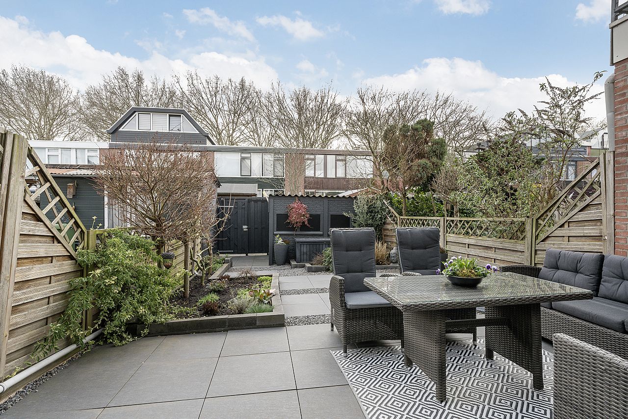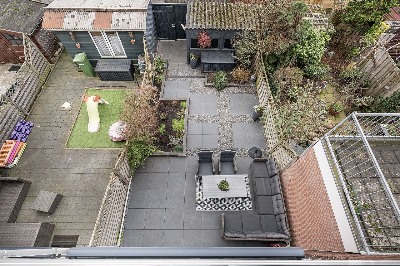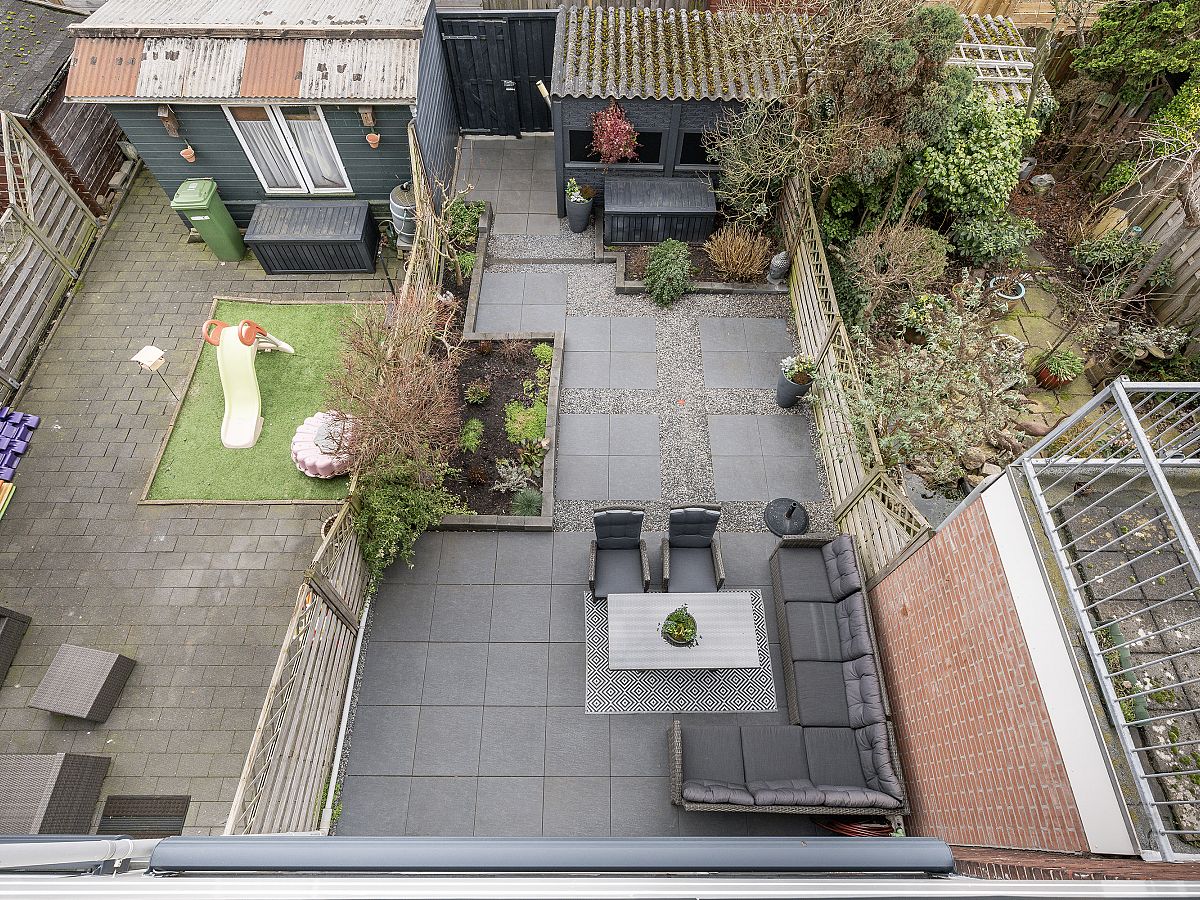 de tuin is op het zuiden gelegen, netjes onderhouden met een stenen berging en een achteruitgang. Tevens is er elektrische zonwering