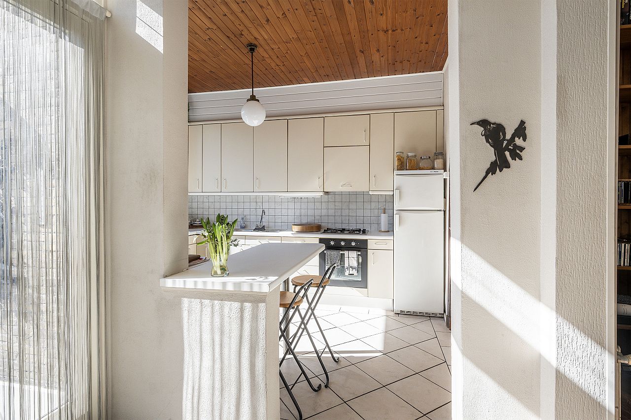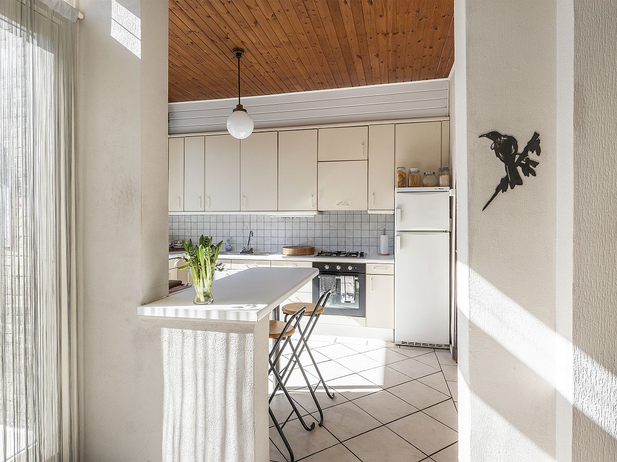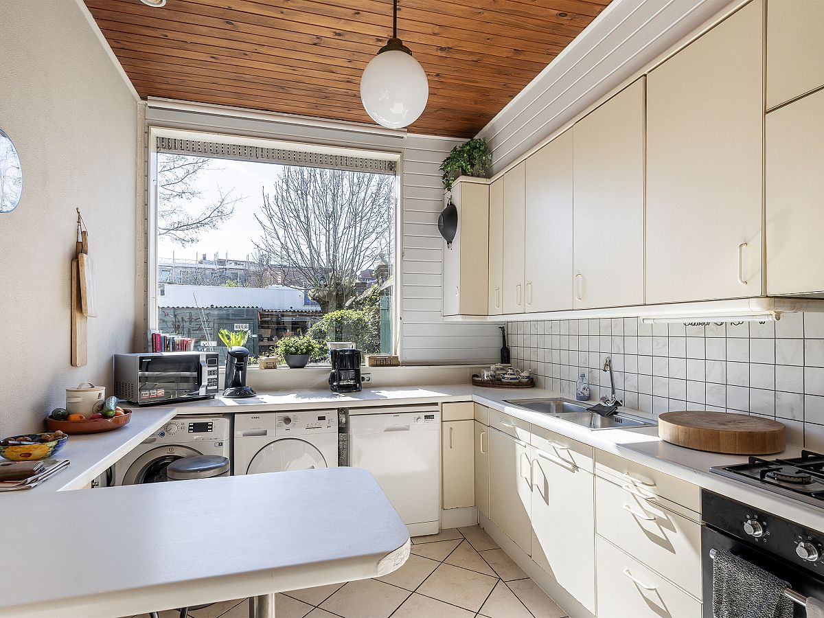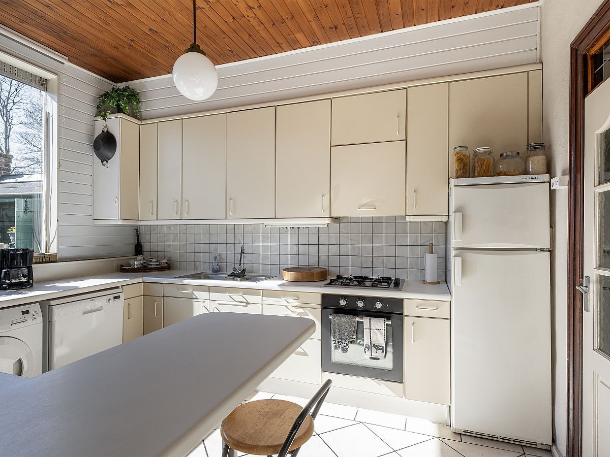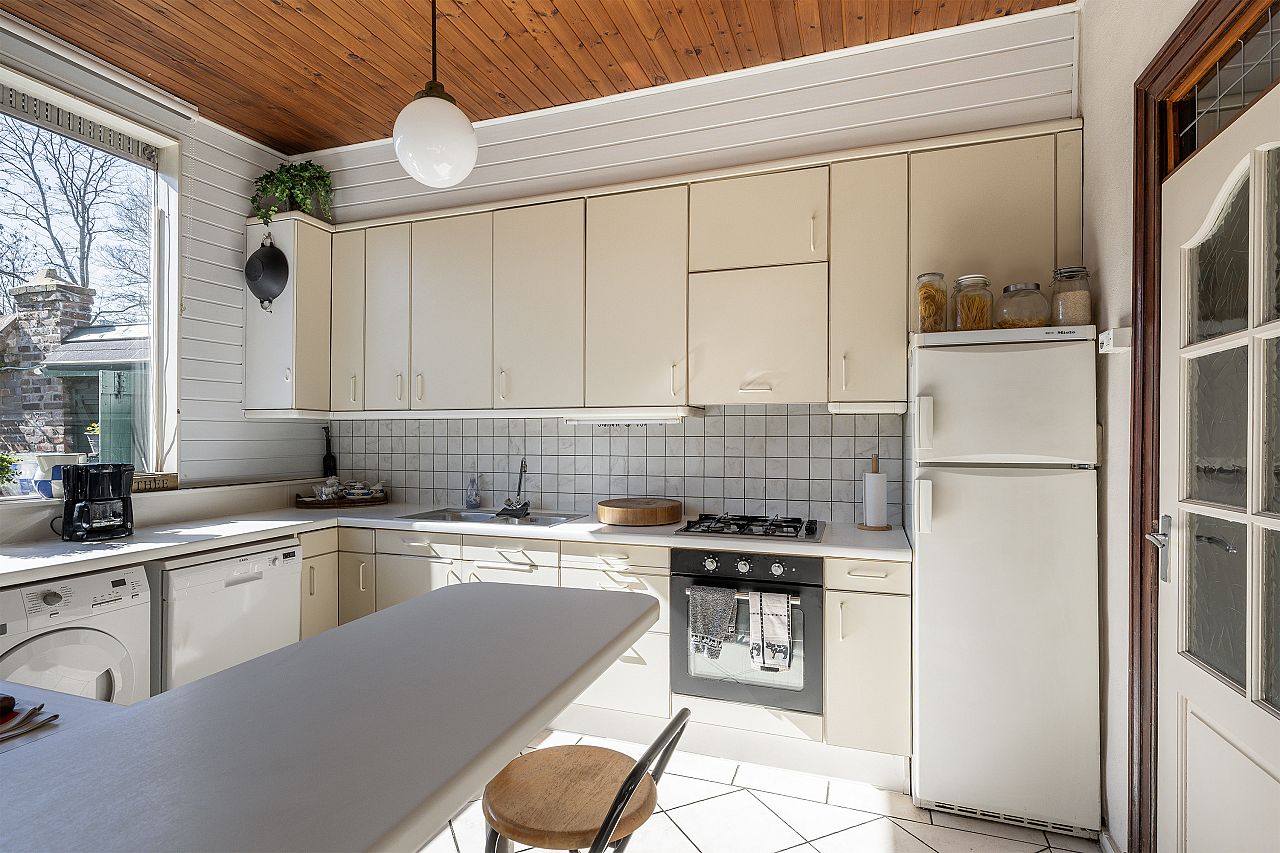 Open keuken met witte frontinrichting en aanrechtblad, voorzien van losse apparatuur en aansluiting voor de wasmachine. De woonkamer is voorzien van houten vloerdelen; originele ramen met houten schuiframen; houtkachel en een marmeren schouw.