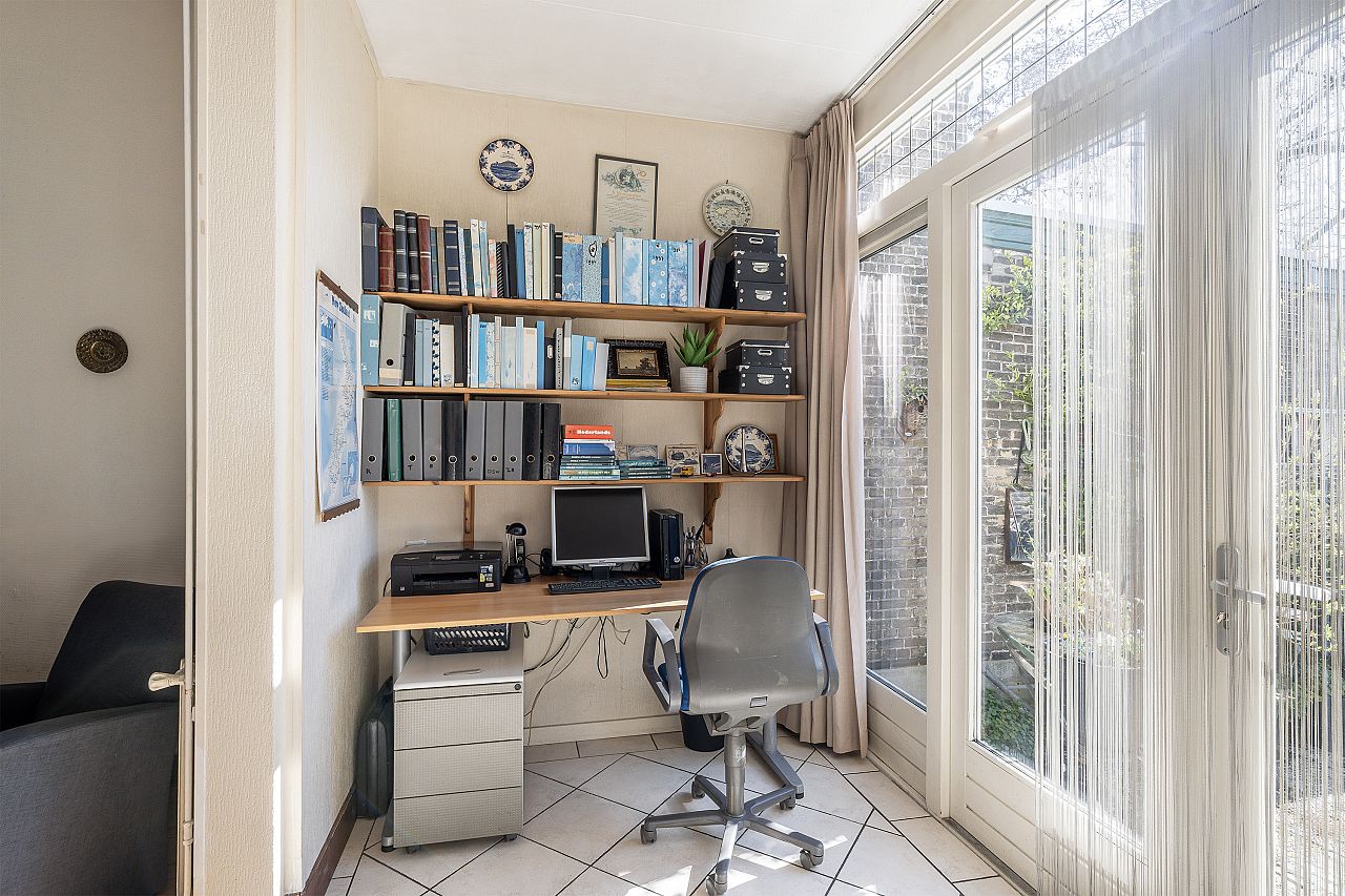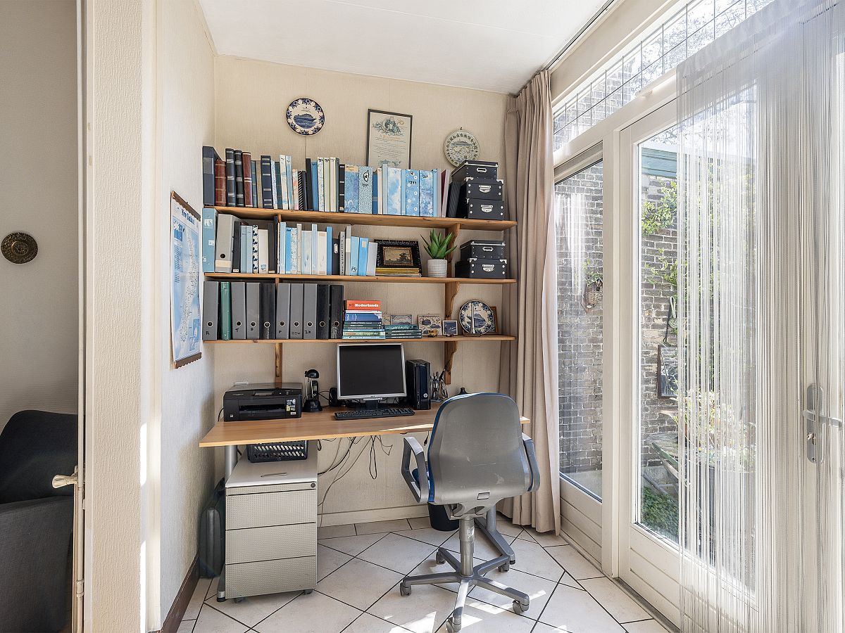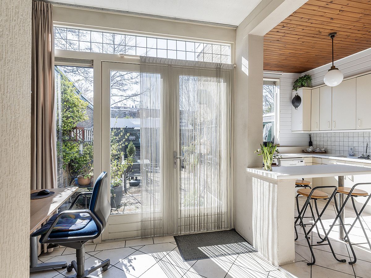 De serre is in gebruik als werkkamer en heeft openslaande deuren naar de achtertuin.