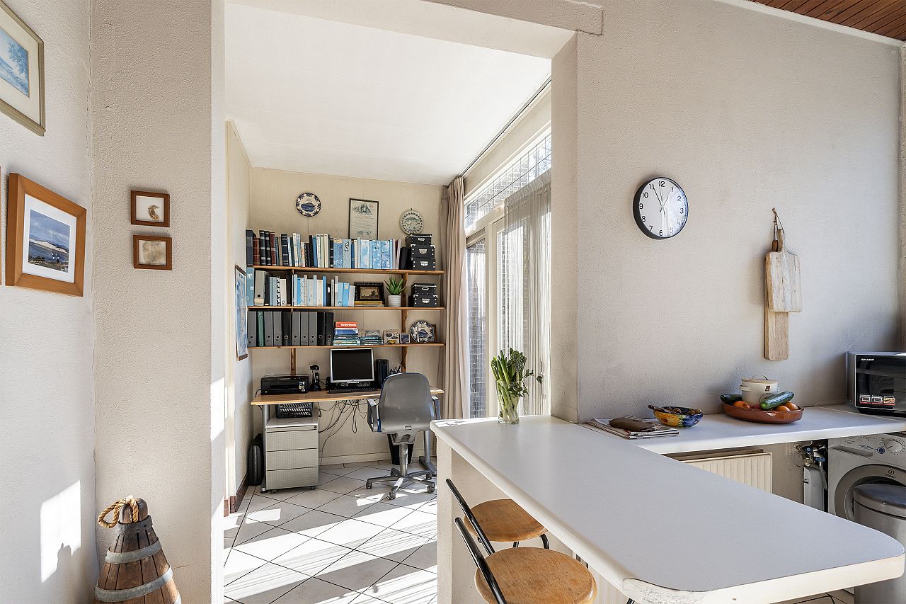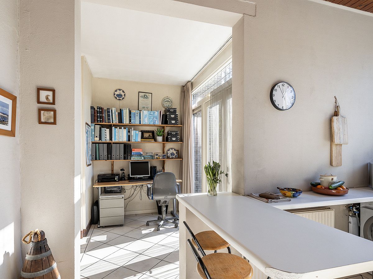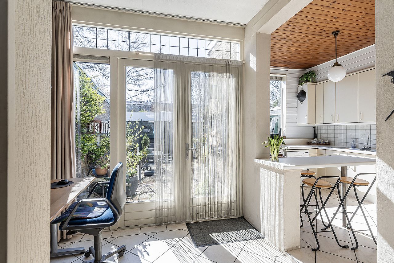 De serre is in gebruik als werkkamer en heeft openslaande deuren naar de achtertuin.