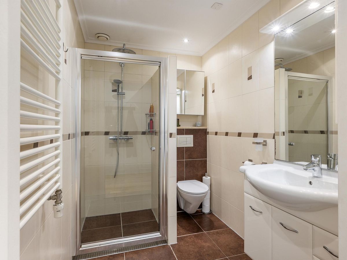 In de gang vind je de overige vertrekken. Zo is er een ruime slaapkamer met een verlaagd plafond met inbouwspots en een complete moderne badkamer. De badkamer heeft beige/bruine betegeling en is voorzien van een ruime douchehoek met een glazen deur, een zwevend toilet, een designradiator, ventilatie en een wastafelmeubel met veel opbergruimte.
