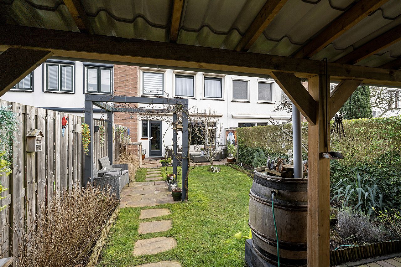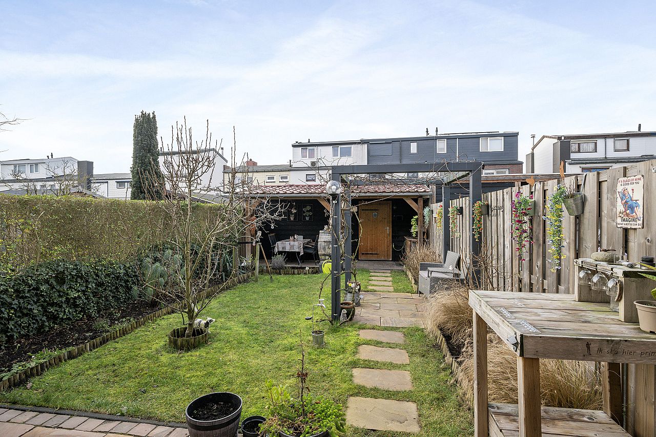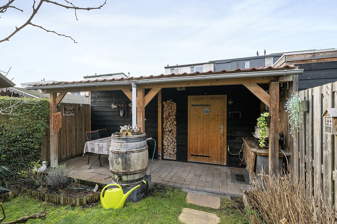 de zonnige achtertuin is ruim en op het zuidwesten gelegen. Voorzien van electrische zonwering; zeer ruime schuur met gezellig overkapping.