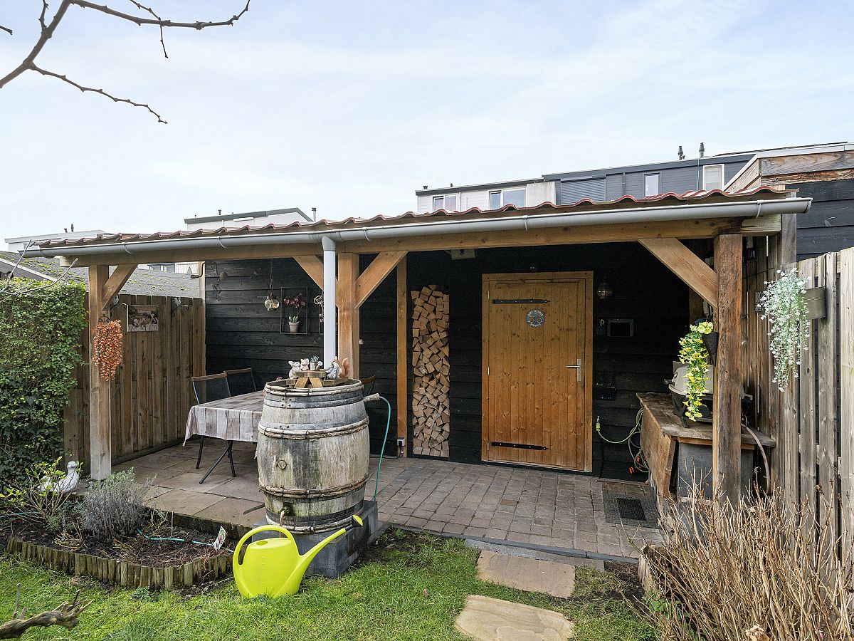 In de tuin is een gezellige open keuken met overkapping. Zeer royale chalet/schuur.