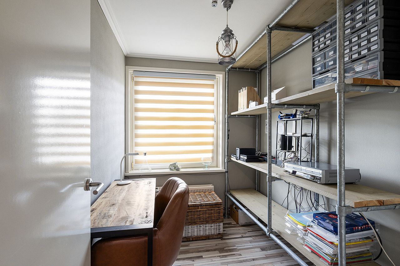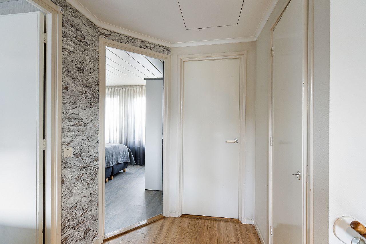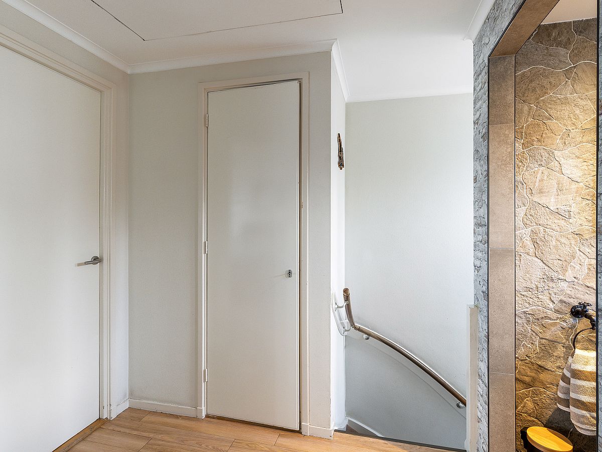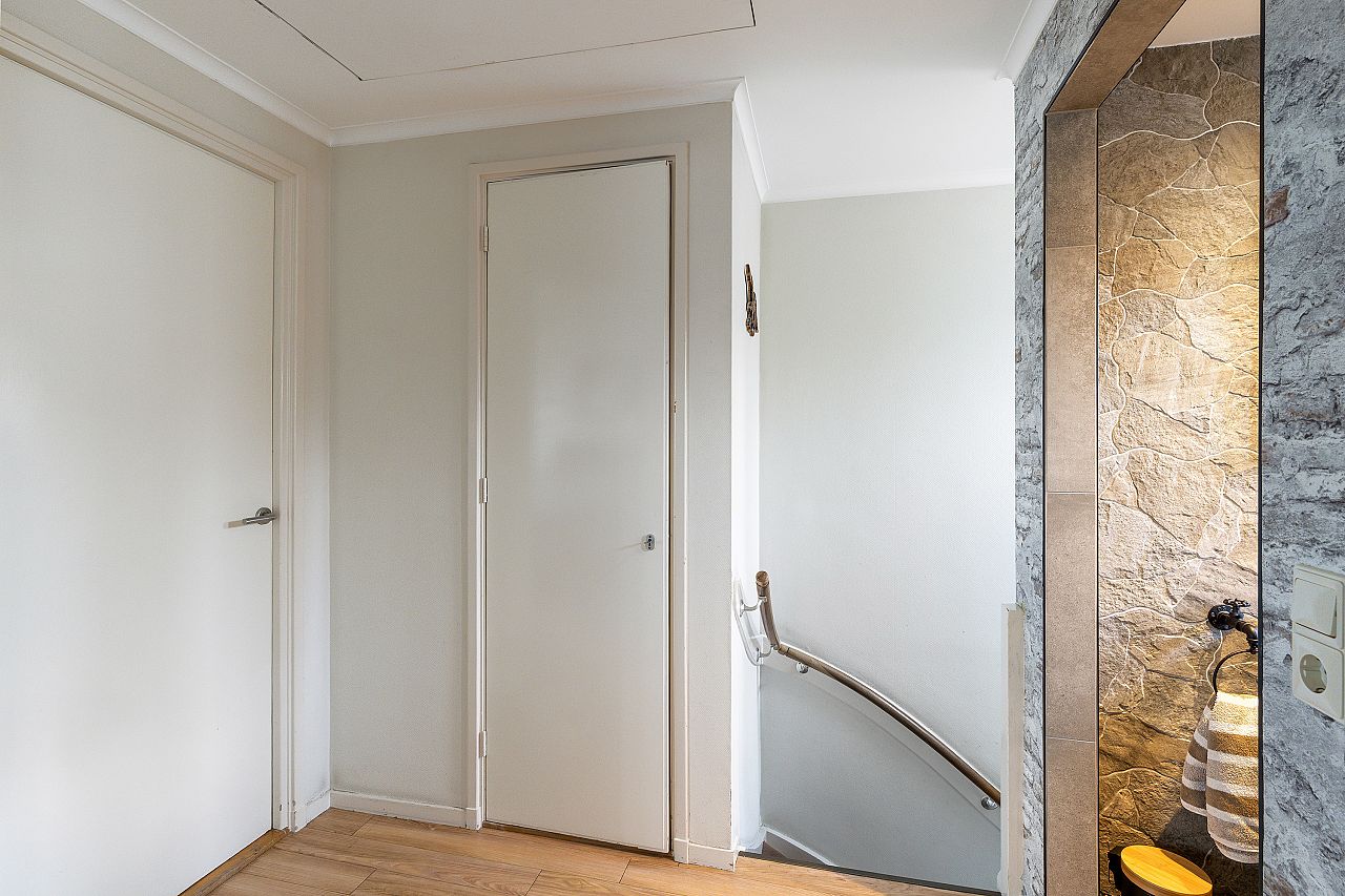 overloop met vaste kast alwaar de wasmachine aansluiting en de cv combiketel (Vaillant 2013); de badkamer is licht met vloerverwarming en voorzien van douchehoek, badkamermeubel, 2e toilet, inbouwspots en in 2025 vernieuwd; voorslaapkamer in gebruik als werkkamer; achter/ouderslaapkamer en 2e achterslaapkamer met vaste kast; deze verdieping is geheel voorzien van pvc laminaatvloeren, kunststof kozijnen met dubbel glas en electrische rolluiken.