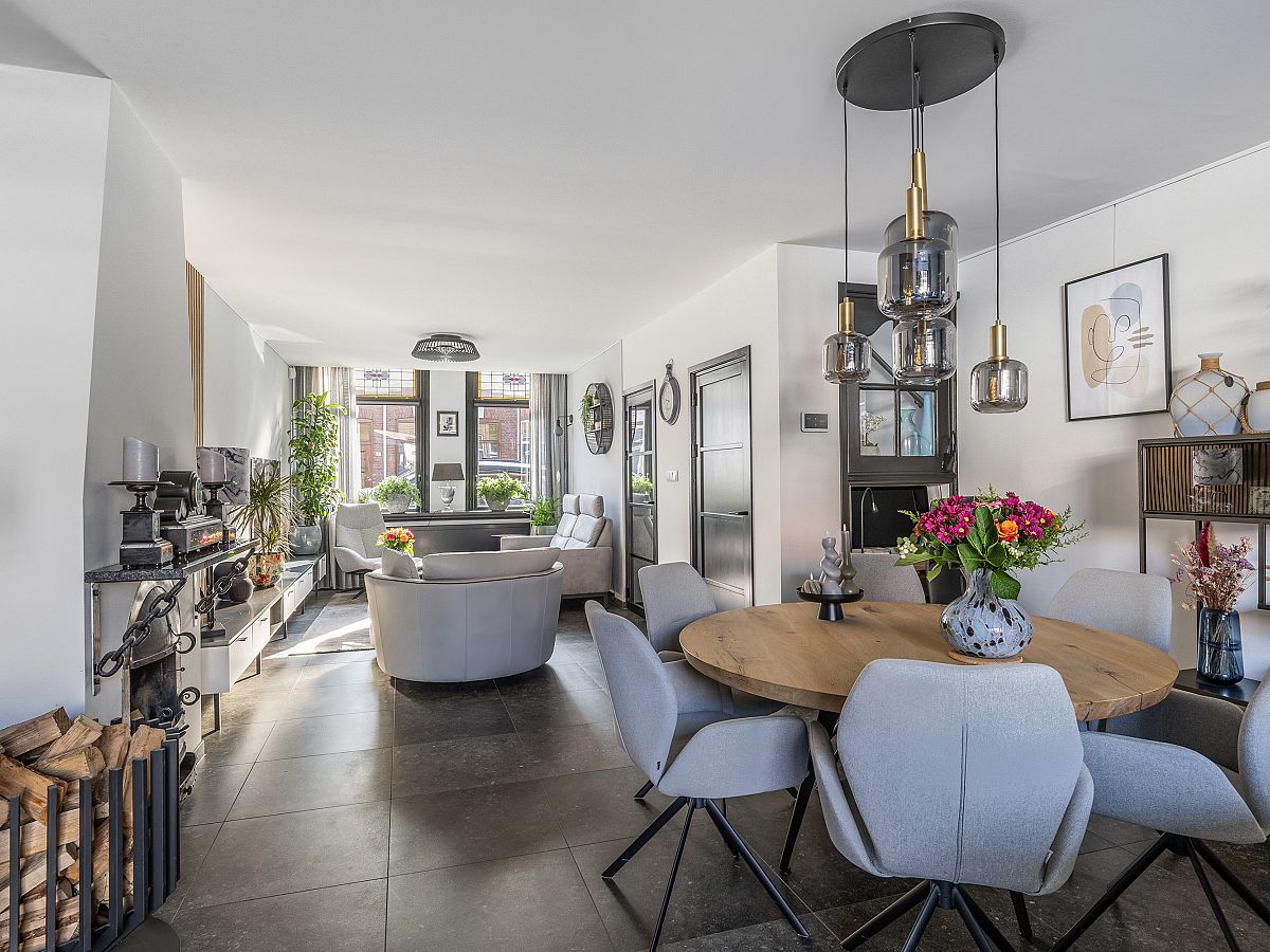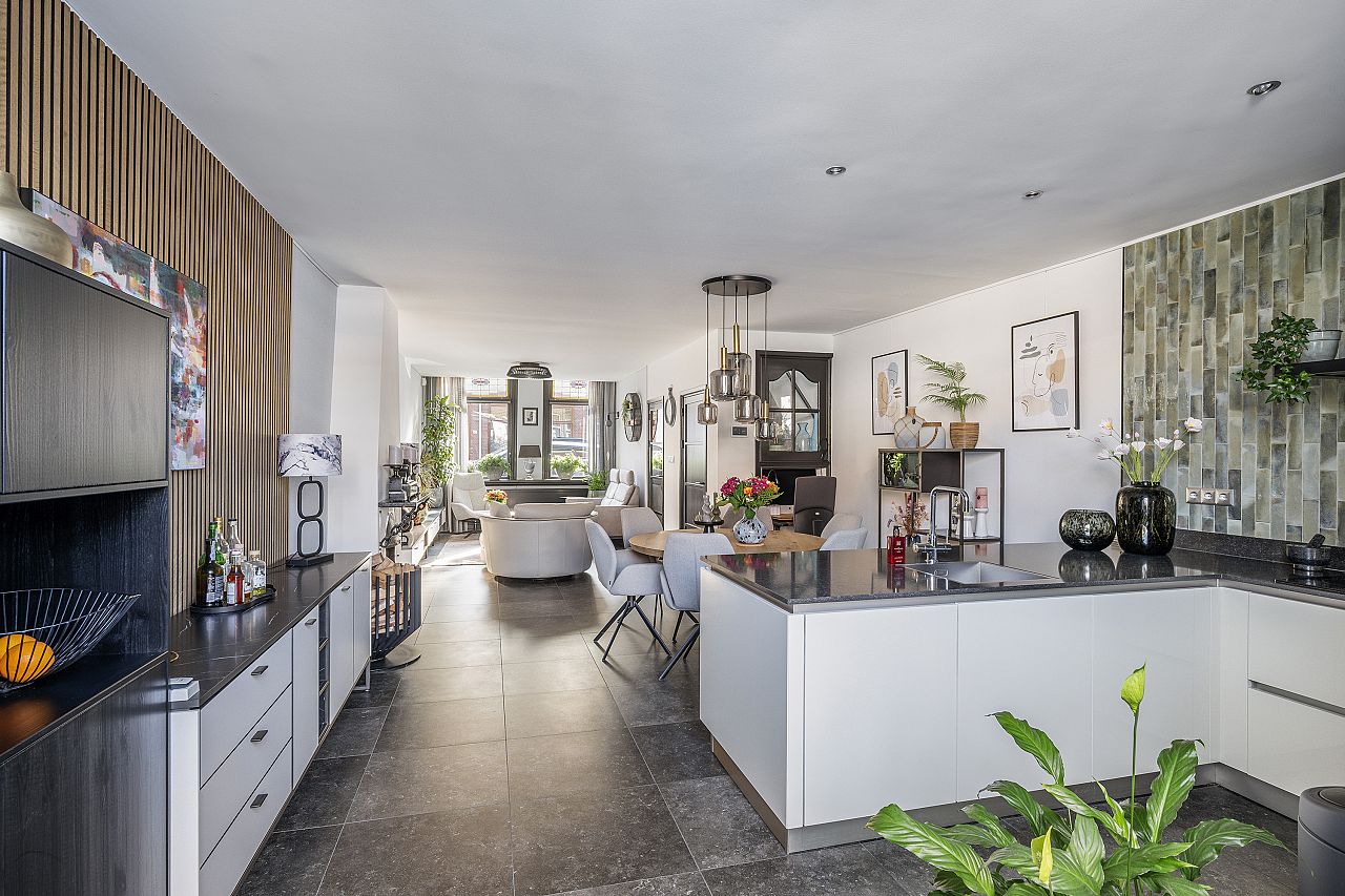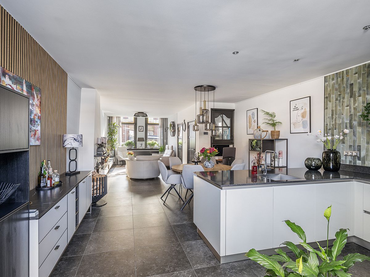 Ruime en lichte woonkamer, voorzien van een prachtige vloer, vloerverwarming en sfeervolle haard. De keuken is aan de achterzijde gelegen en in een L-vorm opgesteld.
