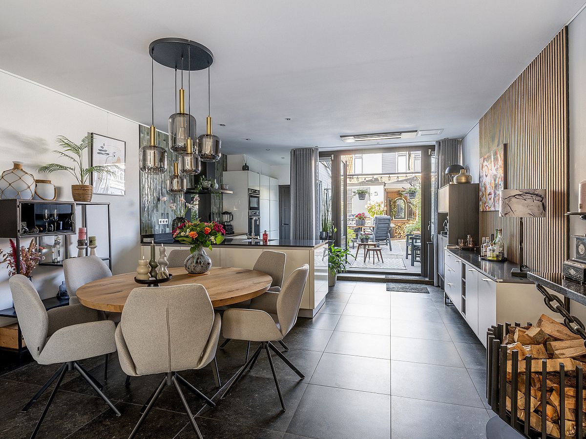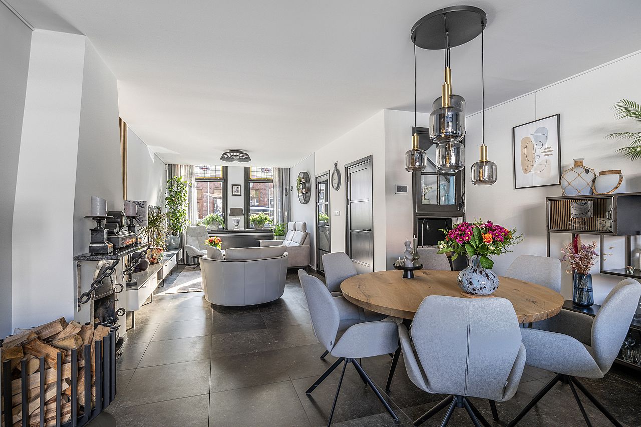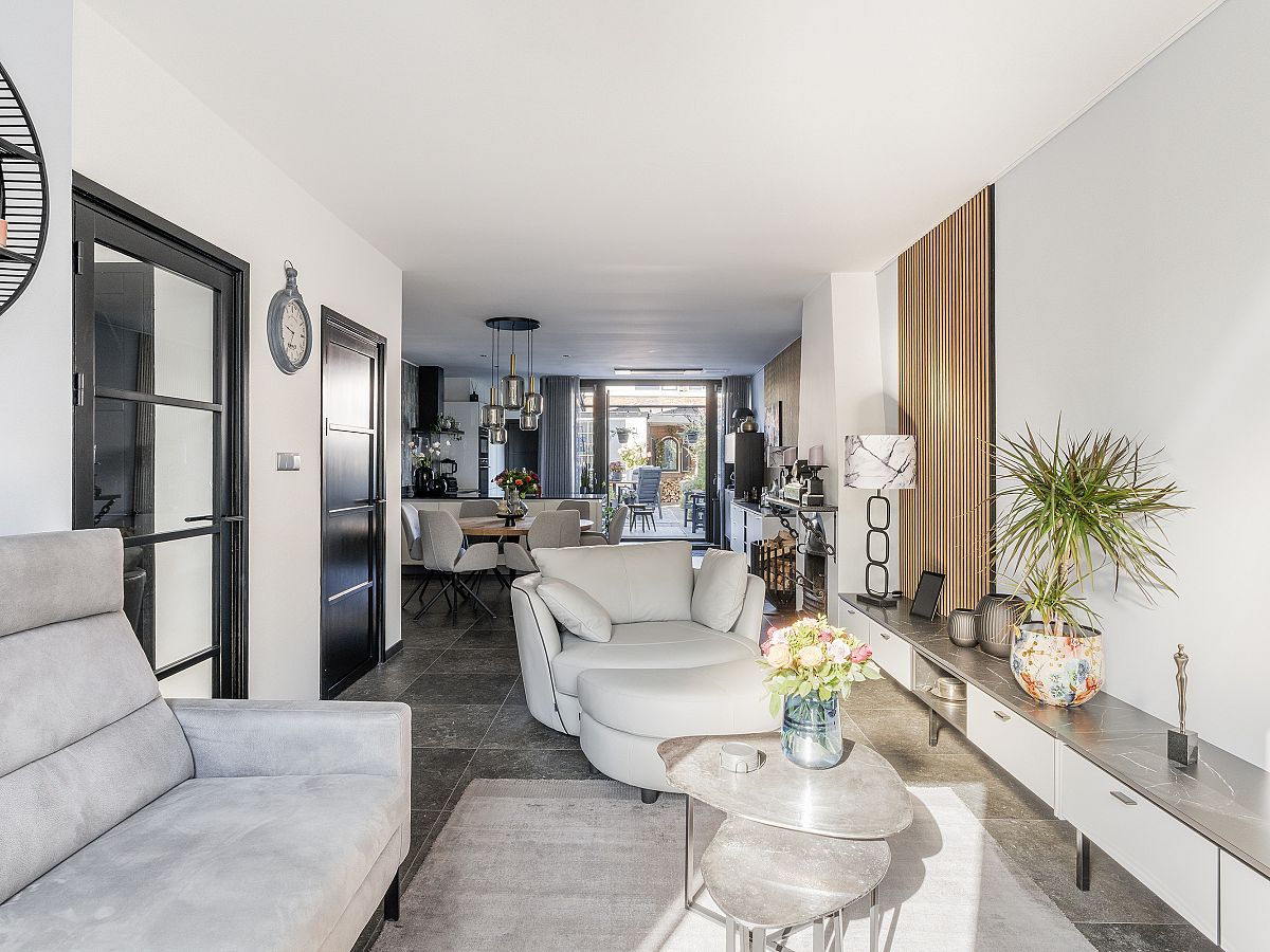 Ruime en lichte woonkamer, voorzien van een prachtige vloer, vloerverwarming en sfeervolle haard. De keuken is aan de achterzijde gelegen en in een L-vorm opgesteld.