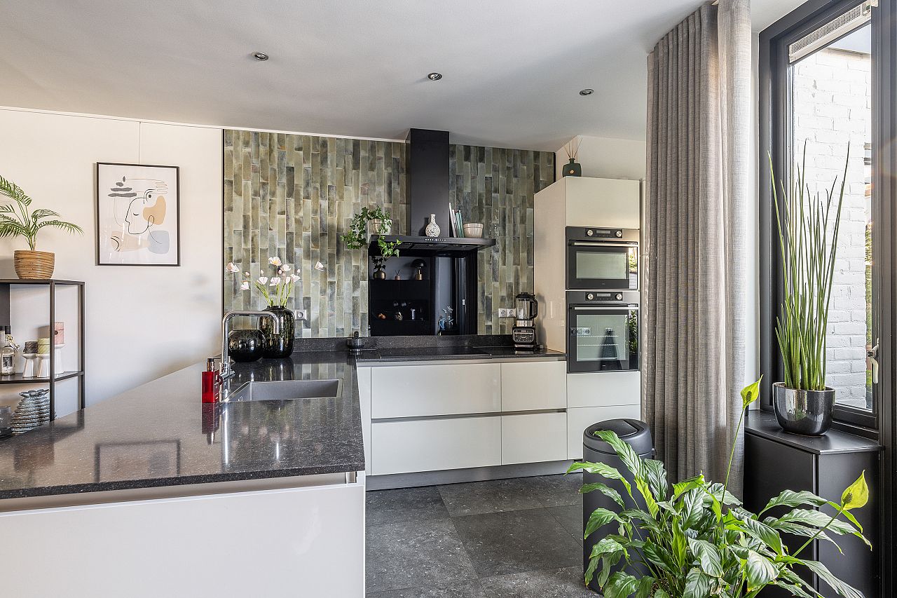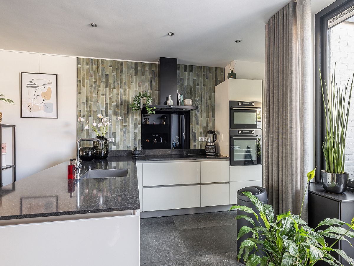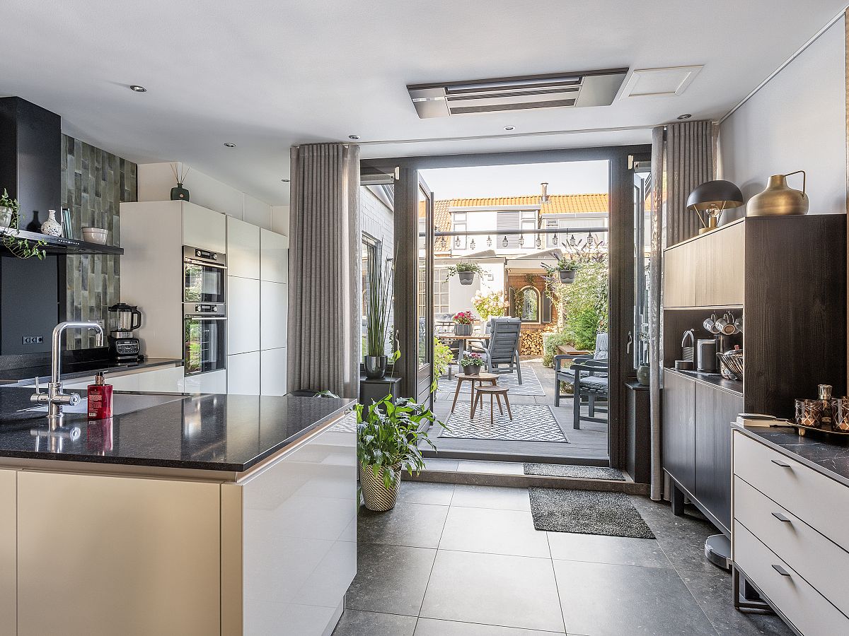 De lichte fronten, het composiet aanrechtblad en diverse inbouwapparatuur (vaatwasser, 4-pits inductie, afzuigkap, heteluchtoven, combimagnetron, koel-vriescombinatie en kokend waterkraan) maken het plaatje af. Achter de keuken vind je een keurige toiletruimte met wandclosetcombinatie en fonteintje.