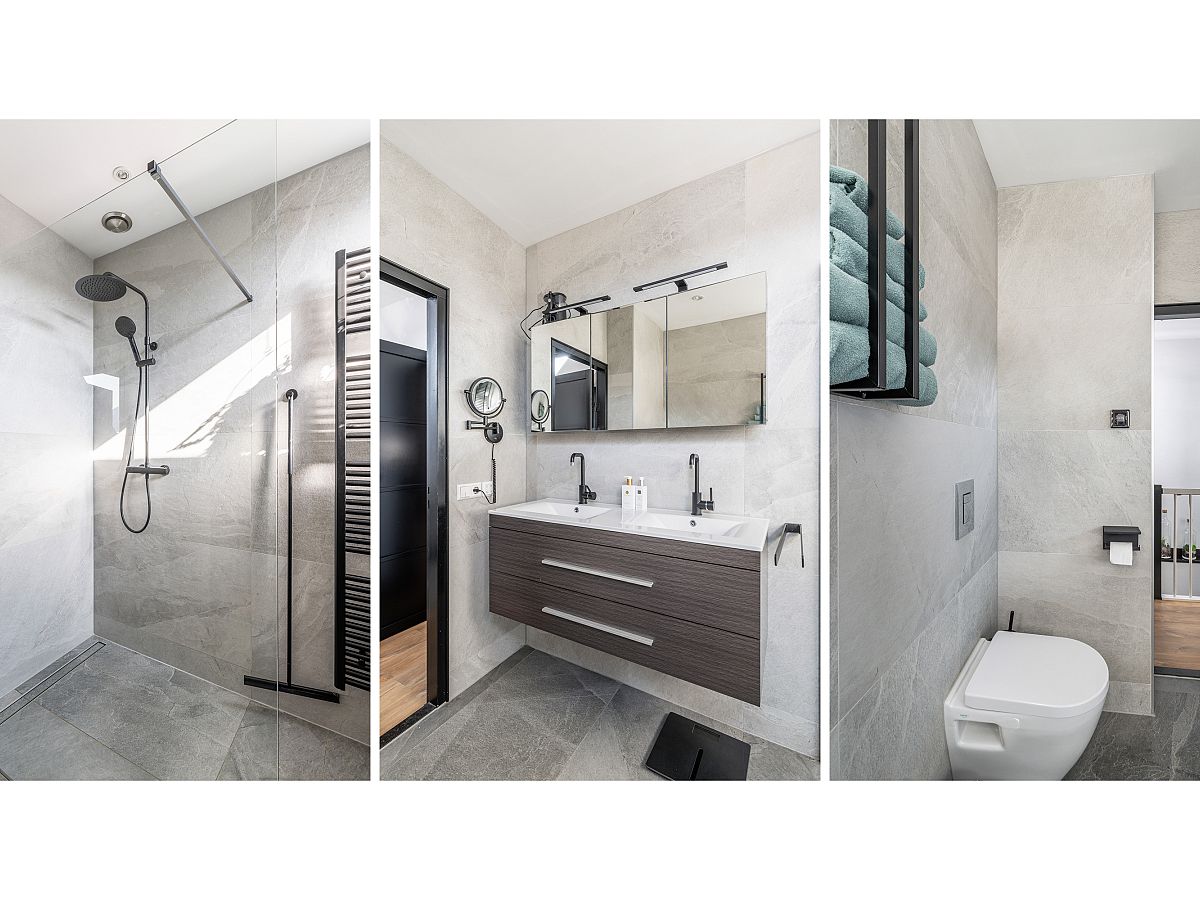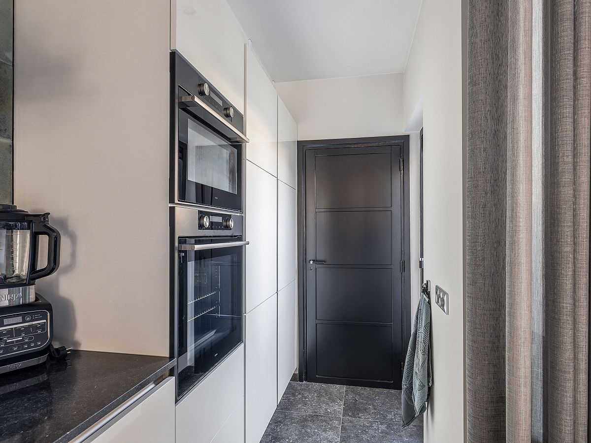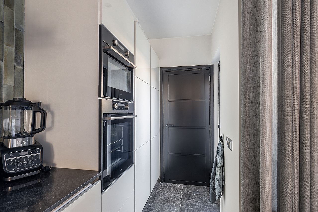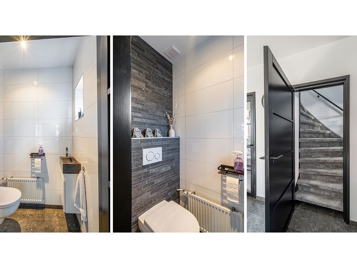 De lichte fronten, het composiet aanrechtblad en diverse inbouwapparatuur (vaatwasser, 4-pits inductie, afzuigkap, heteluchtoven, combimagnetron, koel-vriescombinatie en kokend waterkraan) maken het plaatje af. Achter de keuken vind je een keurige toiletruimte met wandclosetcombinatie en fonteintje.