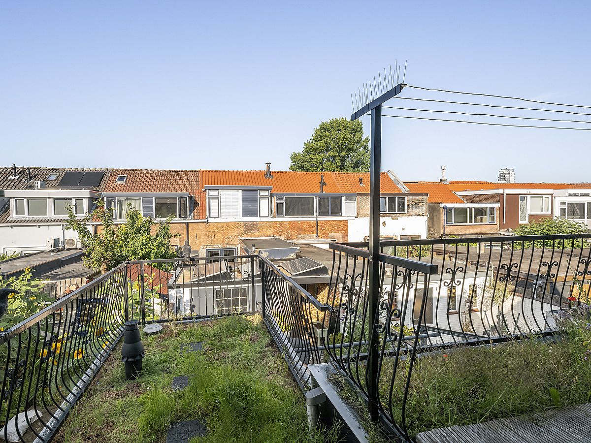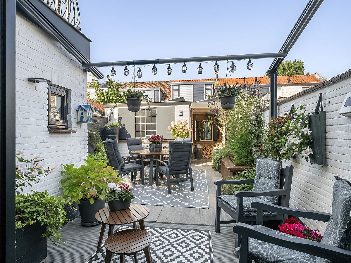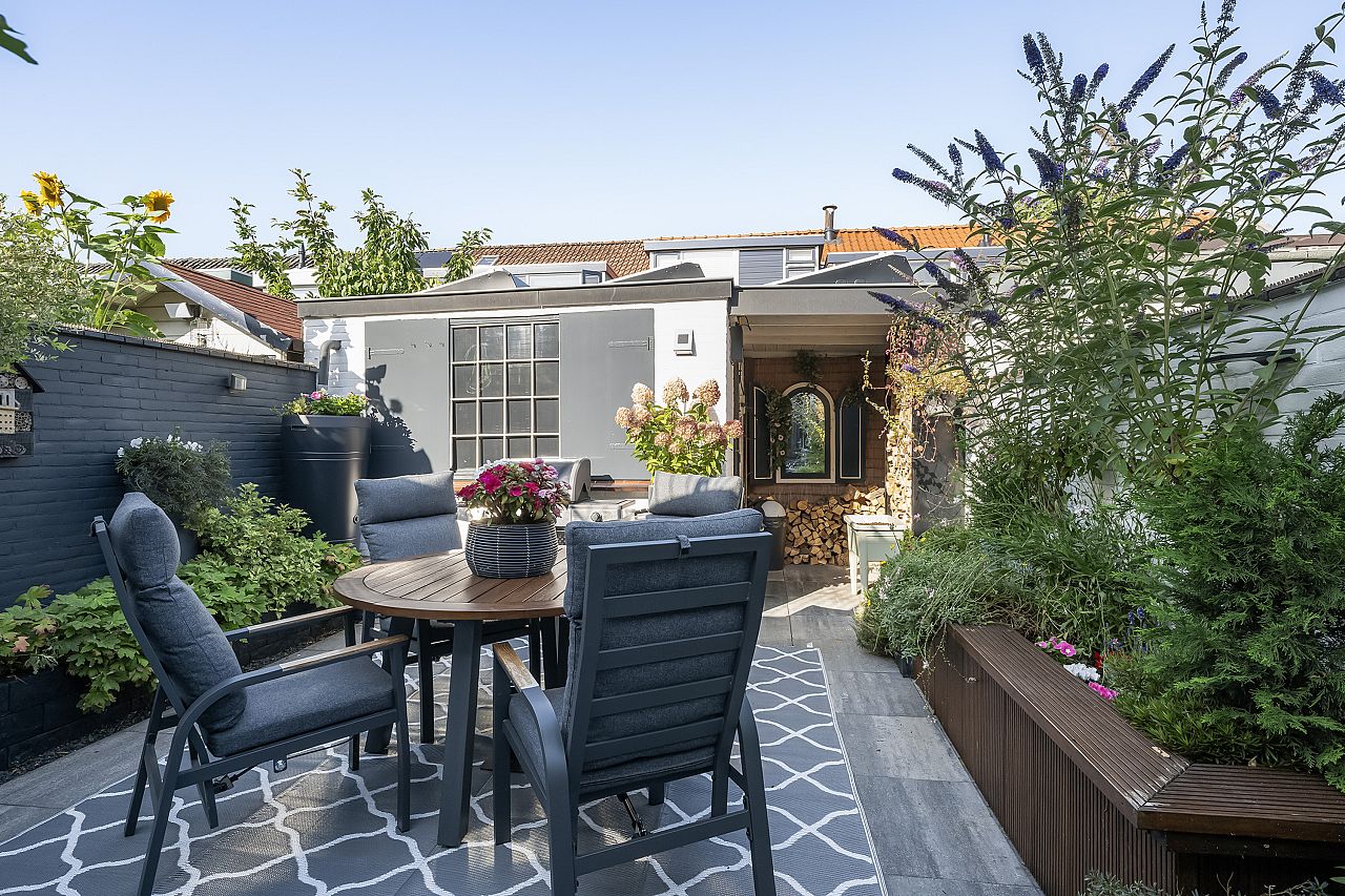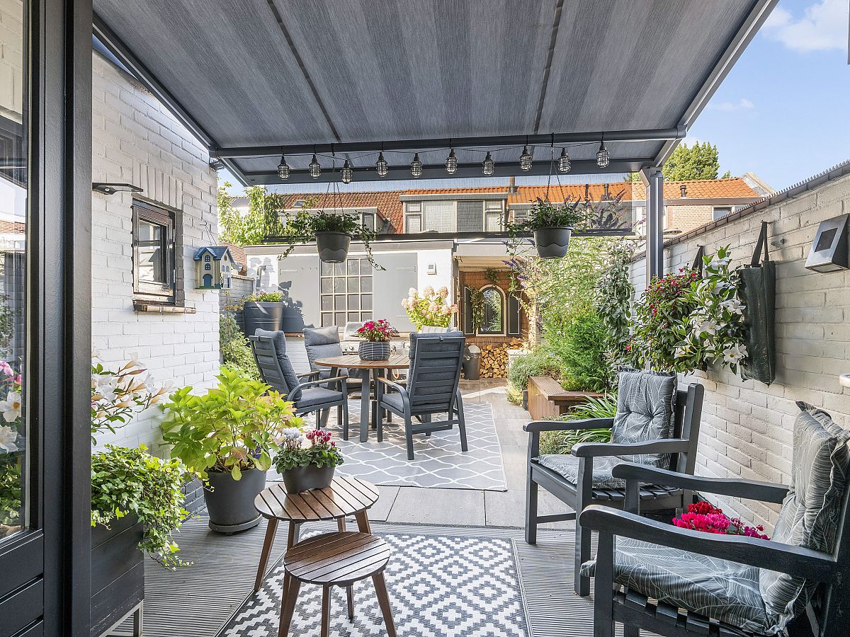 De woning beschikt over een goed onderhouden en sfeervolle achtertuin op de westzijde gelegen. Dit biedt een zonnige plek om van de zomer te genieten. Ook is er zonwering aanwezig. Verder is er een vrijstaande houten berging die voorzien is van verwarming en elektriciteit. De tuin heeft een achterom.