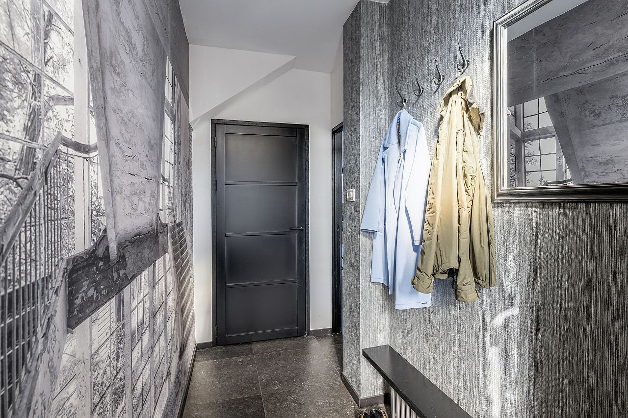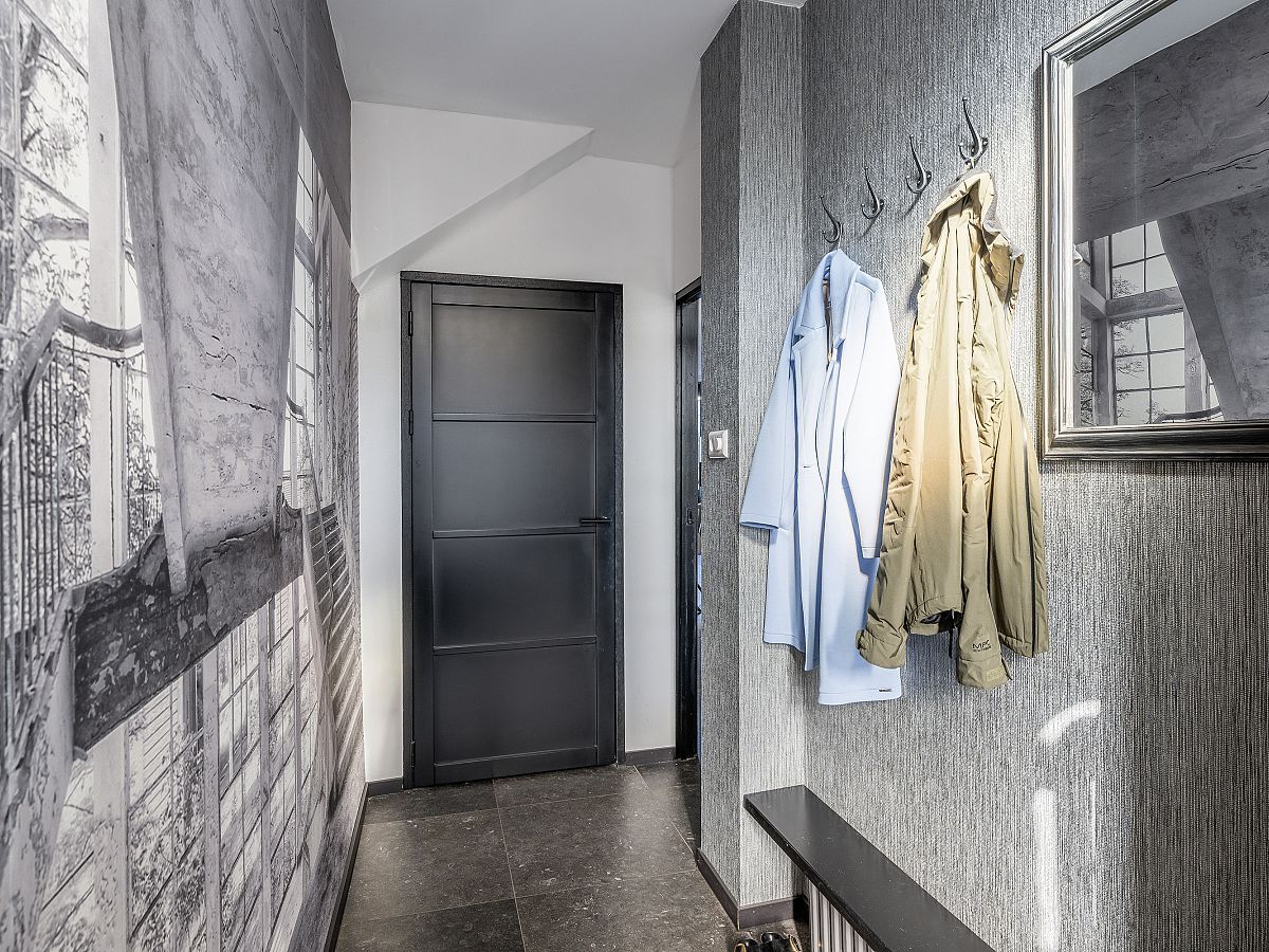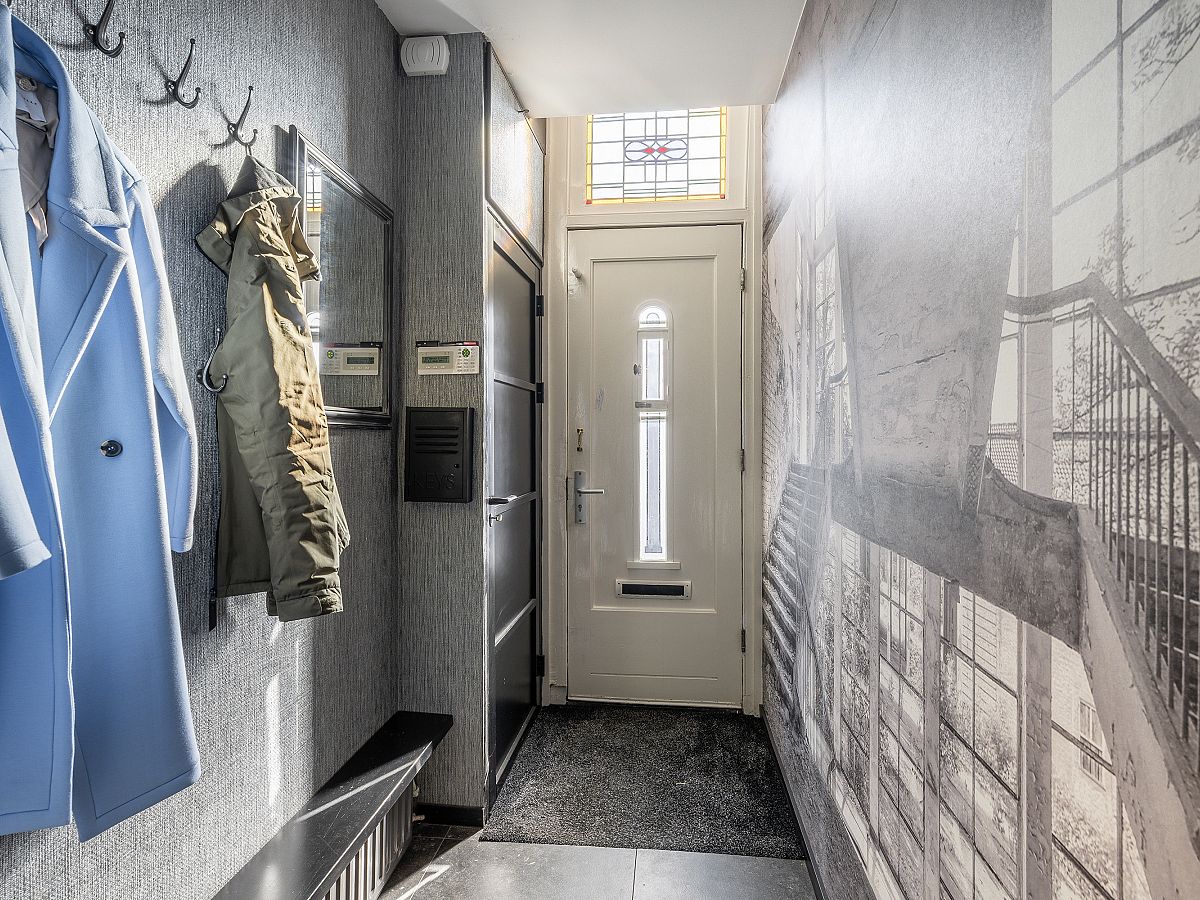 Entree; meterkast (vernieuwd). Strak afgewerkte gang met antracietkleurige plavuizen op de vloer.