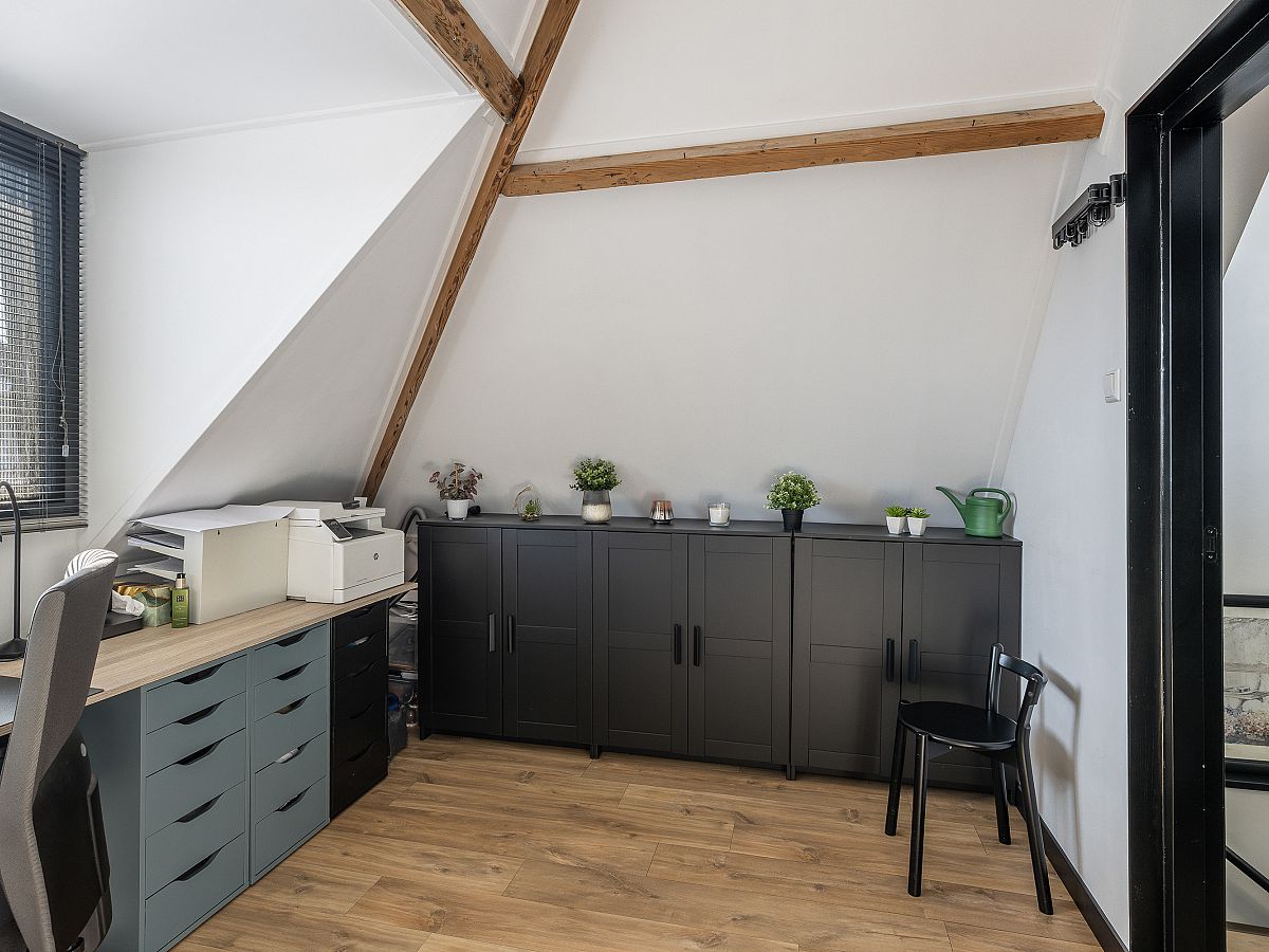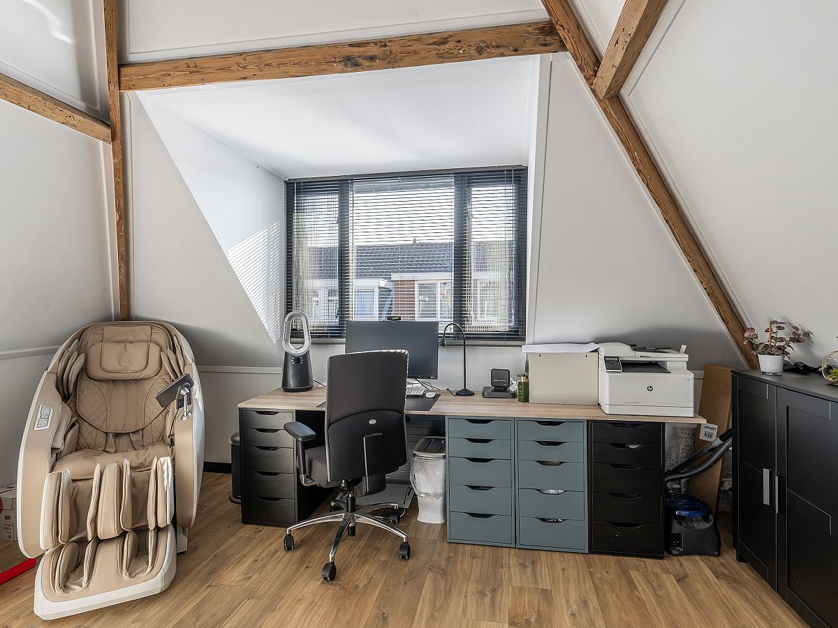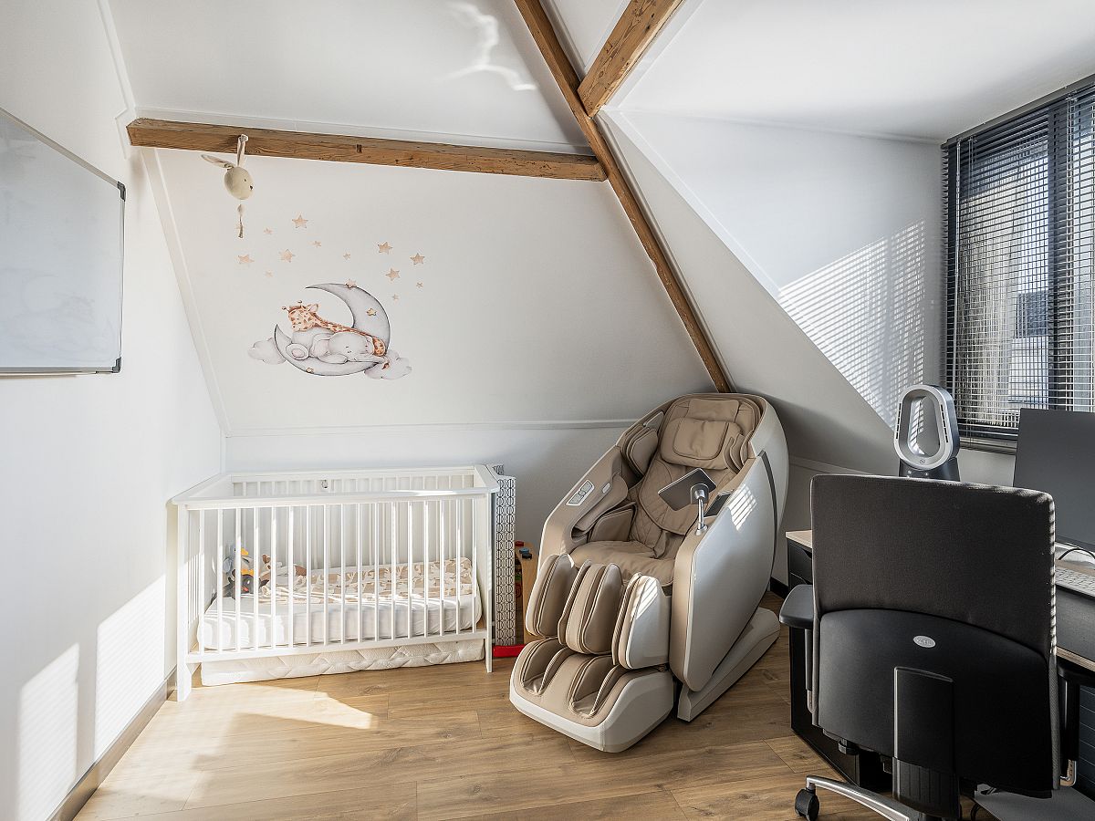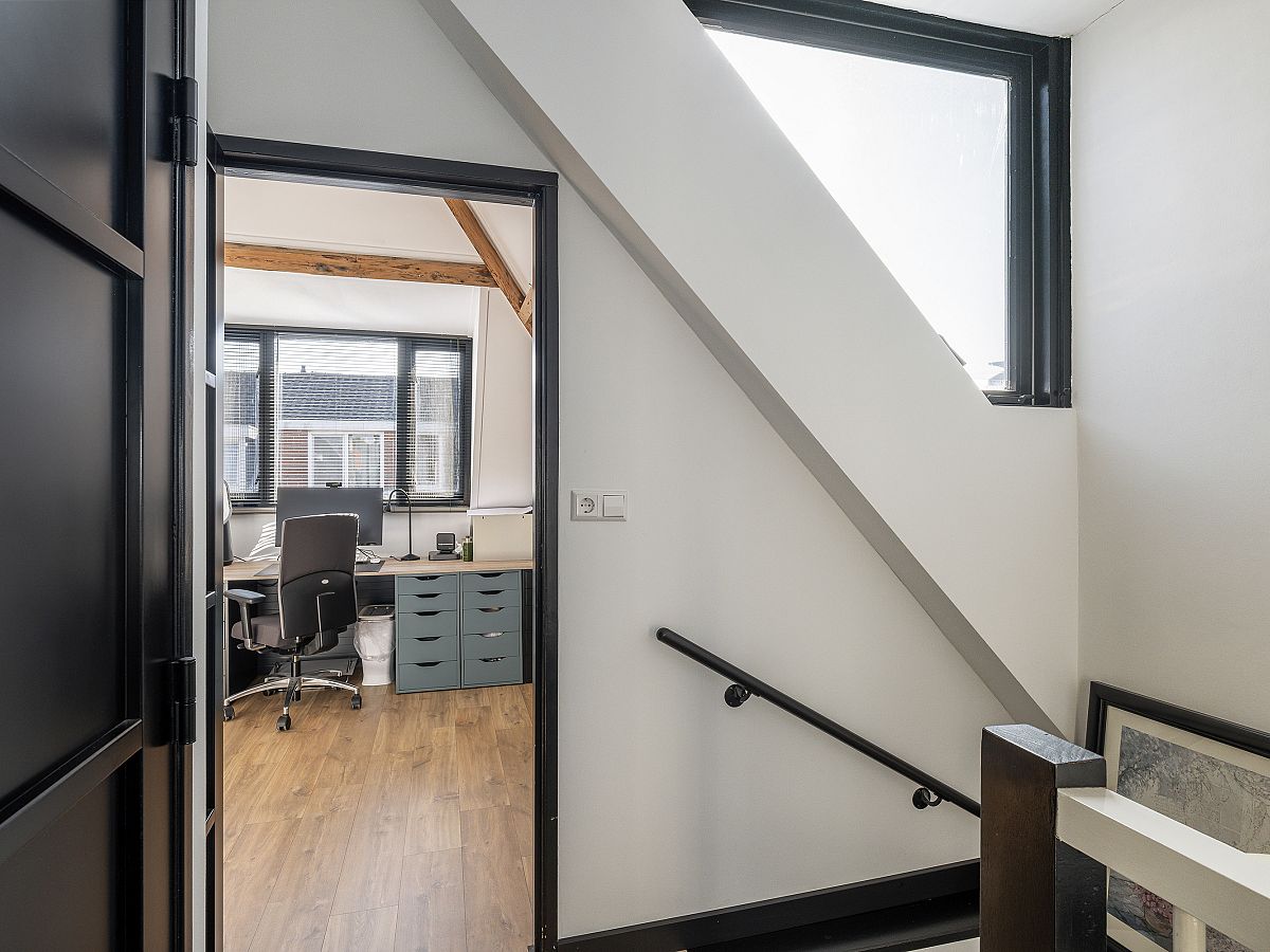 Op de eerste verdieping bevinden zich twee ruime slaapkamers en de badkamer. De voorslaapkamer heeft het originele balkenplafond, een dakkapel met hardhouten kozijnen en dubbele beglazing. De badkamer is uitgerust met een toilet, dubbele wastafel, inloopdouche en vloerverwarming - met grijze betegeling.