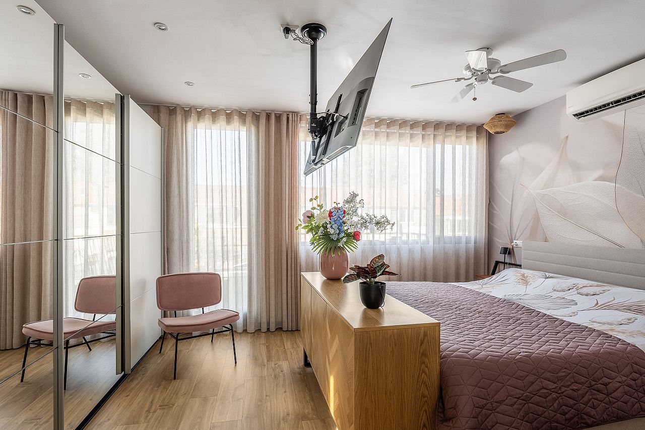 De woonkamer heeft openslaande deuren met horren naar de tuin.