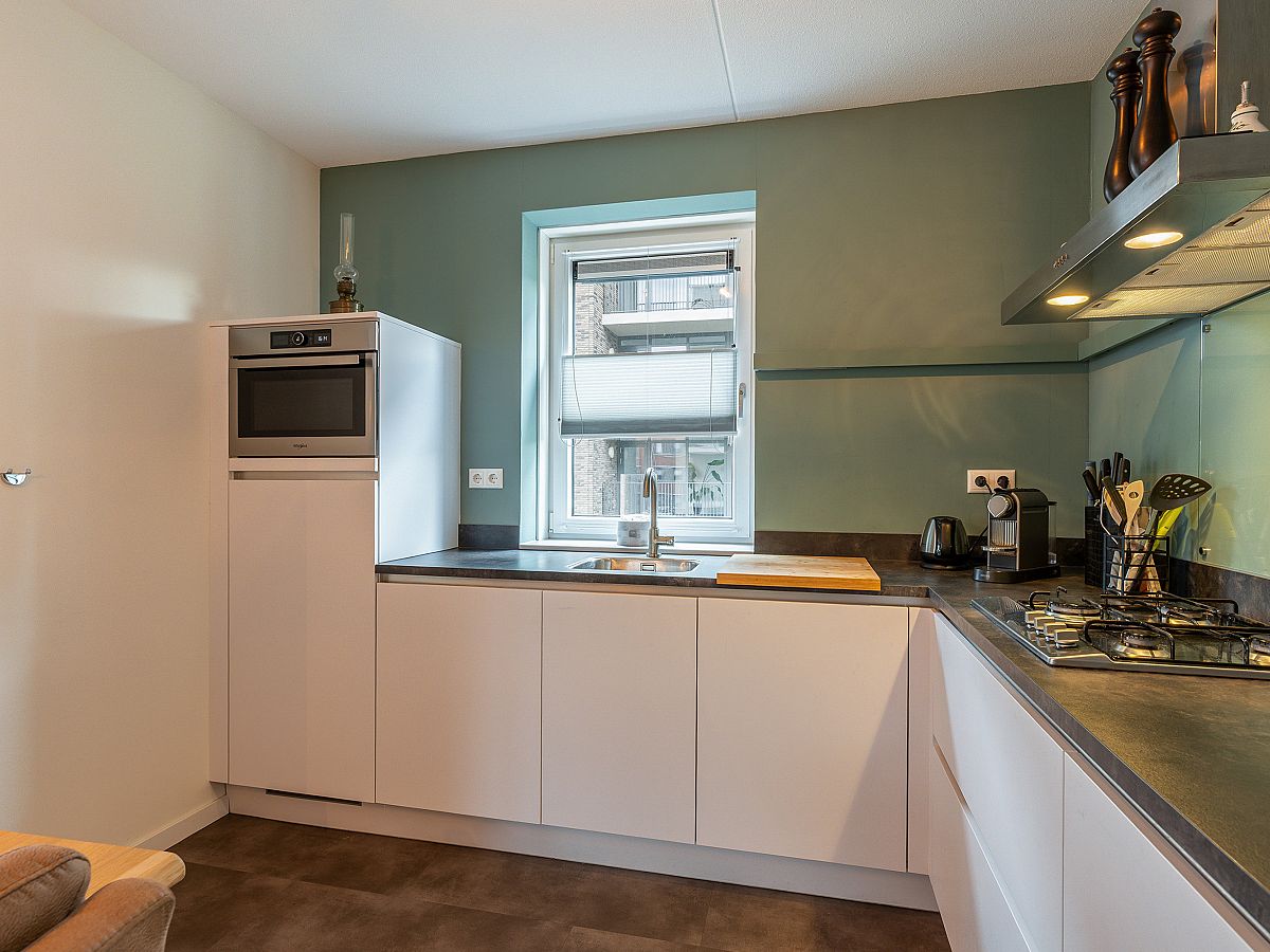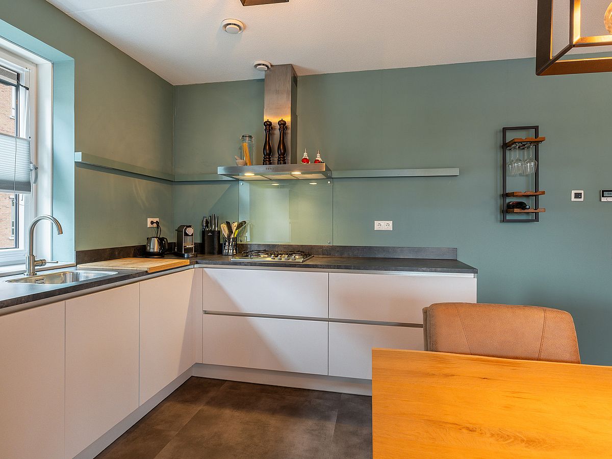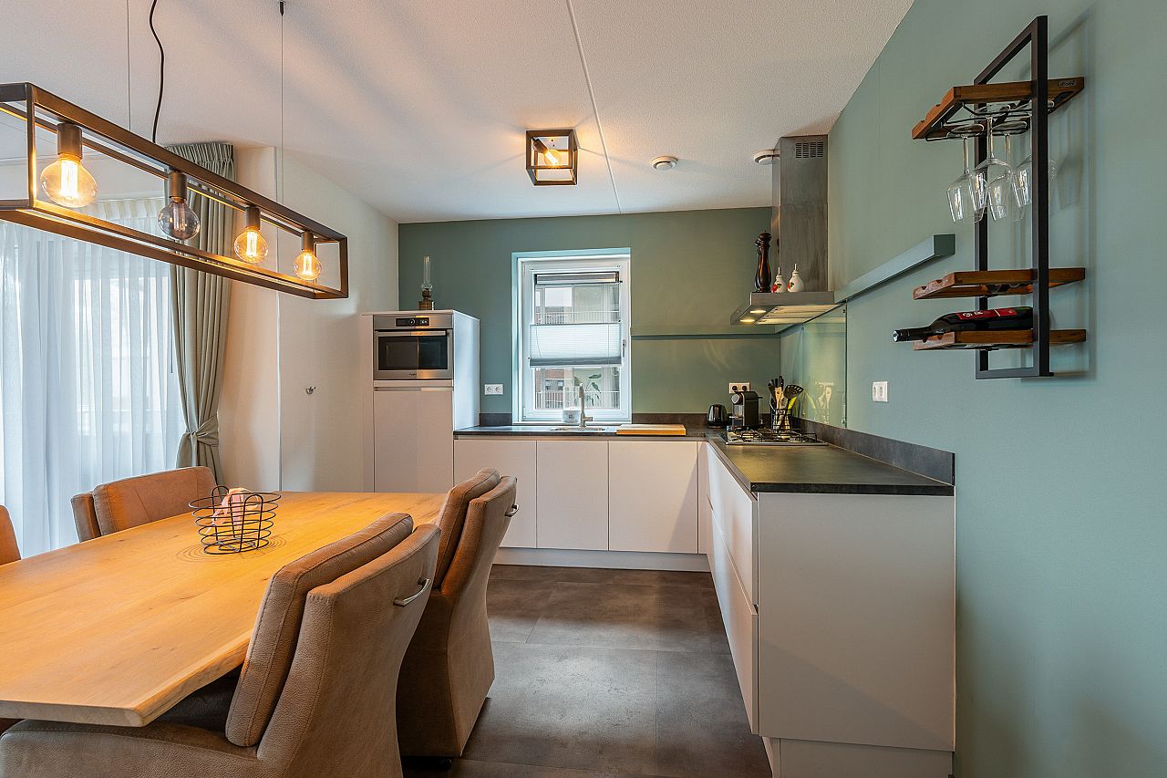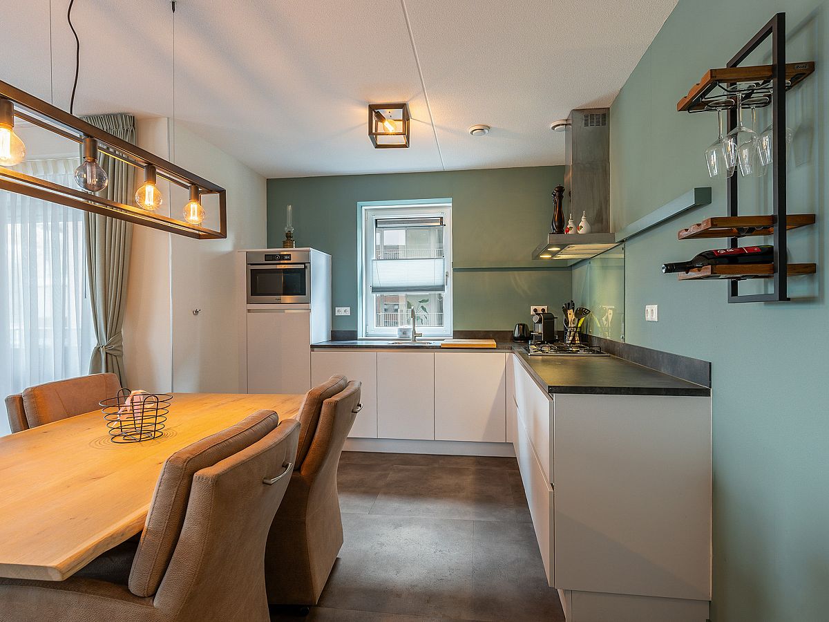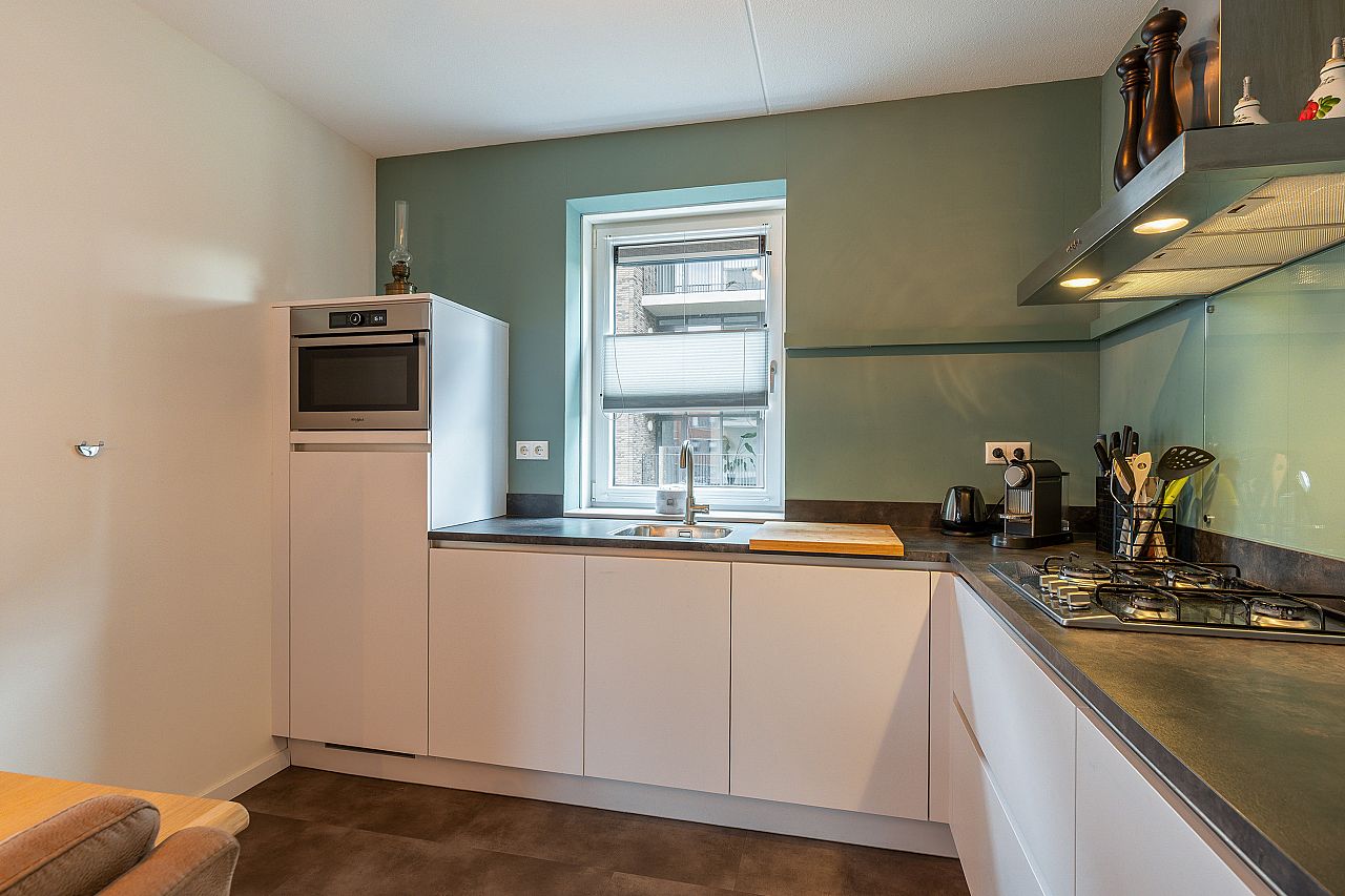 De sfeervolle woonkamer heeft een open, luxe, keuken in hoekopstelling. De keuken heeft lichte fronten, grote lades en is voorzien van de volgende apparatuur: koelkast, vaatwasser, gaskookplaat, afzuigkap en multifunctionele oven met magnetron functie.