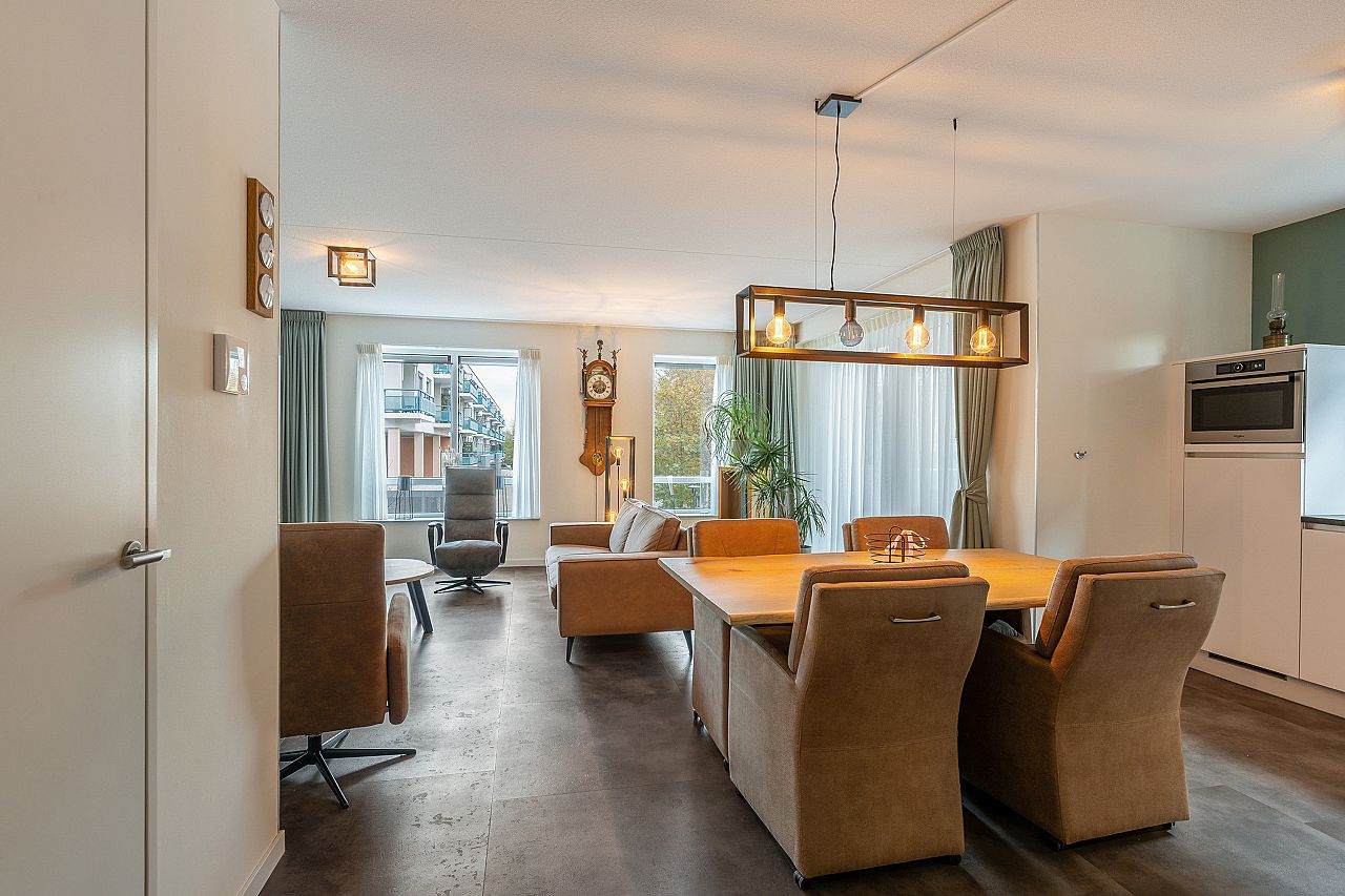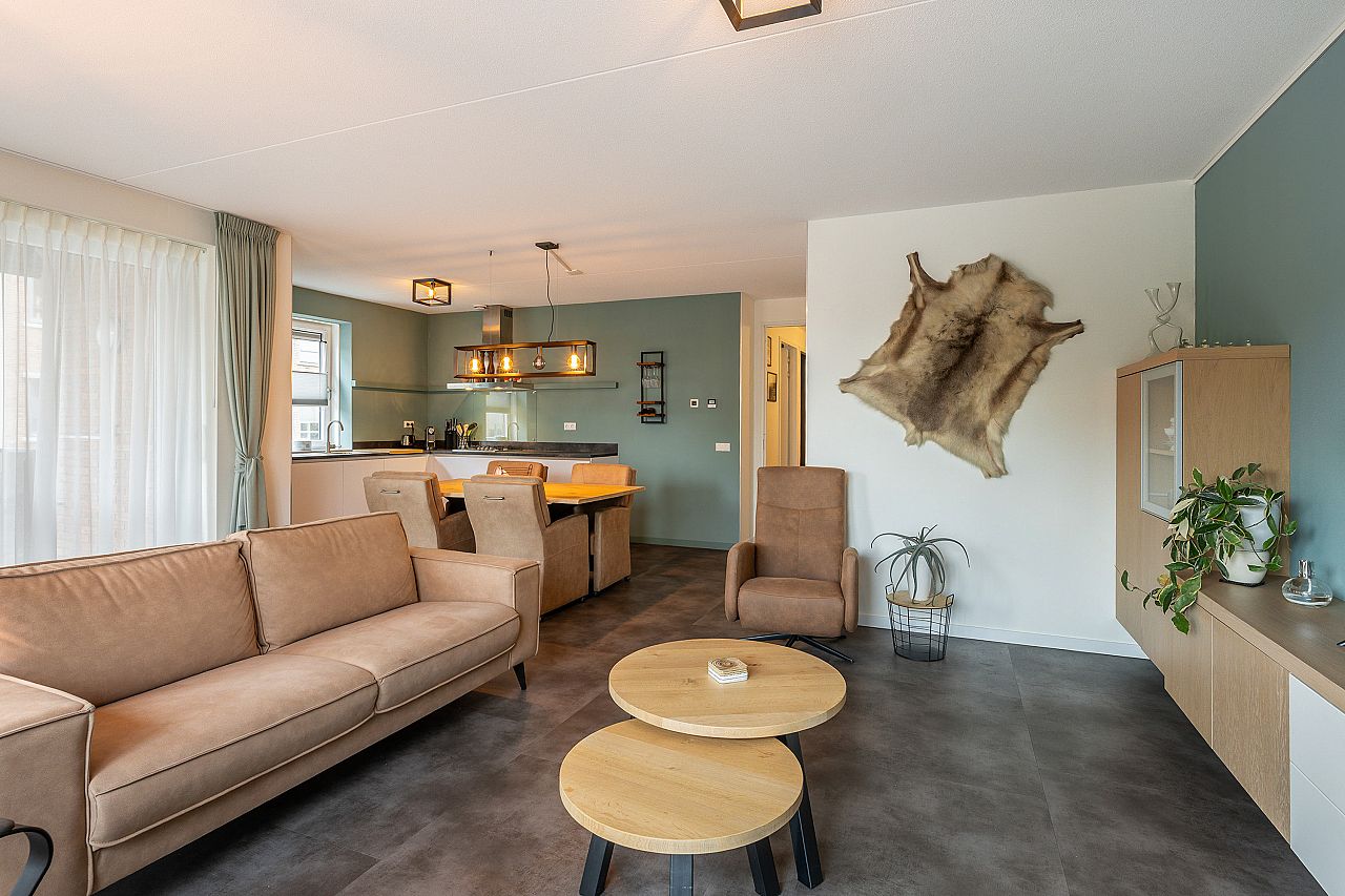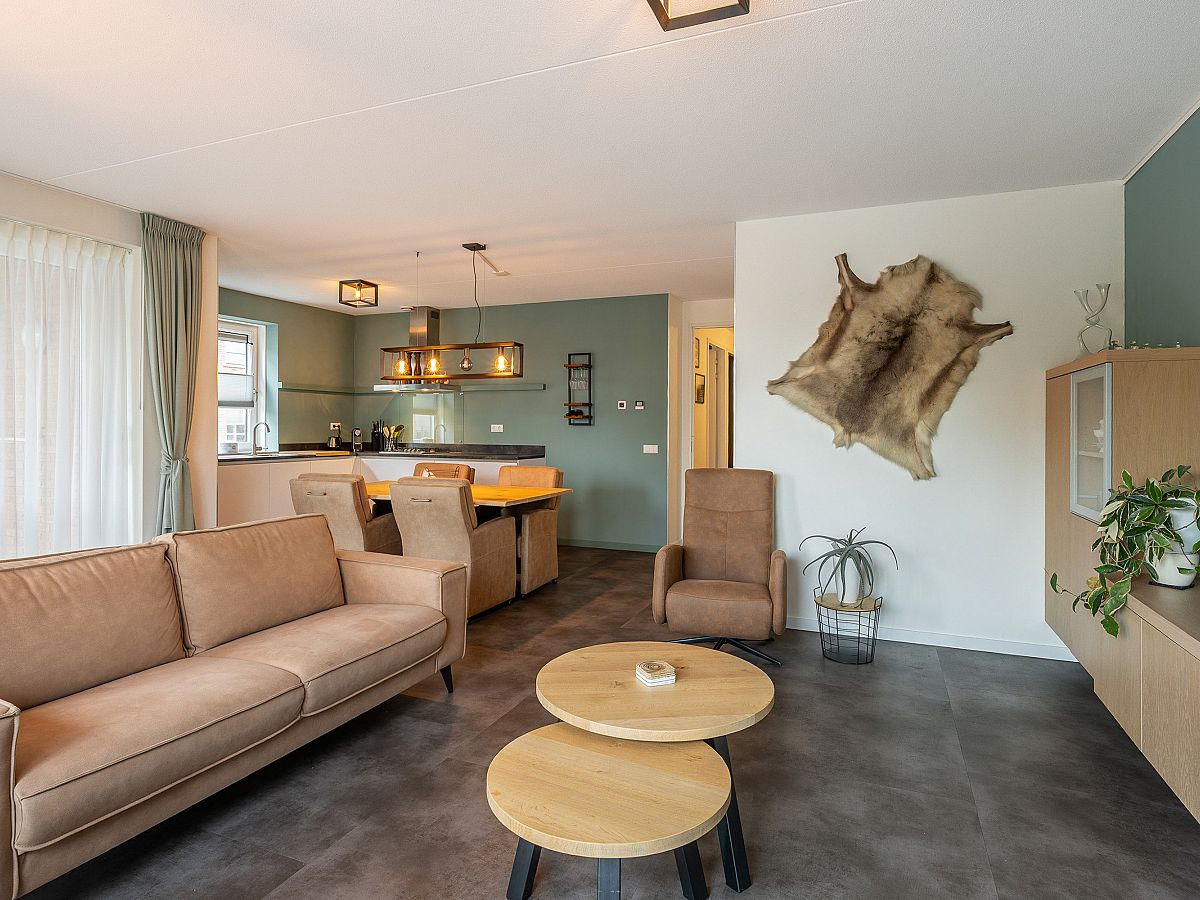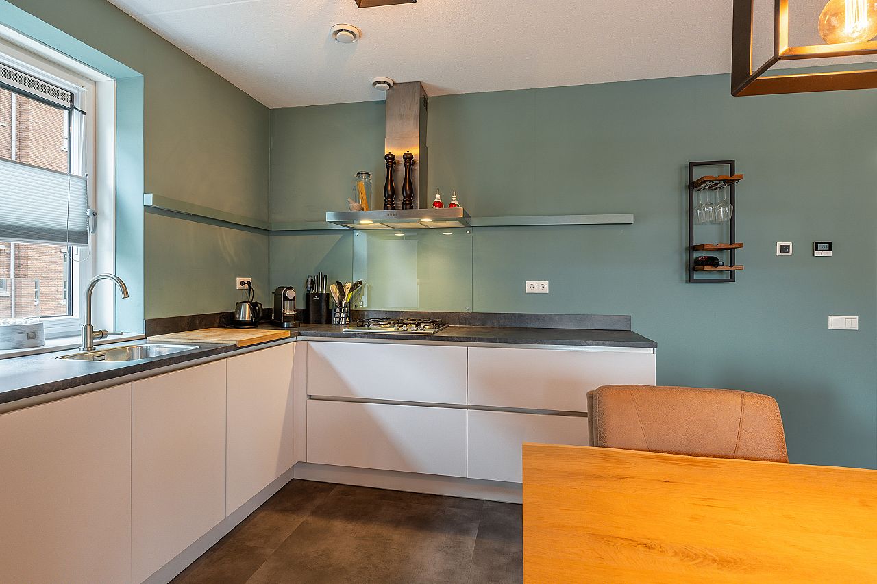De sfeervolle woonkamer heeft een open, luxe, keuken in hoekopstelling. De keuken heeft lichte fronten, grote lades en is voorzien van de volgende apparatuur: koelkast, vaatwasser, gaskookplaat, afzuigkap en multifunctionele oven met magnetron functie.