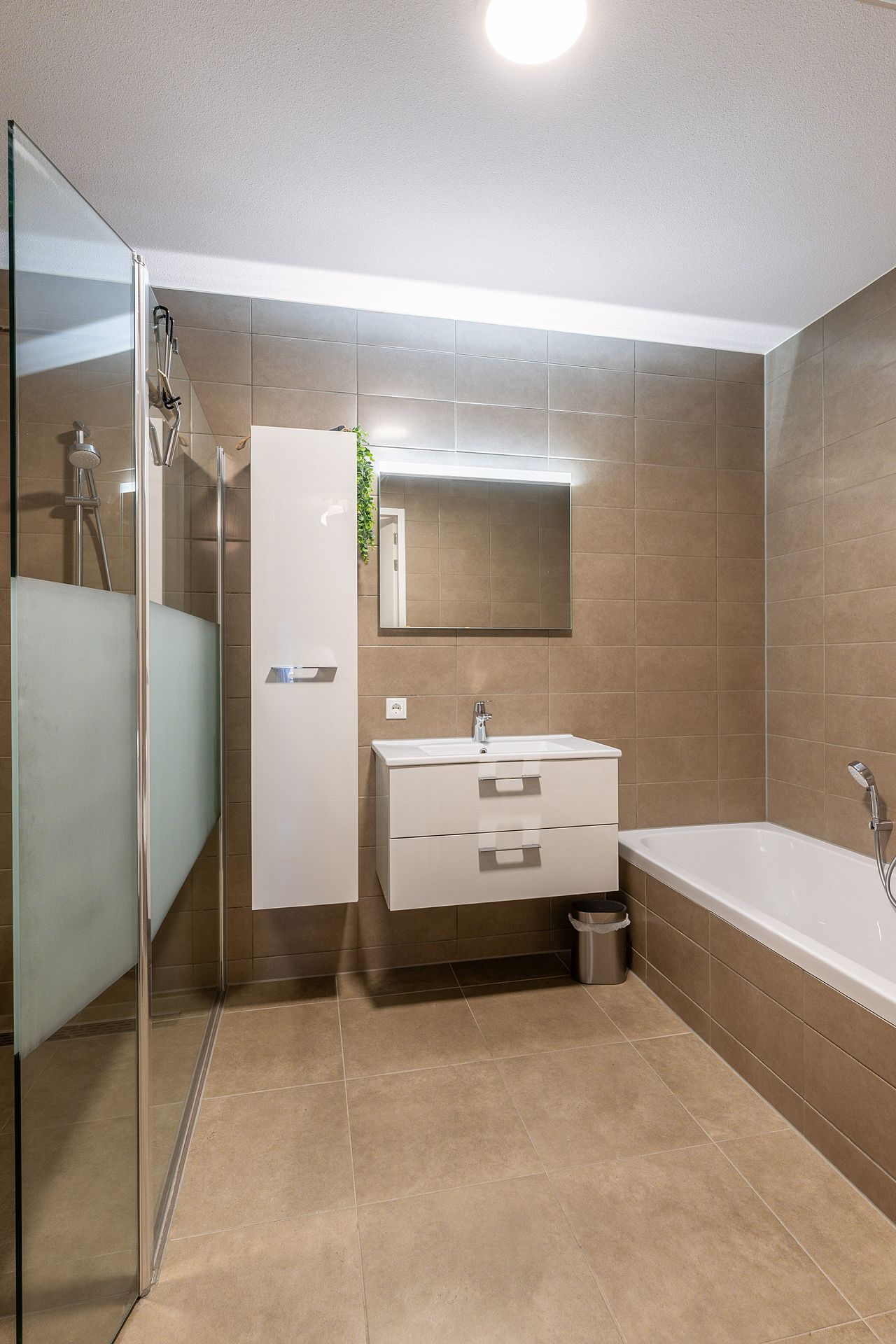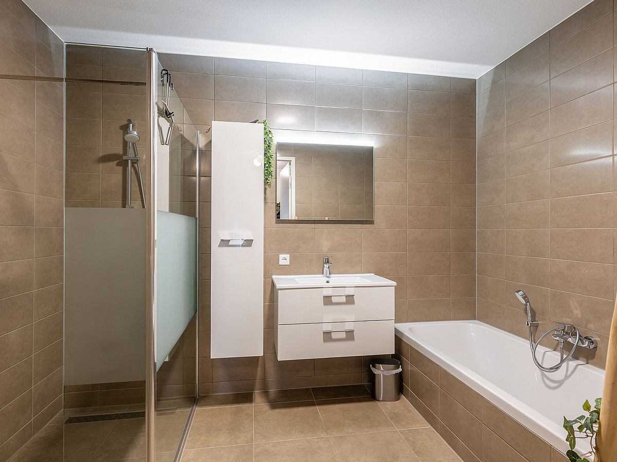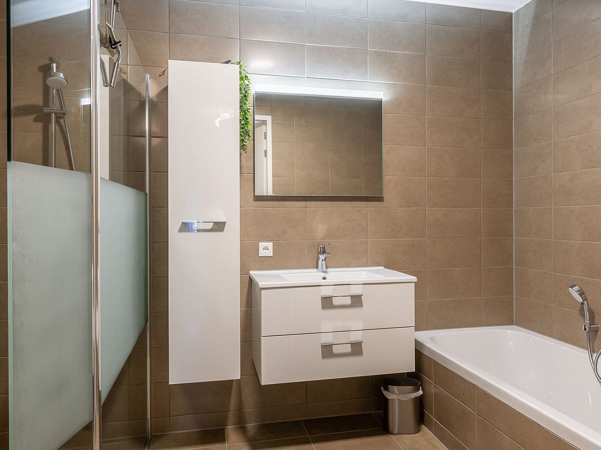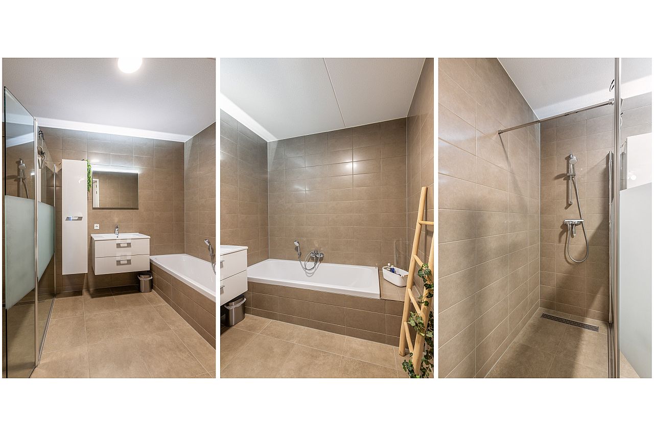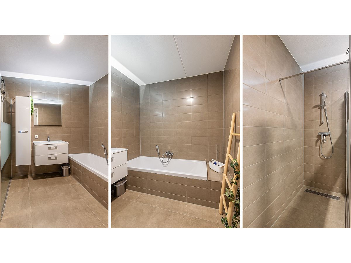 Aan de rechterzijde van de gang is de badkamer gelegen met grote inloop (regen-)douche, ligbad en wastafelmeubel.