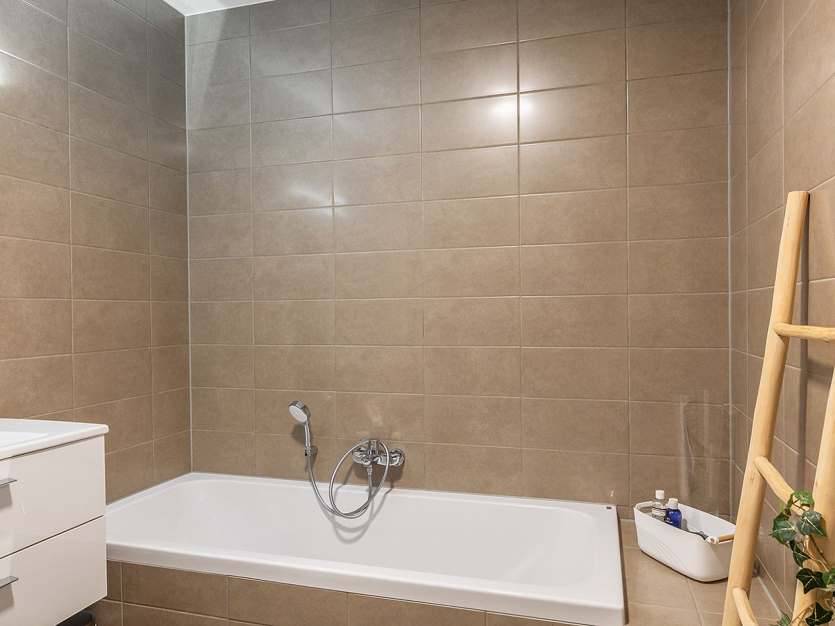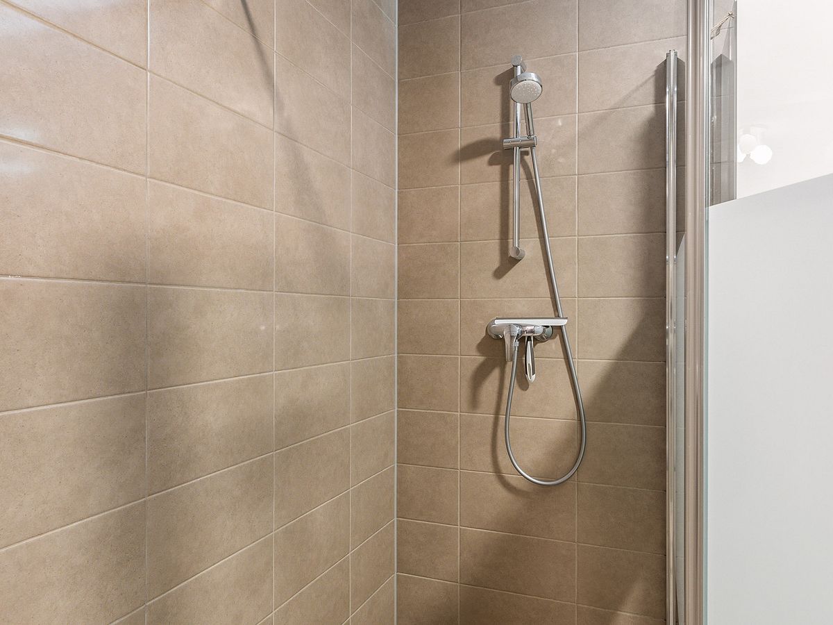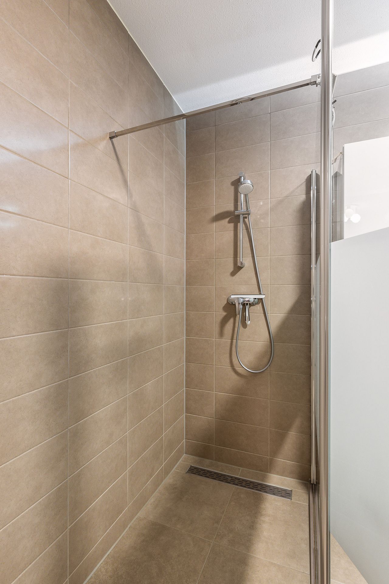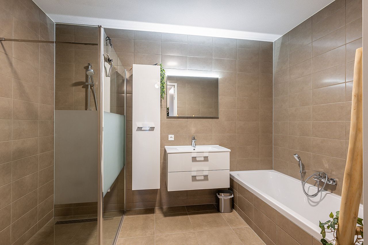 Aan de rechterzijde van de gang is de badkamer gelegen met grote inloop (regen-)douche, ligbad en wastafelmeubel.