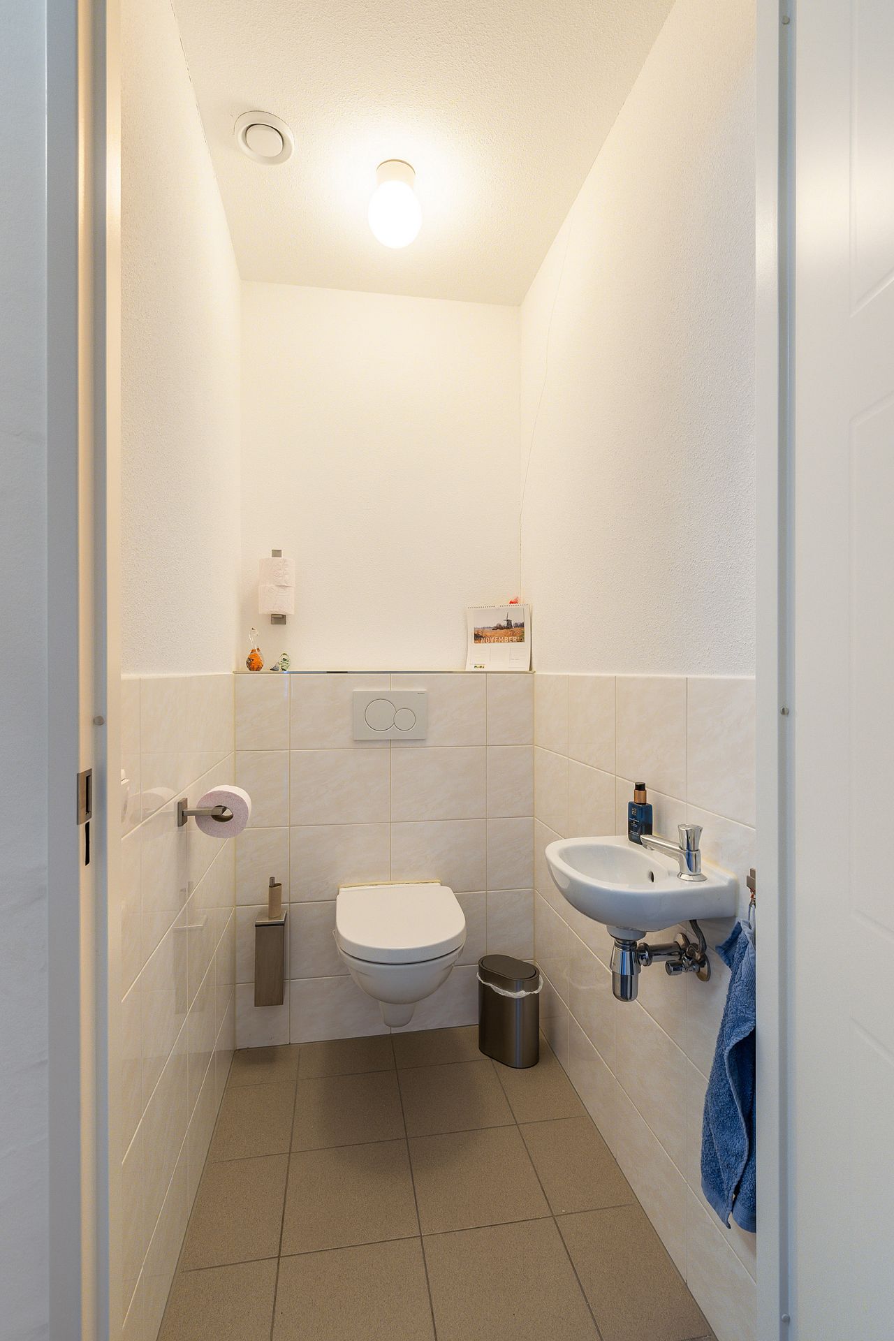 Modern betegelde toiletruimte met zwevend toilet en fonteintje.