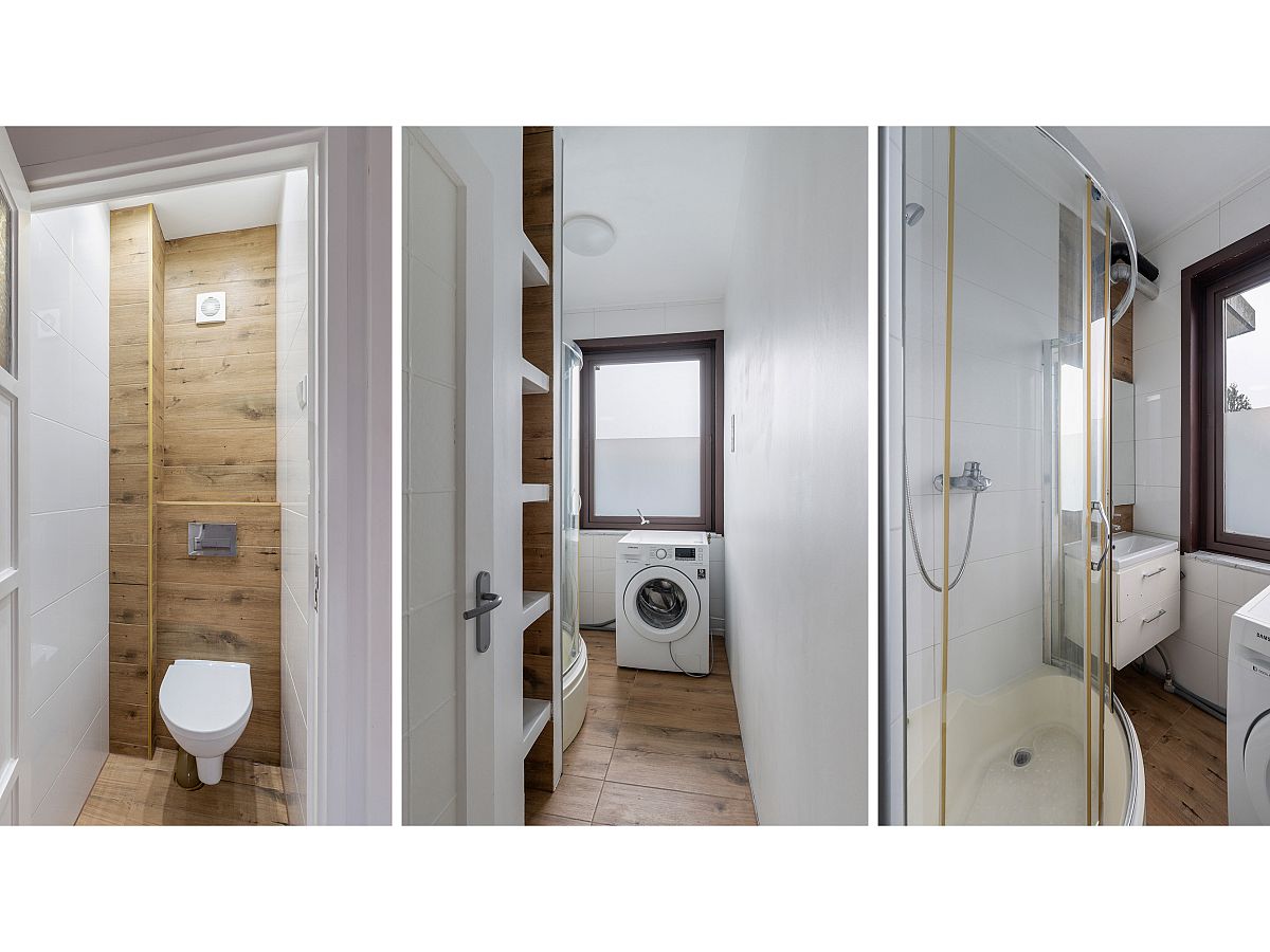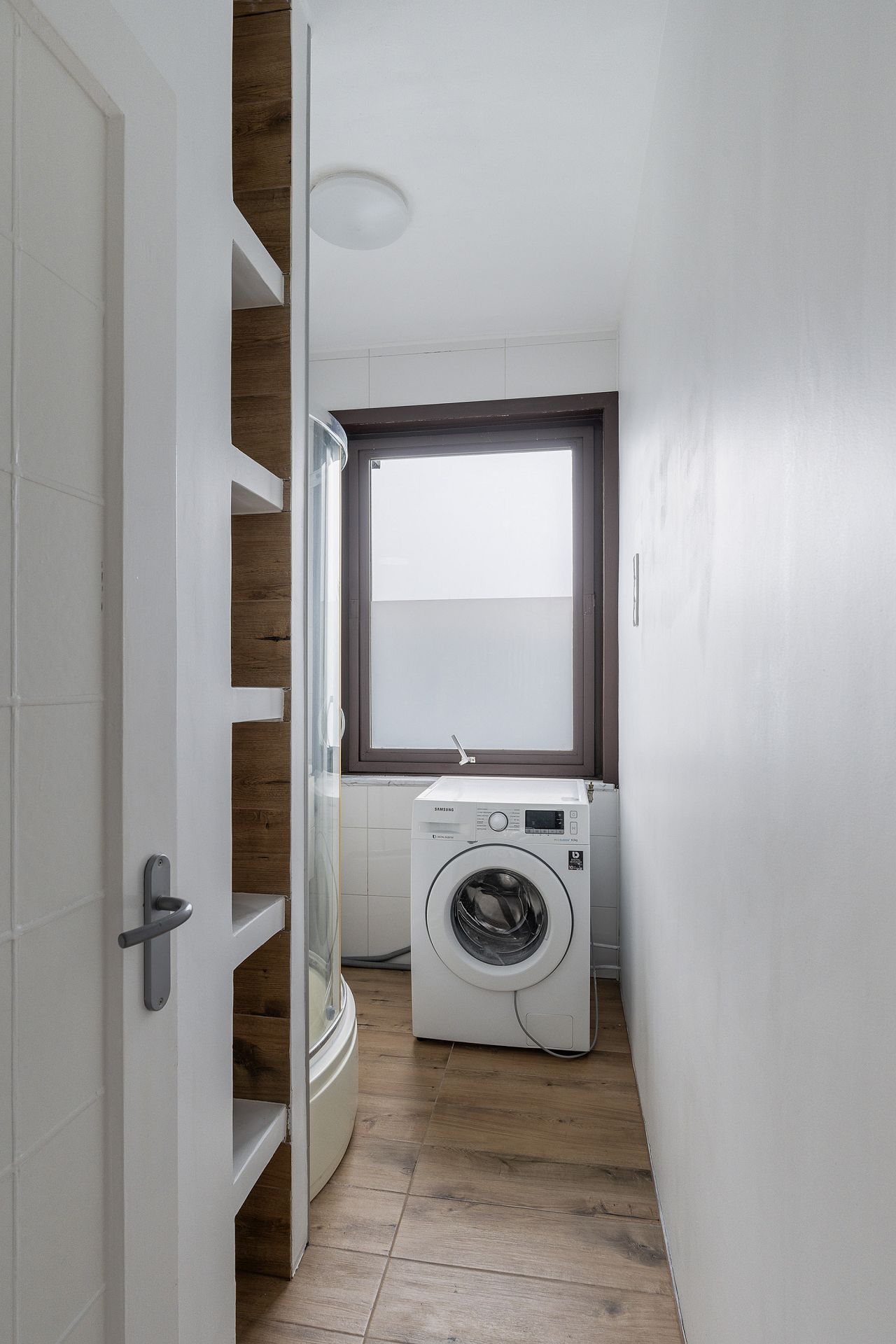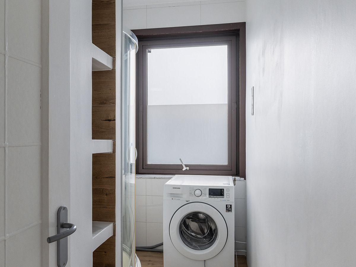 Badkamer met aansluiting voor de wasmachine (wasmachine blijft achter), wastafelmeubel en douchecabine.