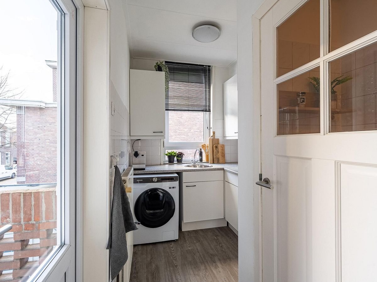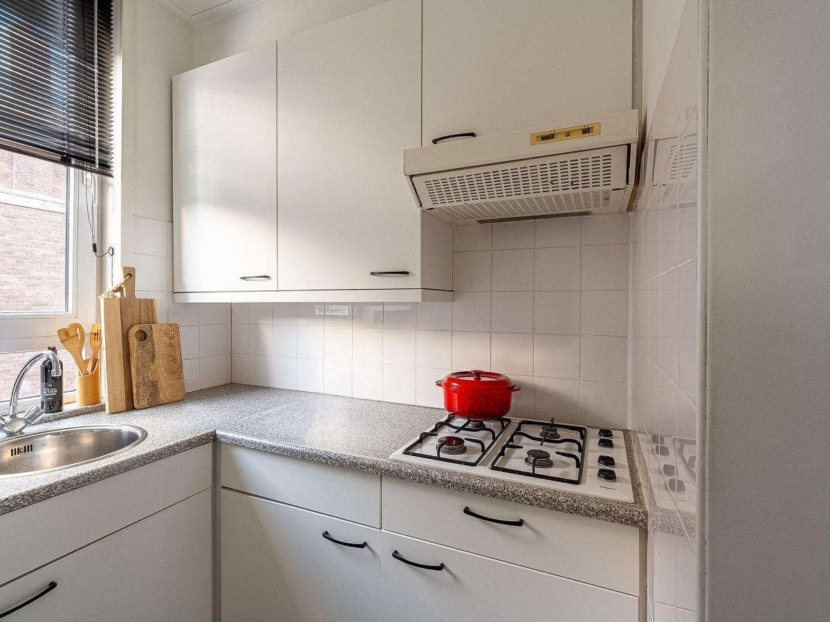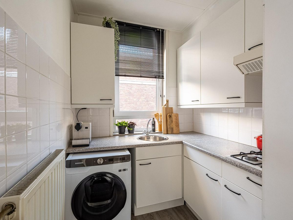 De keuken heeft een witte frontinrichting en is voorzien van koelkast, gaskookplaat, afzuigkap en aansluiting voor de wasmachine. Deur naar het achtergelegen balkon (west).